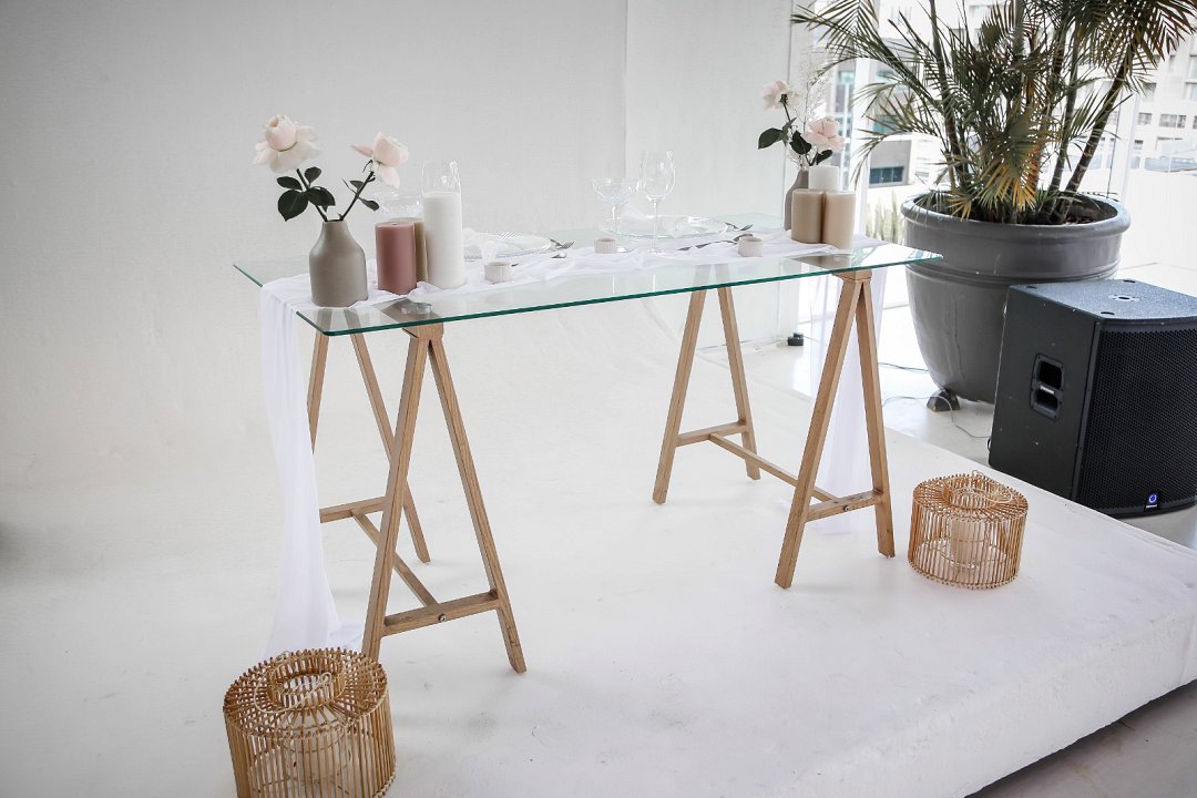 Hierdie moderne glaskas onthaal lokaal met die mooiste uitsigte was versier met moderne dekor elemente. Pragtige sagte neutrale kleur skakerings blom ontwerpe kan op die gaste tafels gesien word. ʼn Tafel loper wat geriffel is het daardie dromerige gevoel aan die tafels gegee. Kerse in skakerings van sagte aardse kleure het ʼn romantiese atmosfeer in die onthaal lokaal geskep. Die bruidstafel was ʼn glas tafel wat ook aandag trek na die paartjie se tafel toe en inpas by die moderne tema.