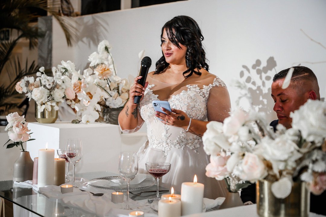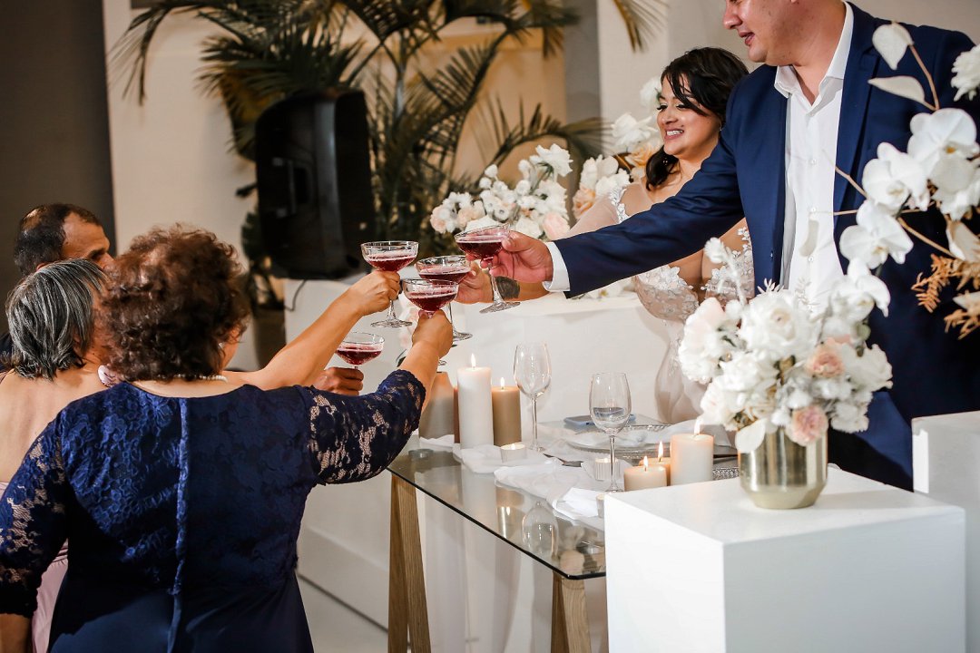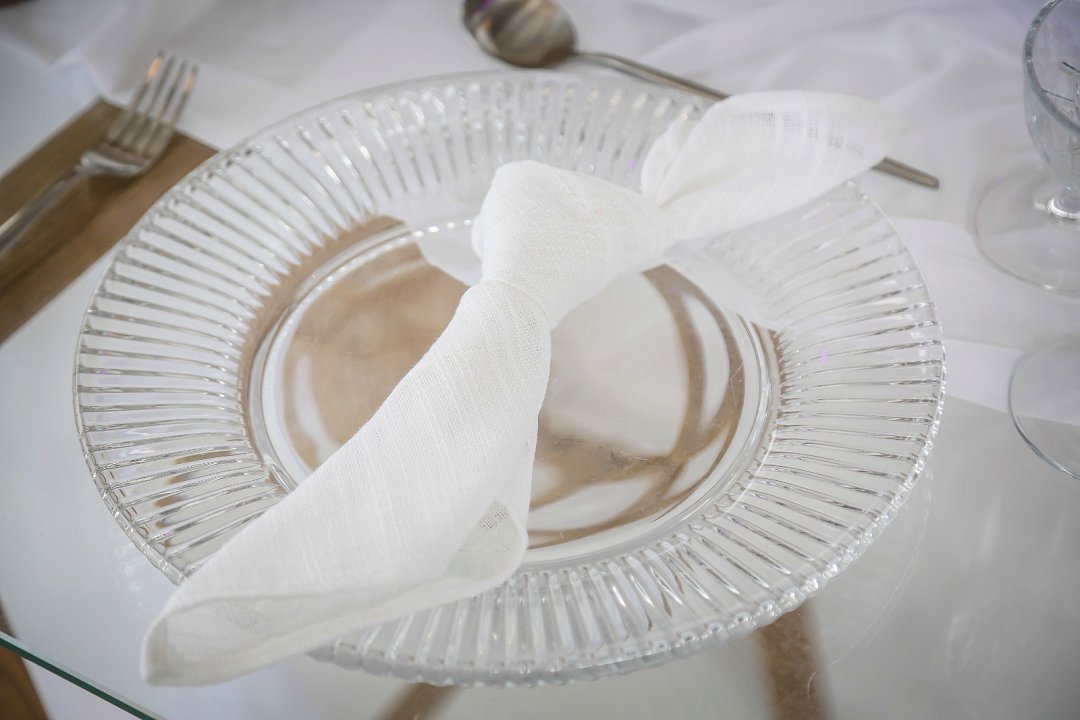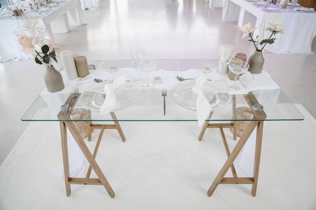 Ons het gegaan met silwer eetgerei, glas onder borde. Op dit was die wit tekstuur servette en macaron gaste geskenkies, ʼn wyn glas, coupe sjampanje glase en wit tiffany stoele. Voor by die alter was daar die pragtigste blomme rangskikkings gewees wat later by die onthaal ingedra was en langs ons glas tafel geplaas was.