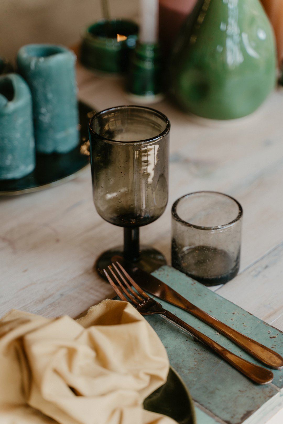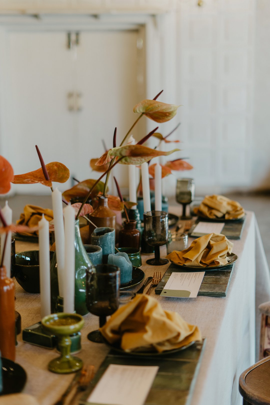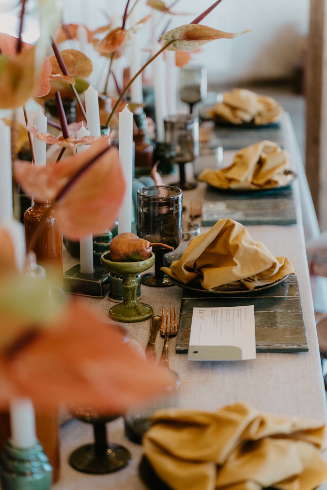 Dekor elemente was gestileer om in te pas by die rou aardse tema van die gestileerde fotosessie. Die hout tafel was versier met pragtige diep aardse kleure insluitende skakerings van groene, tikseltjies mosterd geel en skakerings aardse kleure.