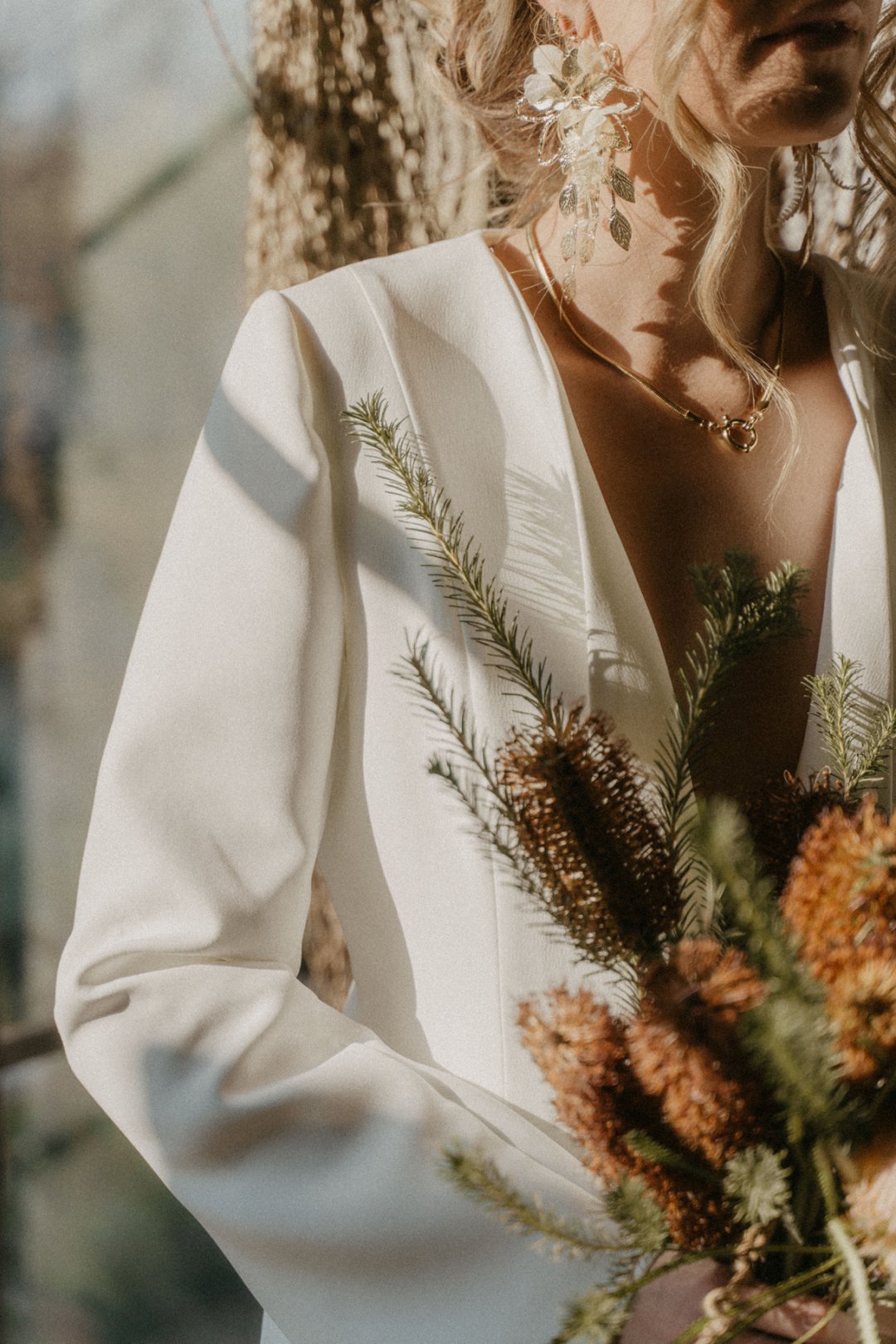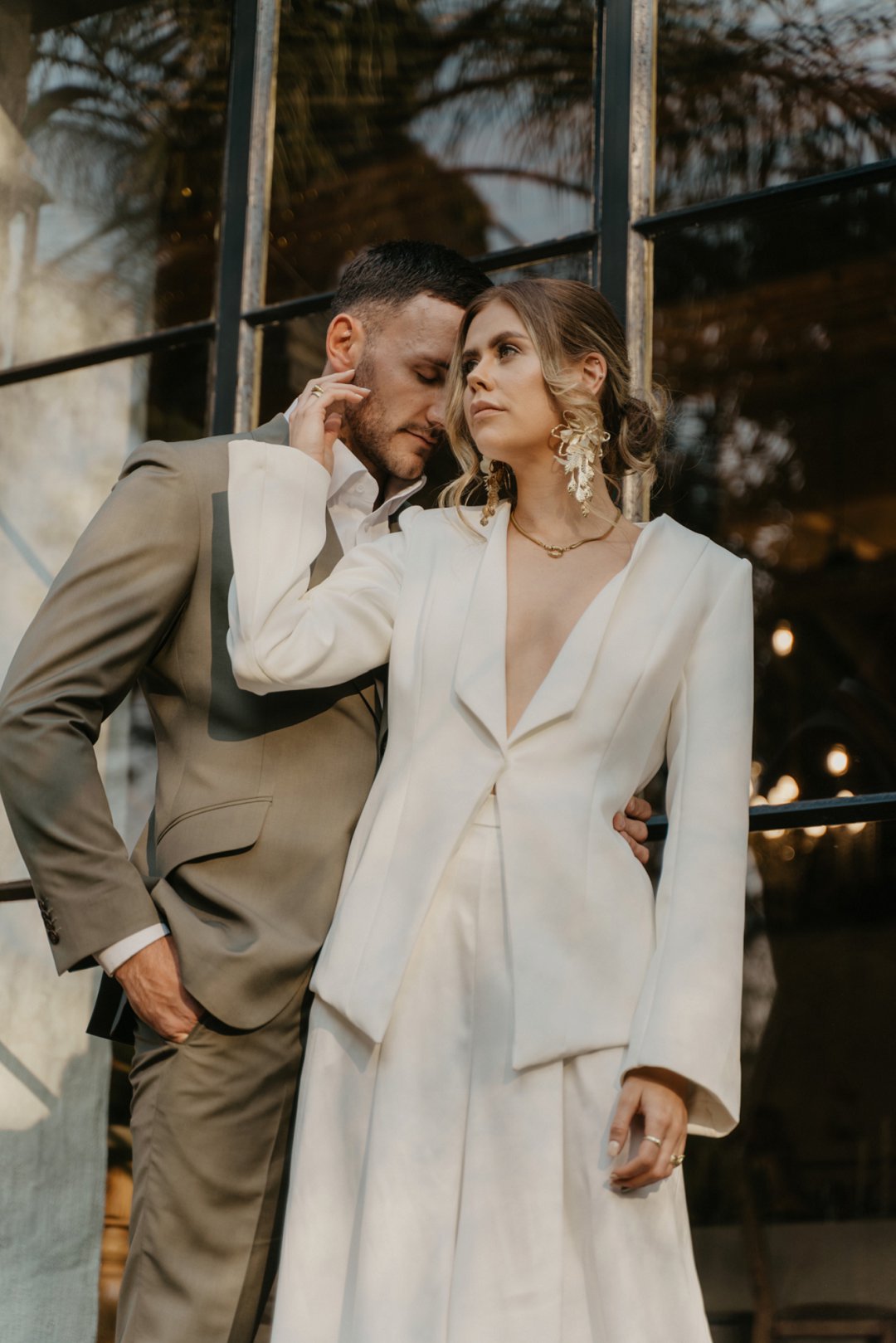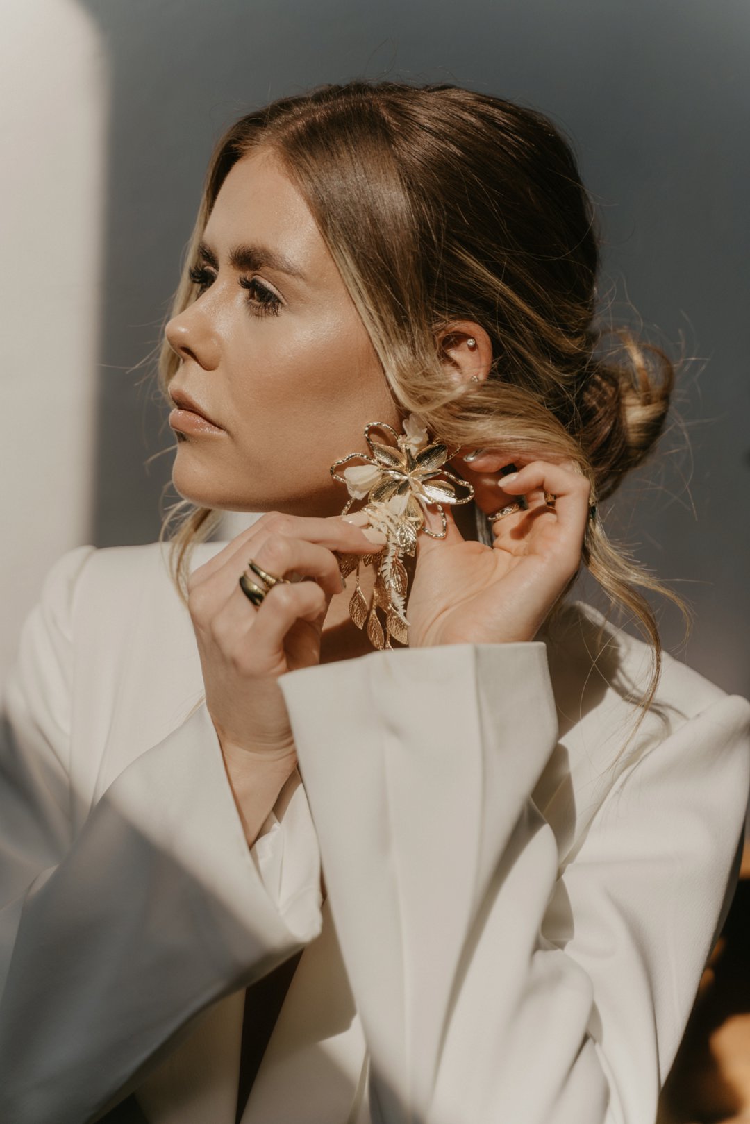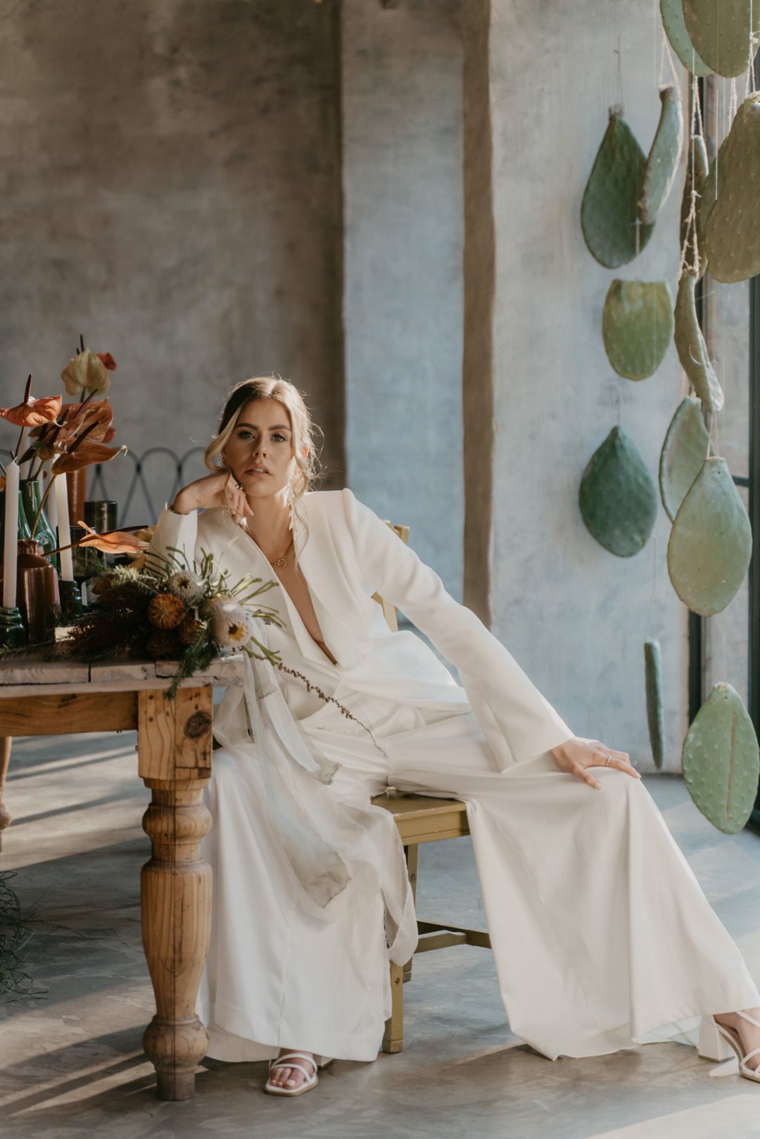 Ons is mal oor die model se trou-pakkie wat sy aangehad het, ʼn broek in plaas van ʼn trourok. Dit het ʼn elegante voorkoms, maar is ook iets heeltemal buiten gewoon. Dit is definitief ʼn kontemporêre stempel tot die stylvolle aarde trou inspirasie fotosessie.