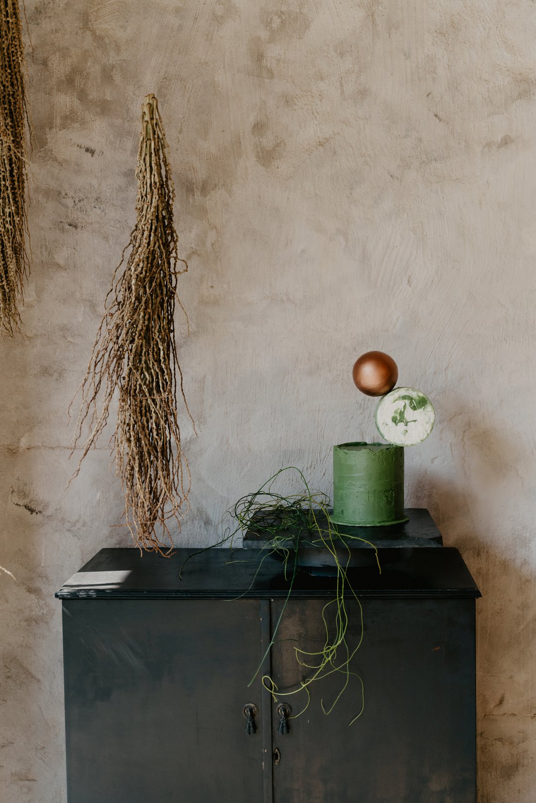 ʼn Kontras van rou, natuurlike materiale soos hout, klip, en gedroogde plante, versterk die gevoel van grond en organiese verbondenheid.