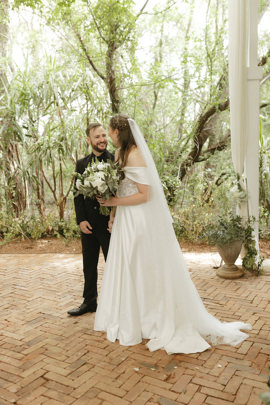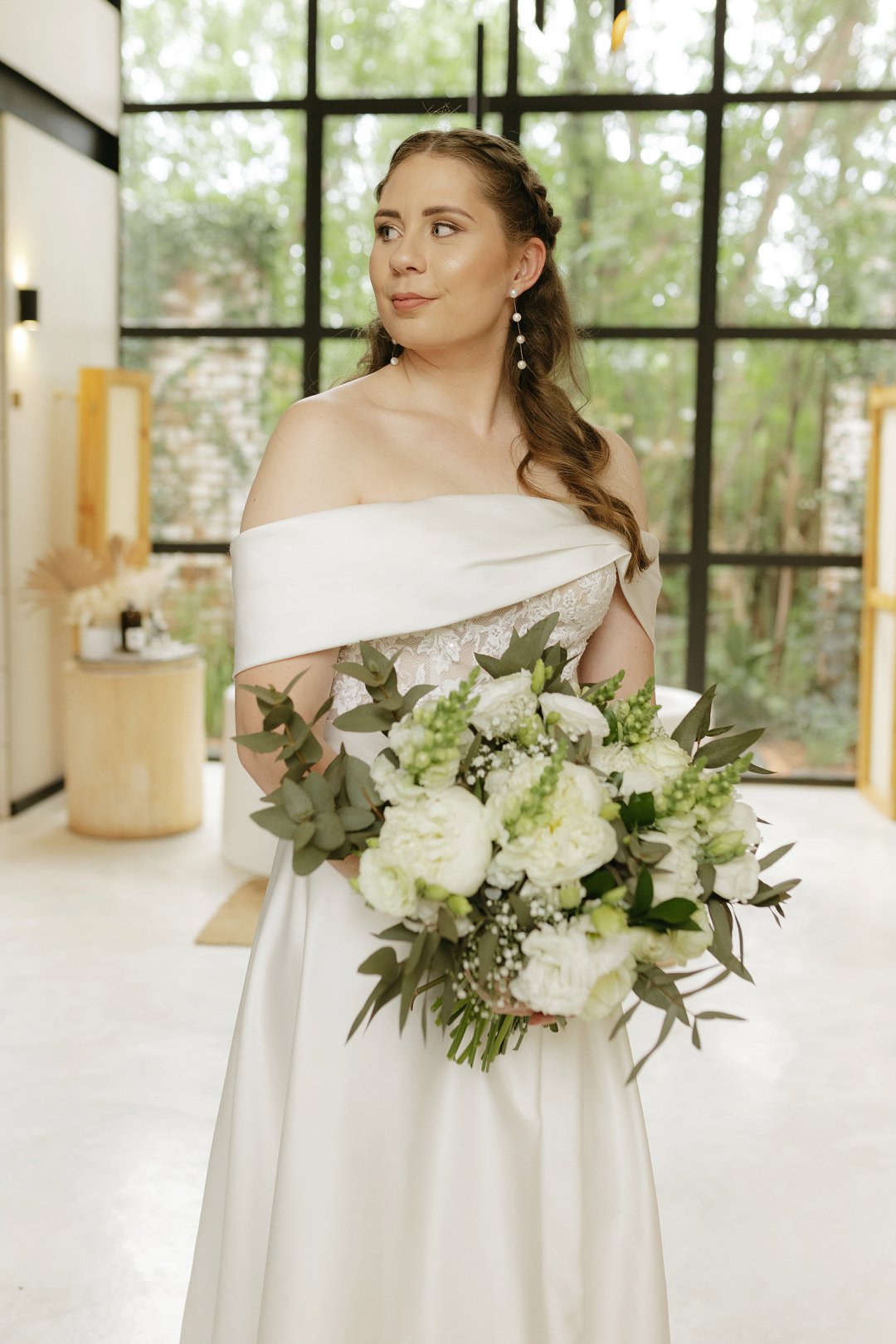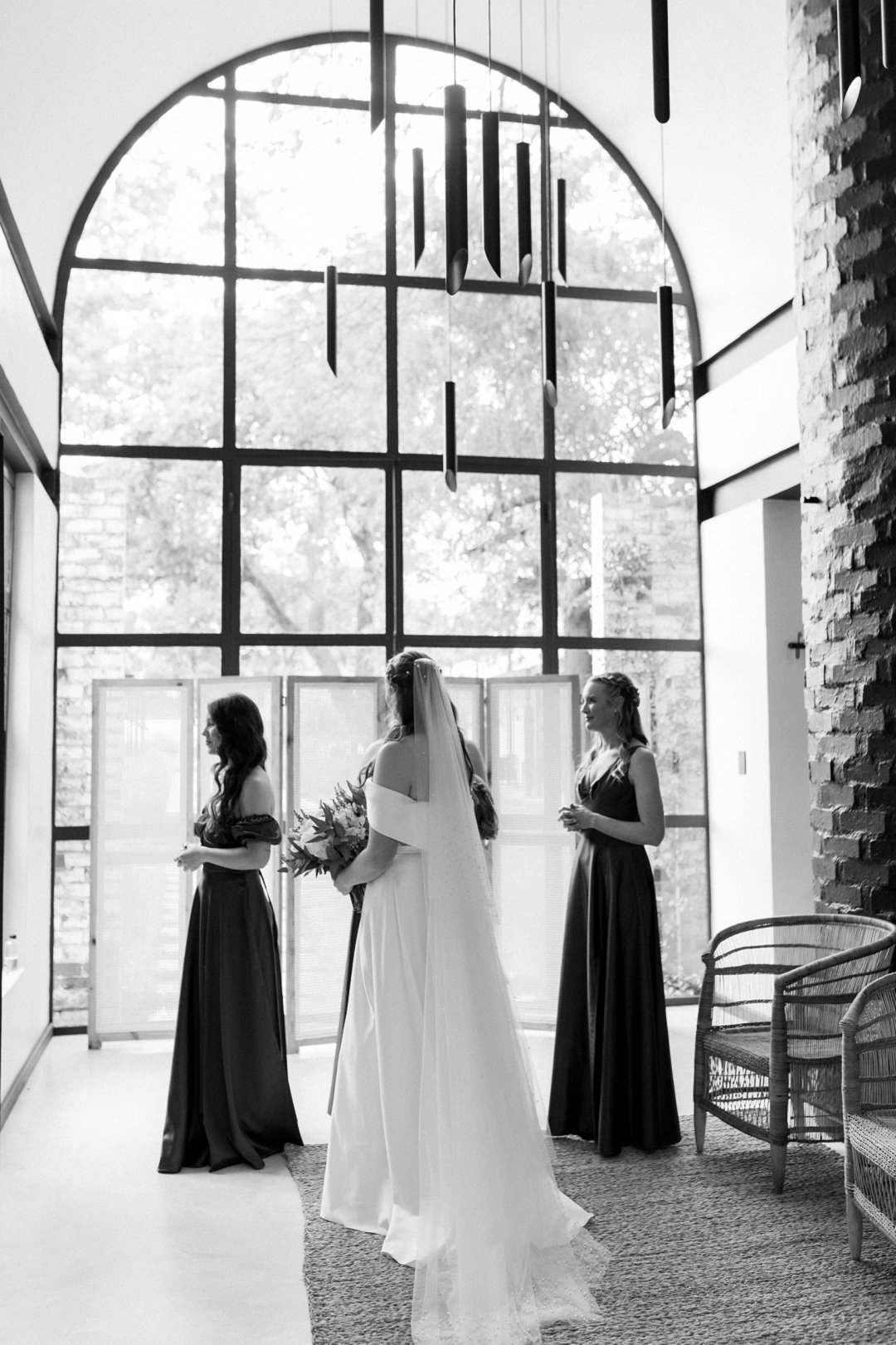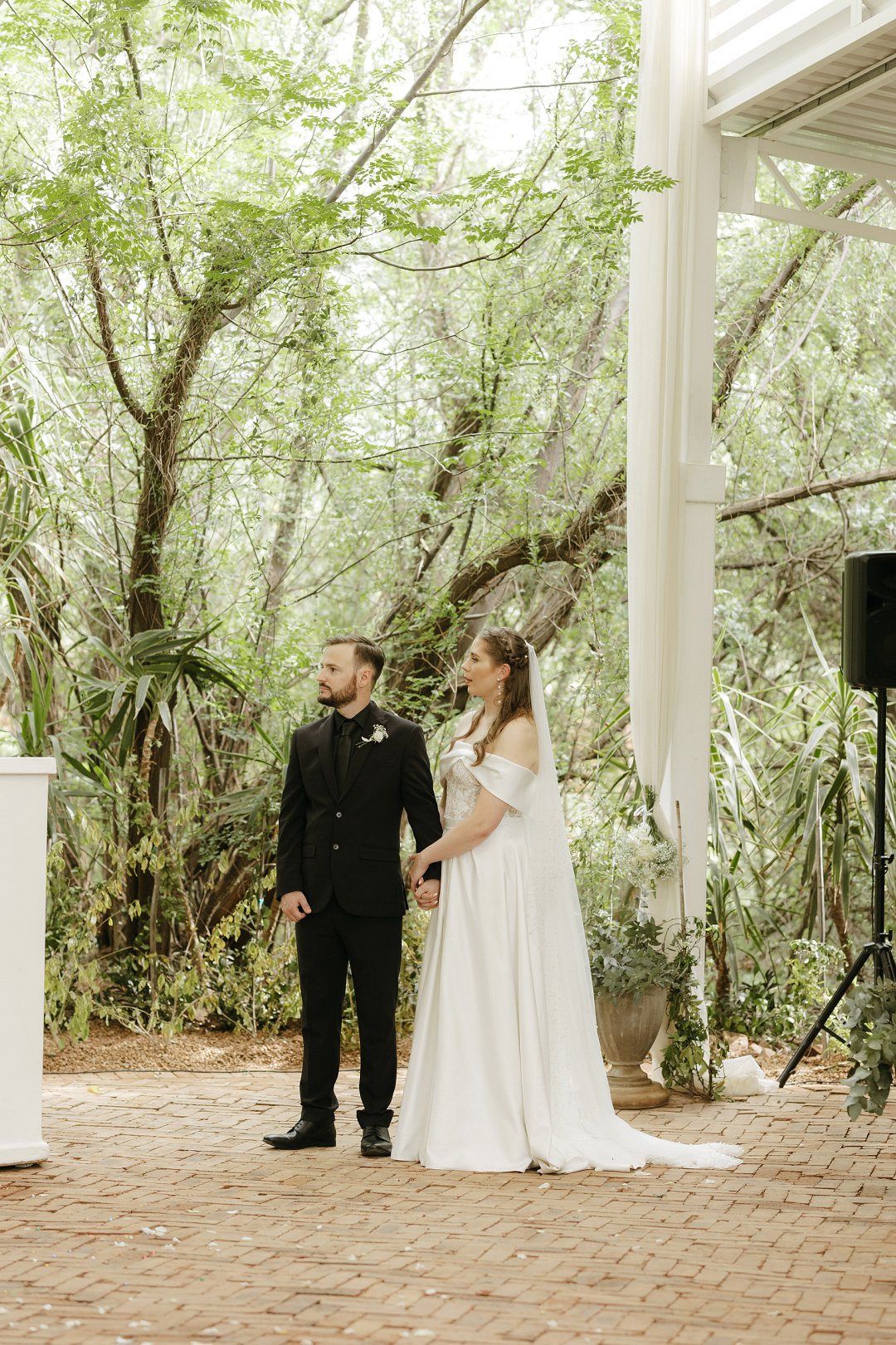 Hul seremonie het plaasgevind in ʼn semi-oop kapel, omring deur die rustigheid van die natuur se groenigheid. Die pragtige eenvoud van die swart en wit kleurskema het ʼn moderne en elegante atmosfeer geskep. Die talentvolle span van Belle Doux het die paartjie se droom dekor en blom ontwerpe tot lewe gebring.