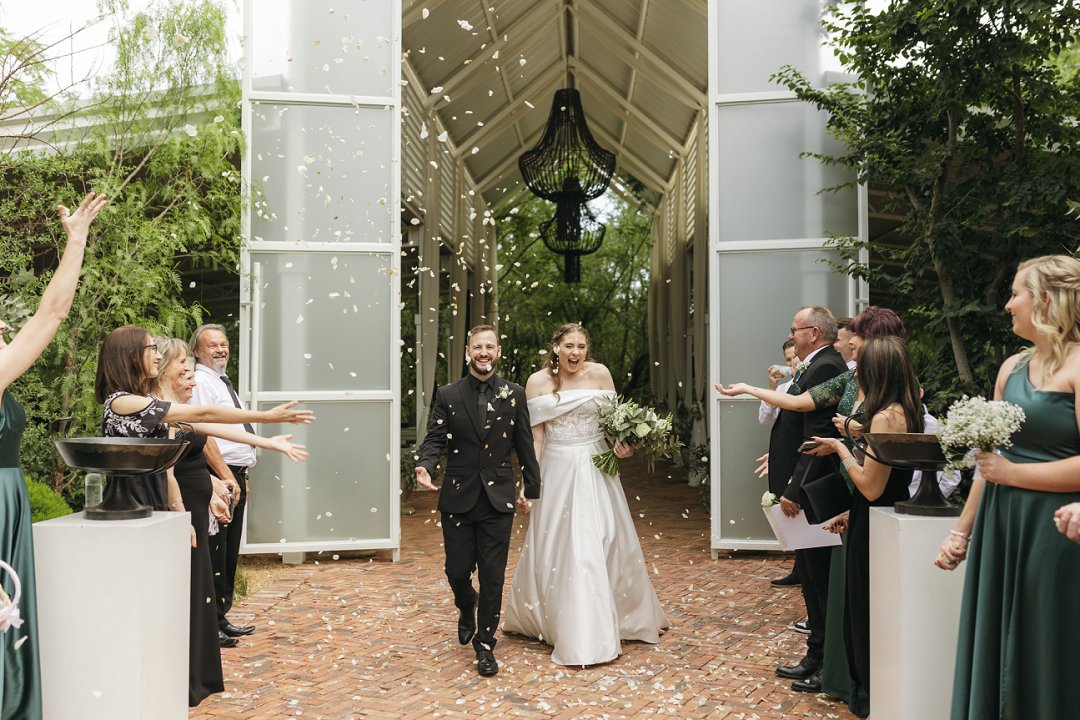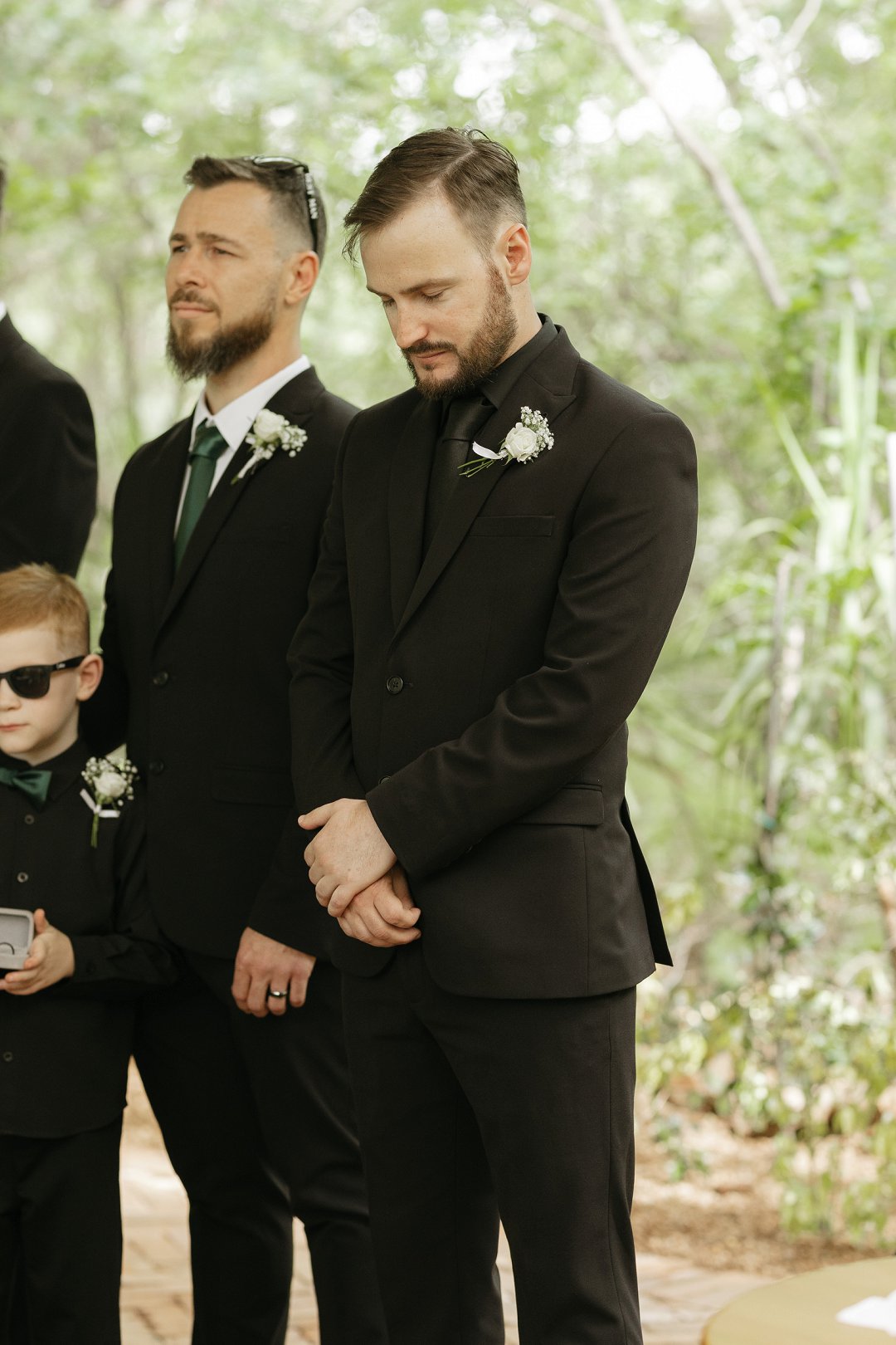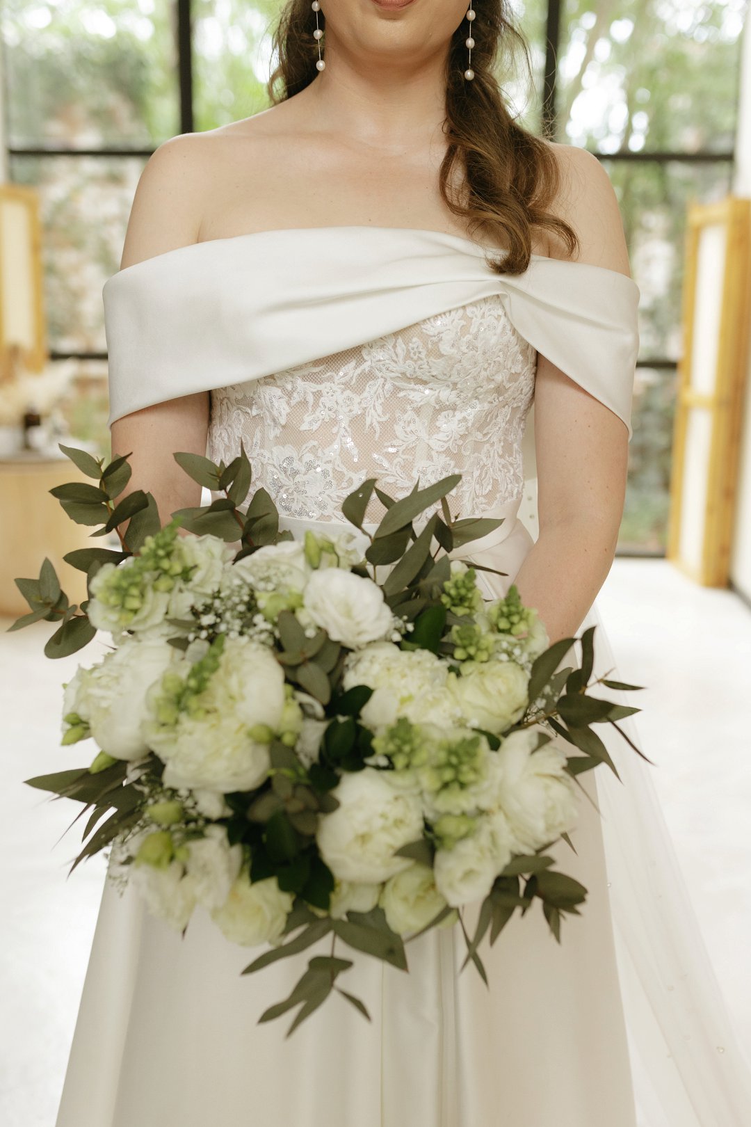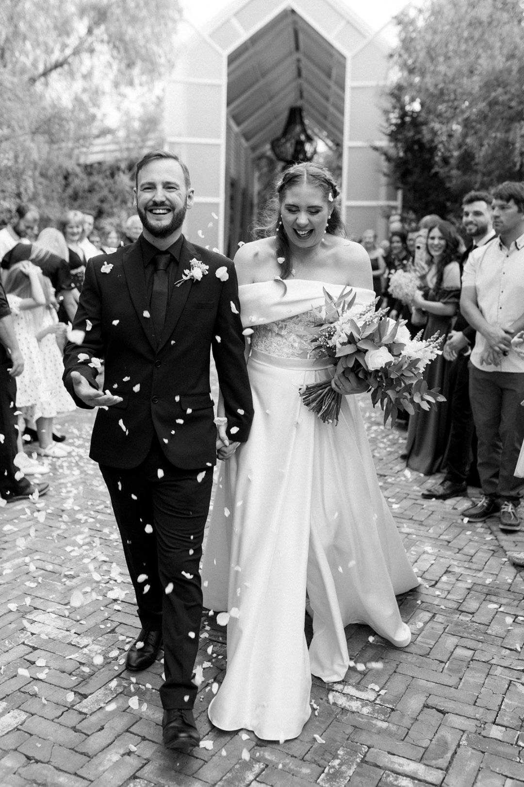Hul seremonie het plaasgevind in ʼn semi-oop kapel, omring deur die rustigheid van die natuur se groenigheid. Die pragtige eenvoud van die swart en wit kleurskema het ʼn moderne en elegante atmosfeer geskep. Die talentvolle span van Belle Doux het die paartjie se droom dekor en blom ontwerpe tot lewe gebring.