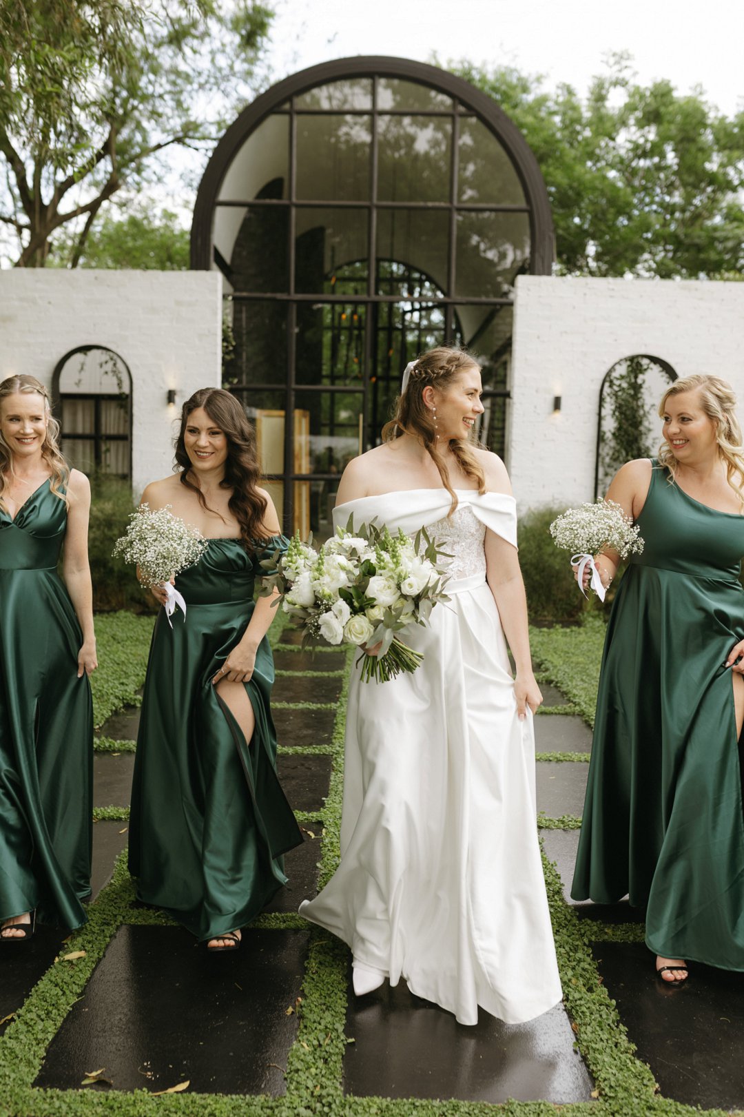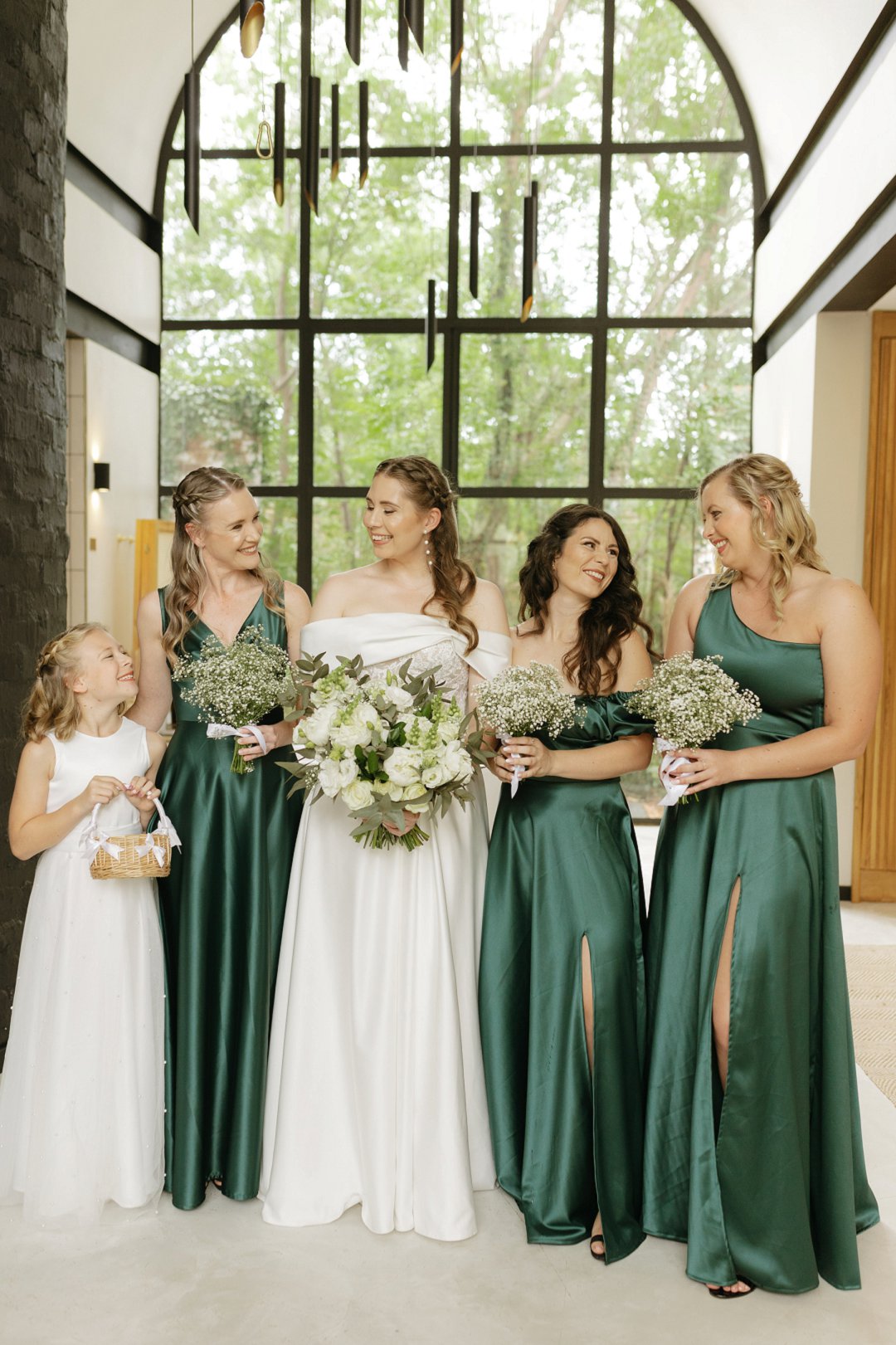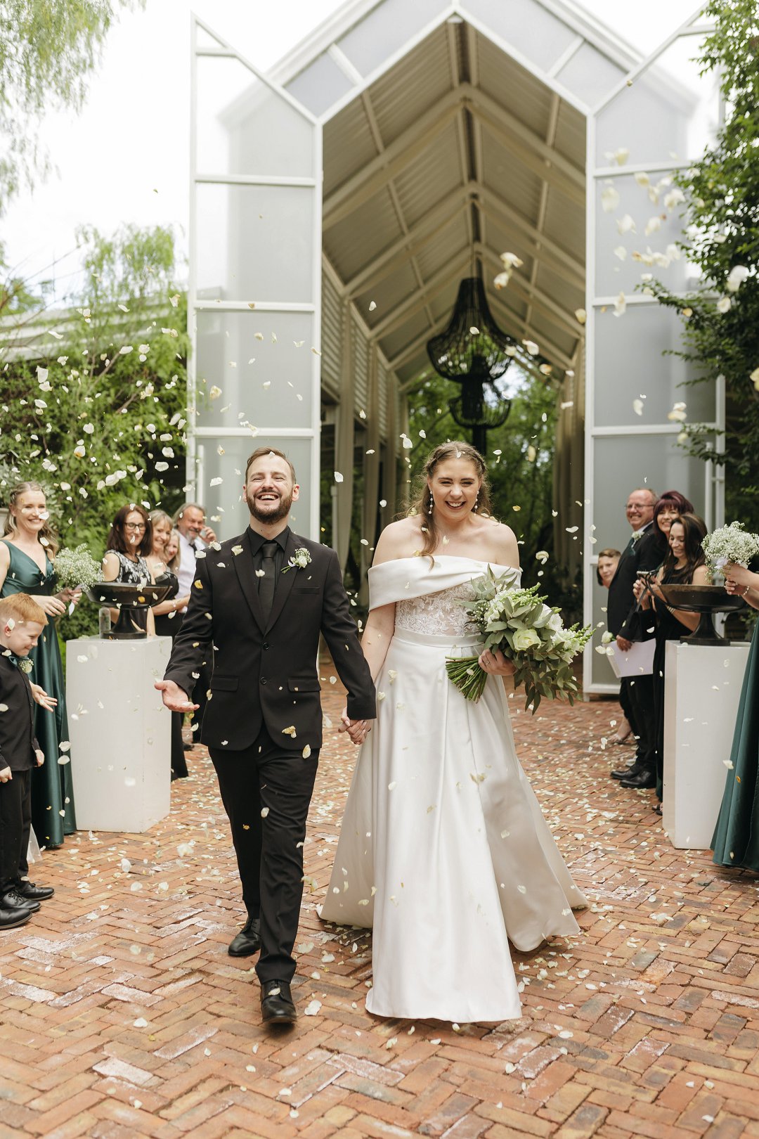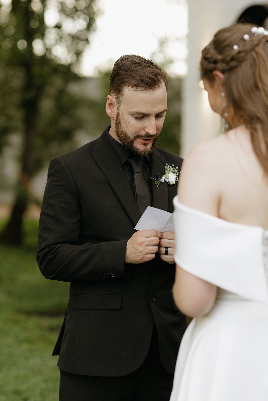 Hul seremonie het plaasgevind in ʼn semi-oop kapel, omring deur die rustigheid van die natuur se groenigheid. Die pragtige eenvoud van die swart en wit kleurskema het ʼn moderne en elegante atmosfeer geskep. Die talentvolle span van Belle Doux het die paartjie se droom dekor en blom ontwerpe tot lewe gebring.