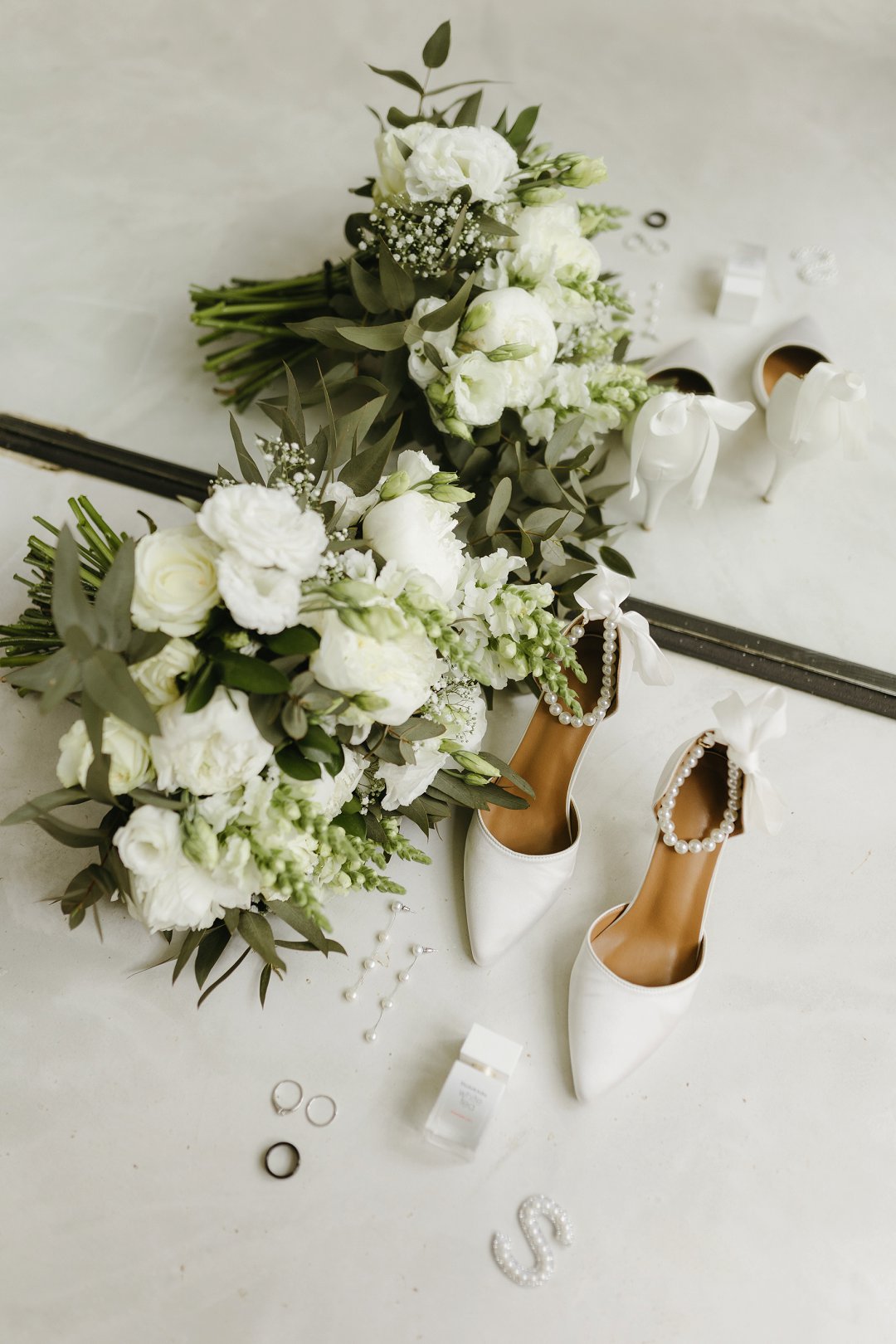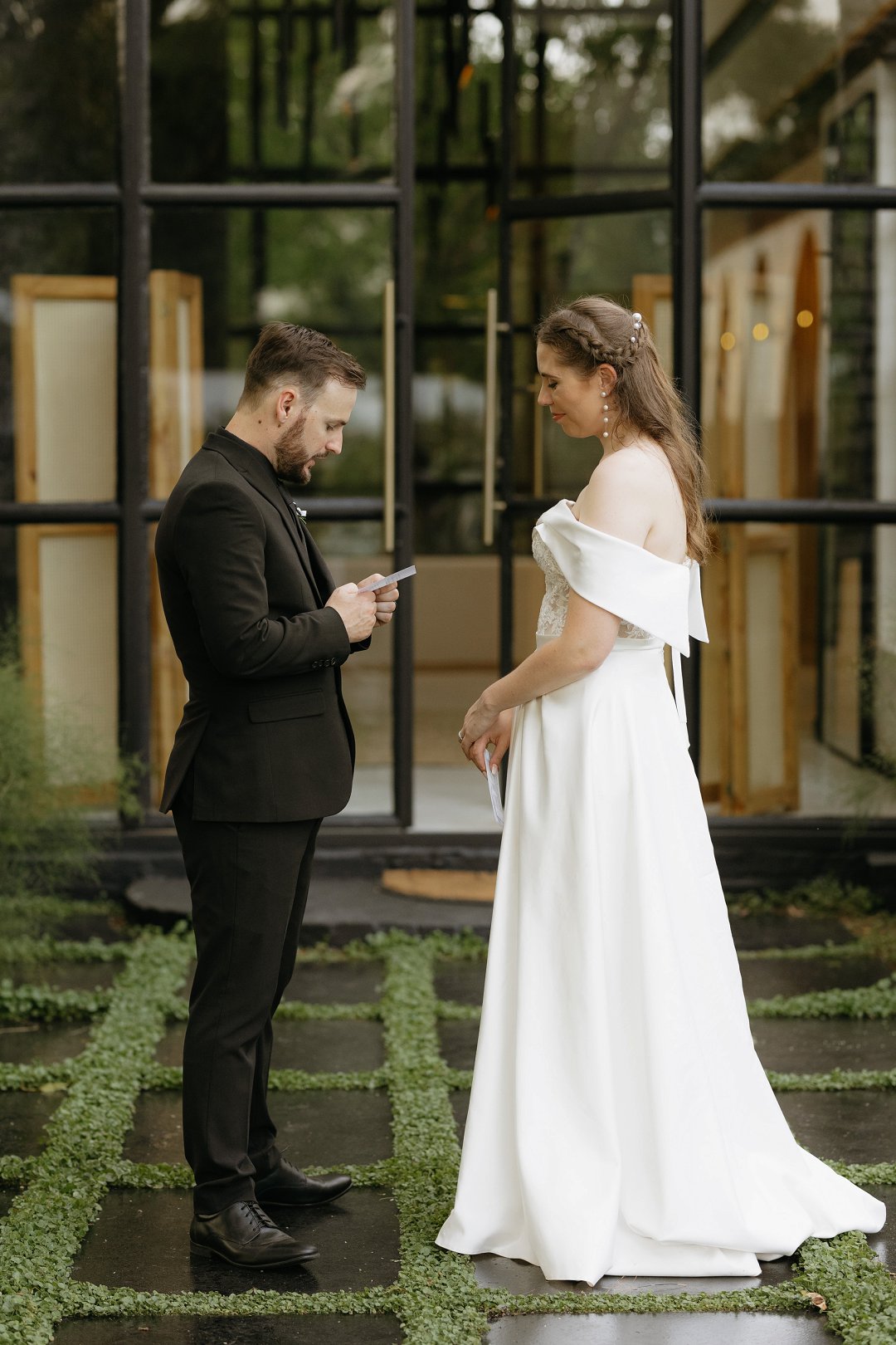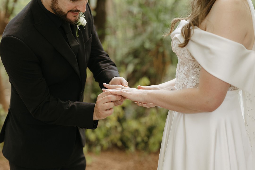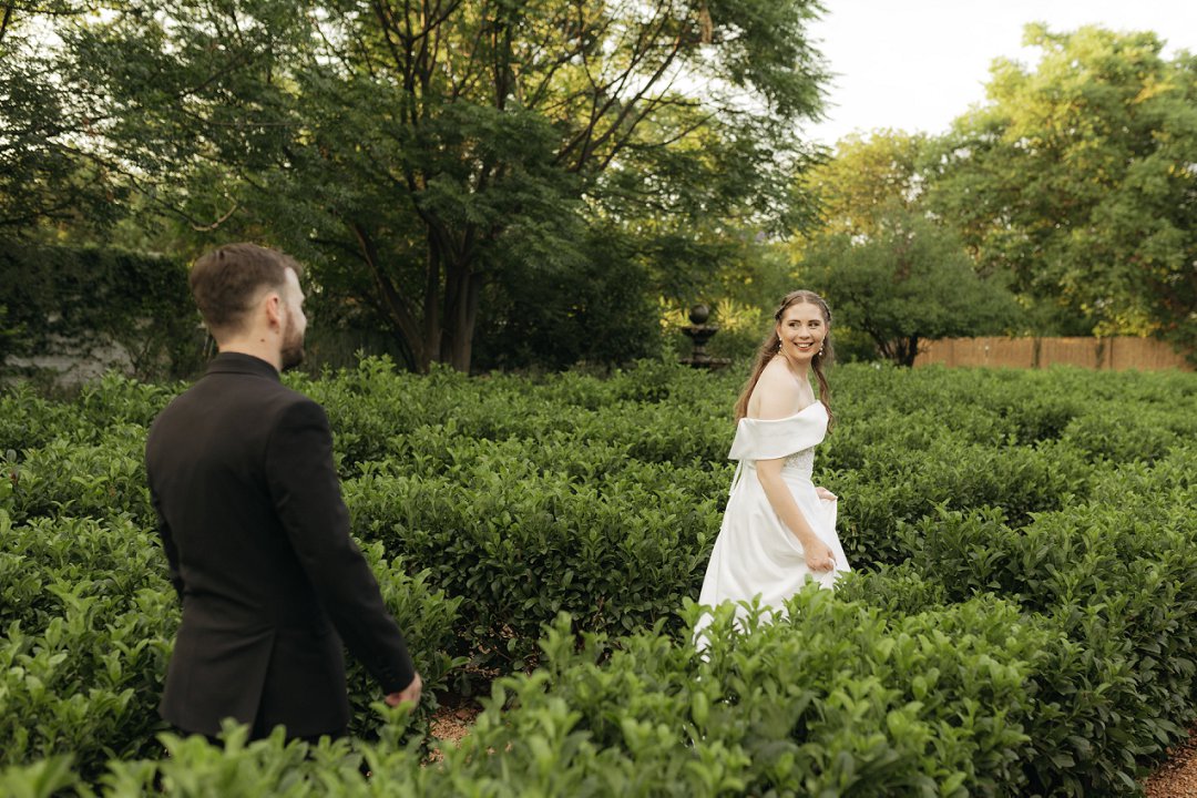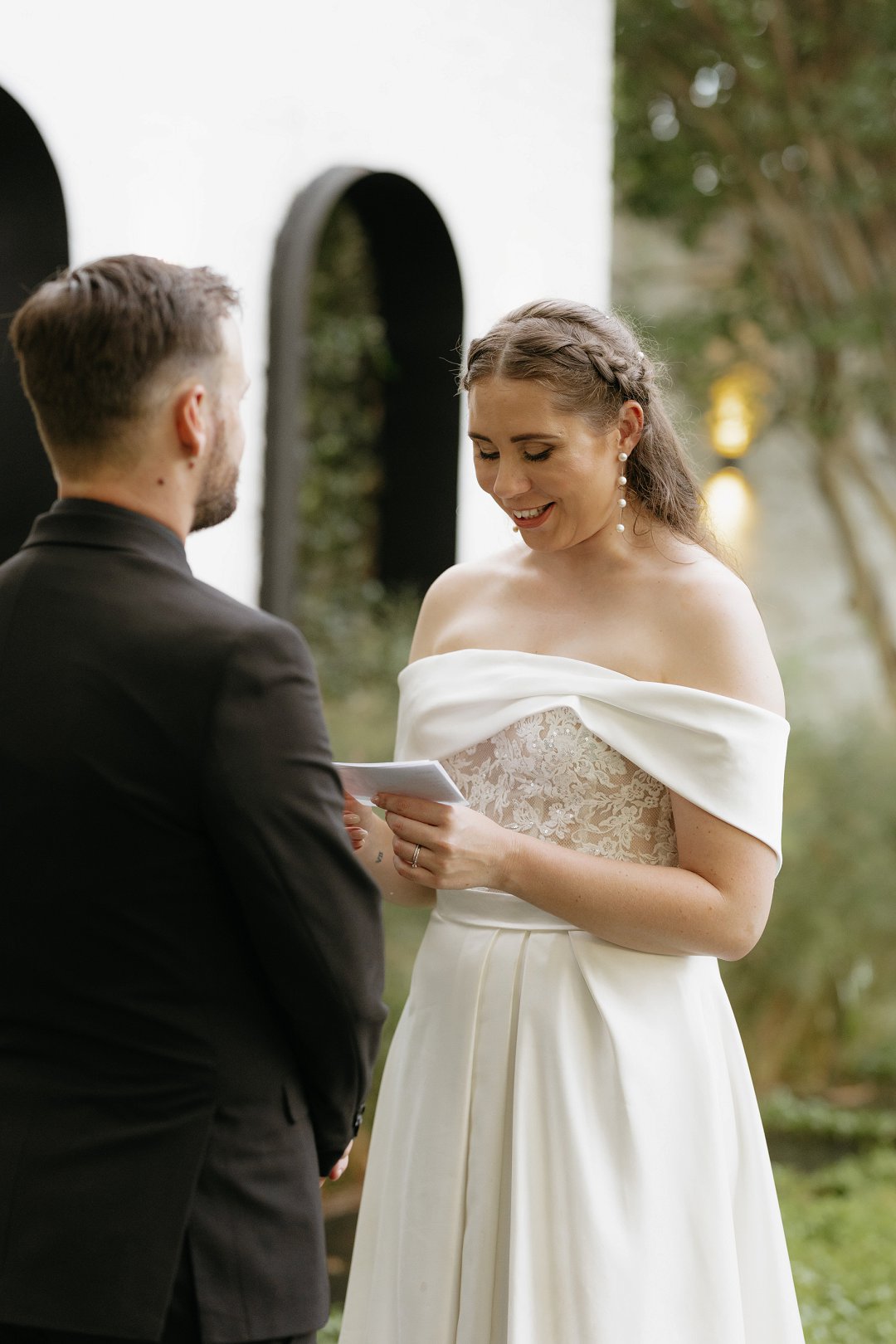 Hul seremonie het plaasgevind in ʼn semi-oop kapel, omring deur die rustigheid van die natuur se groenigheid. Die pragtige eenvoud van die swart en wit kleurskema het ʼn moderne en elegante atmosfeer geskep. Die talentvolle span van Belle Doux het die paartjie se droom dekor en blom ontwerpe tot lewe gebring.