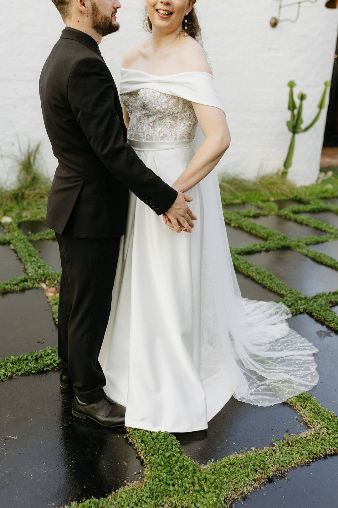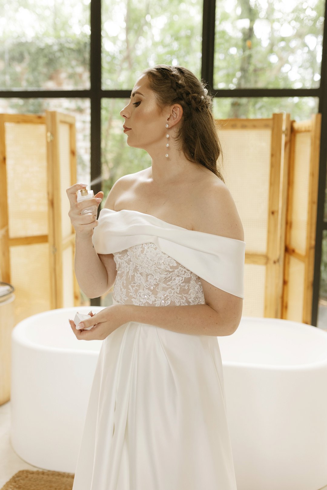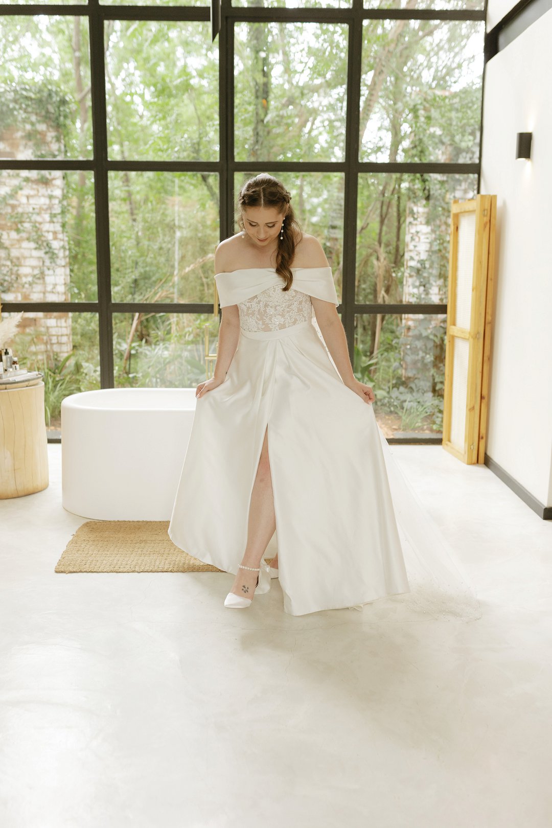 Angie het ʼn baie eenvoudige styl en was op soek na ʼn eenvoudige, klassieke trourok. Sy het ʼn Gabbiano Wedding House-rok met ʼn afgesnyde skouer gekies. Dit was die derde rok in die eerste winkel wat sy aangepas het, en dit was dit. Sy was mal oor die sagte, klassieke satyn en die glans van die diamant bokant-stuk. Die rok het pragtig gevloei en het só gemaklik gevoel.