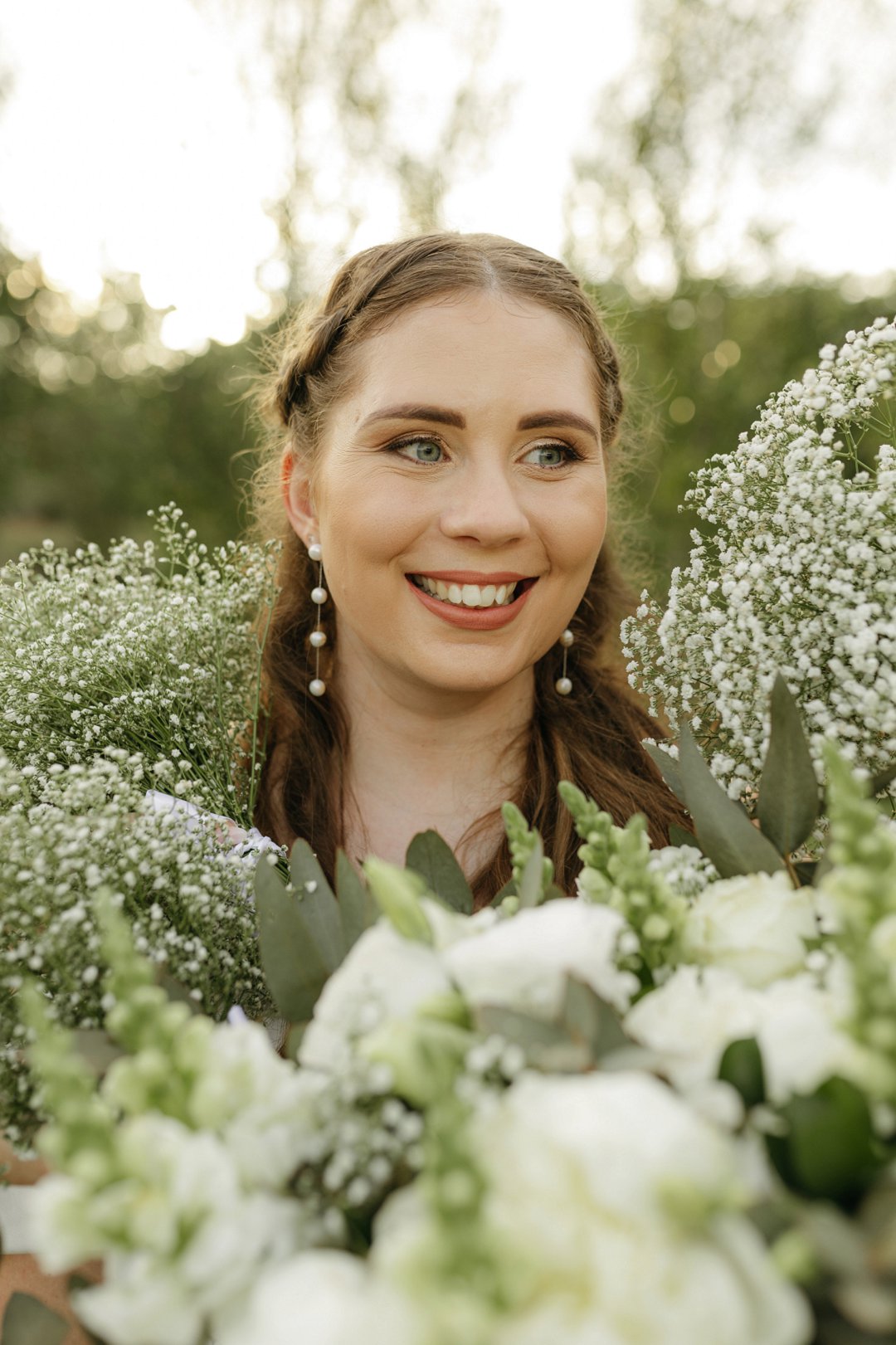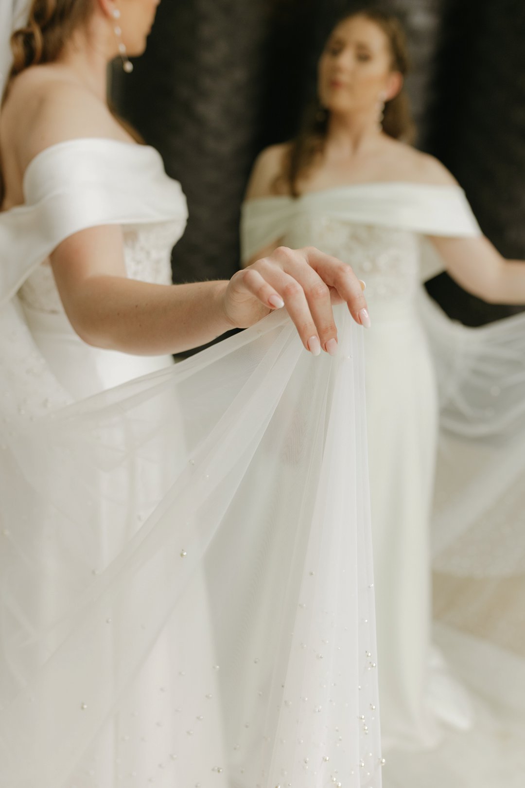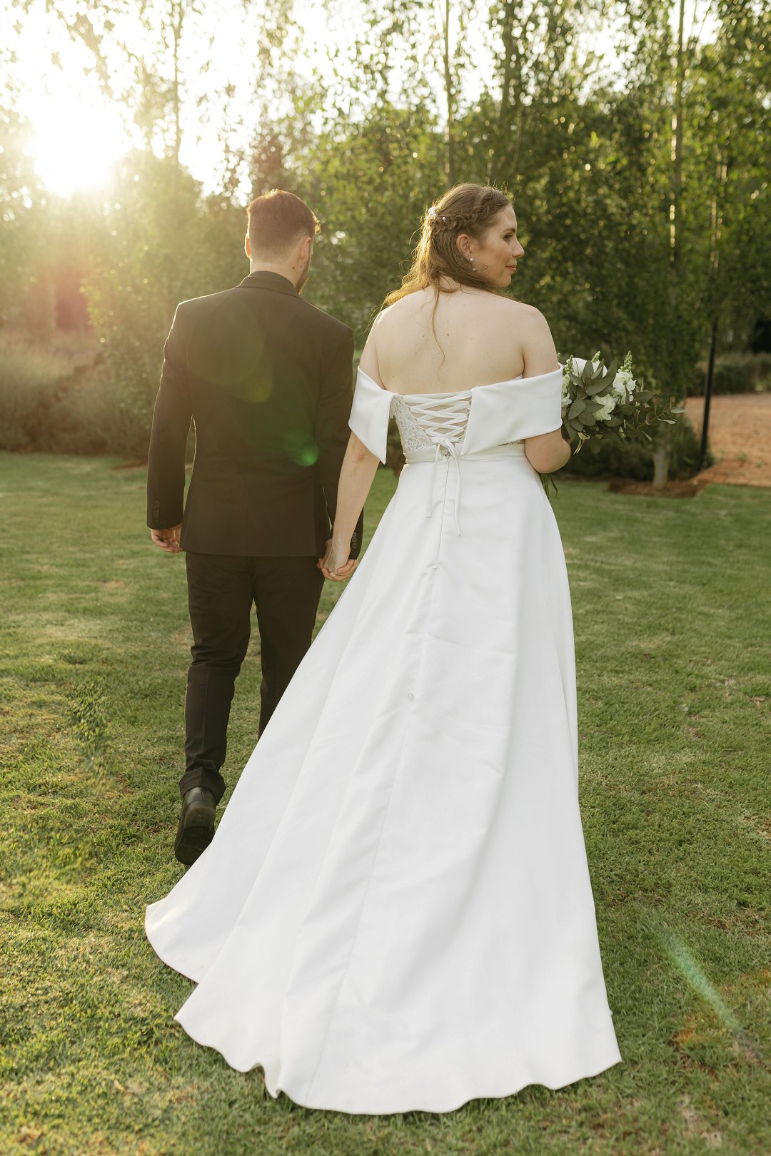 Angie het ʼn baie eenvoudige styl en was op soek na ʼn eenvoudige, klassieke trourok. Sy het ʼn Gabbiano Wedding House-rok met ʼn afgesnyde skouer gekies. Dit was die derde rok in die eerste winkel wat sy aangepas het, en dit was dit. Sy was mal oor die sagte, klassieke satyn en die glans van die diamant bokant-stuk. Die rok het pragtig gevloei en het só gemaklik gevoel.
