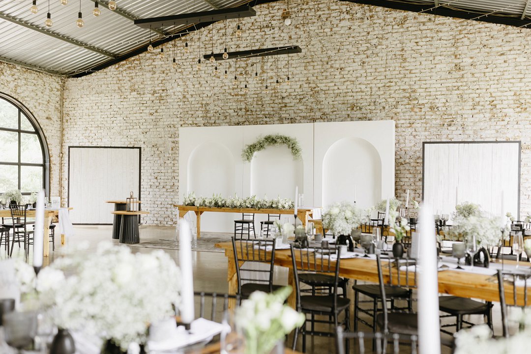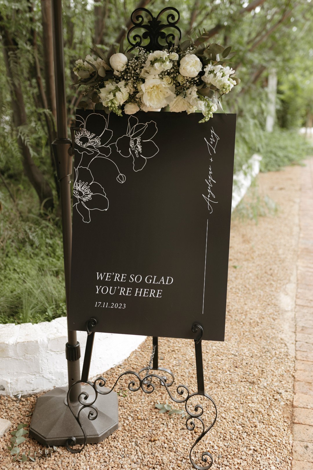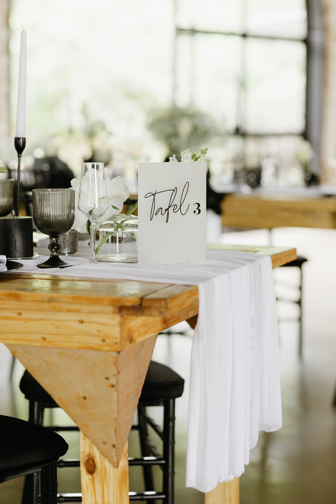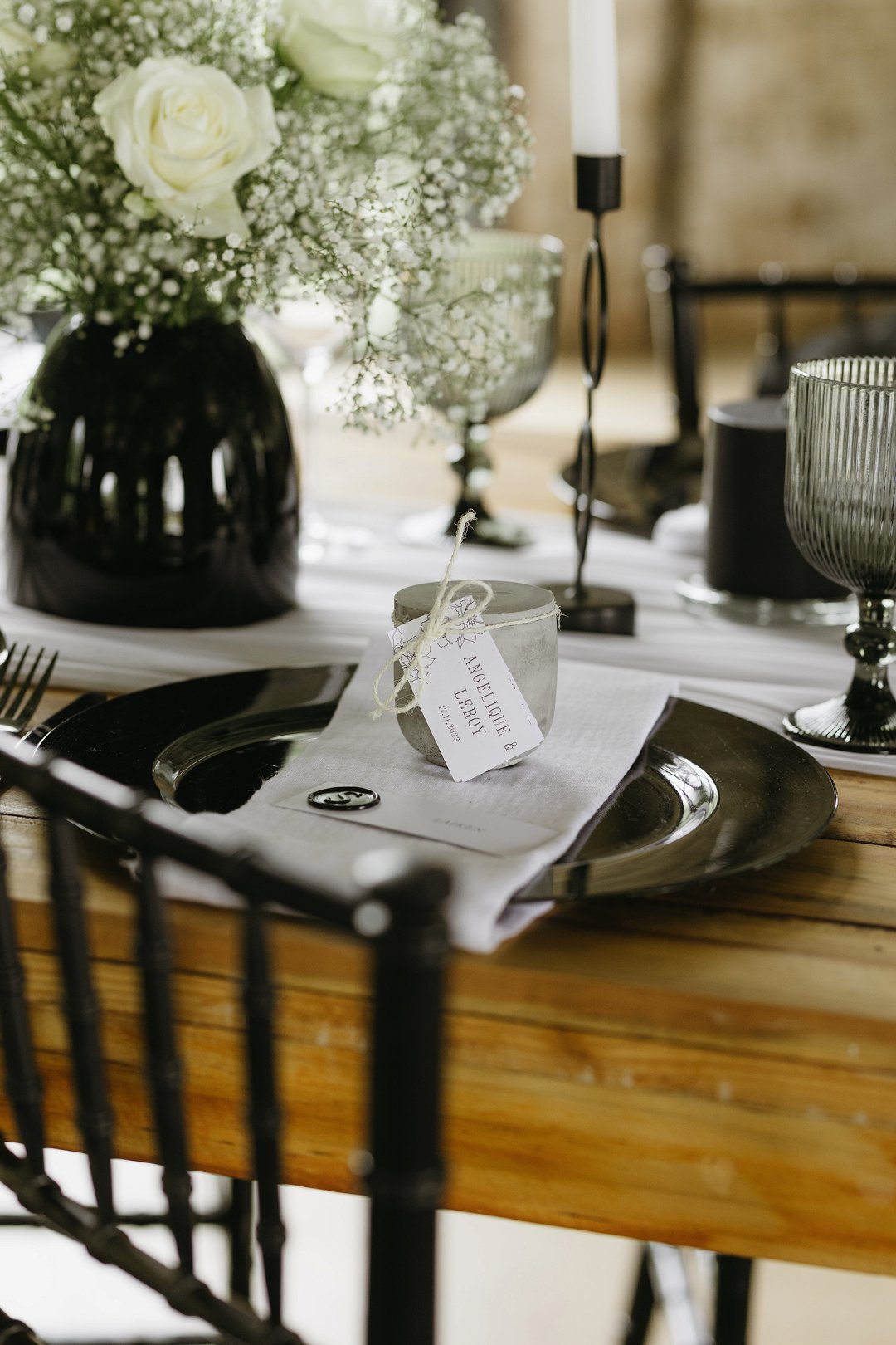 Leroy en Angie het ʼn duidelike visie vir hul troue gehad. ʼn Skoon, swart en wit kleurskema, binne ʼn moderne omgewing. Angie het ʼn moodboard van dekor idees saamgestel en dit aan Belle Doux Decor voorgehou, en hulle het dit alles tot lewe gebring! Hulle wou ʼn balans hê tussen swart en wit, met ʼn paar sagte blomme en warm kerslig. Angie en Leroy hou van eenvoudige dekor en het gevoel dat die swart en wit kleurskema pas by hul liefde vir rok kuns.