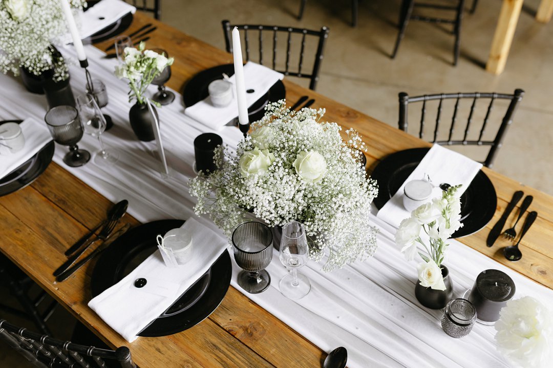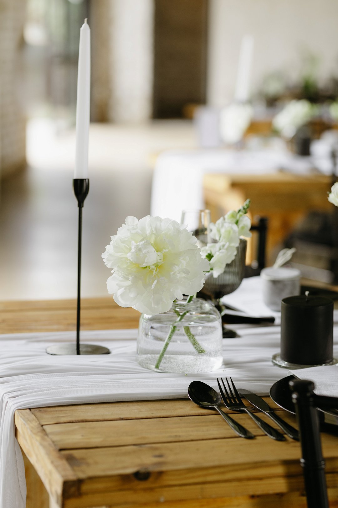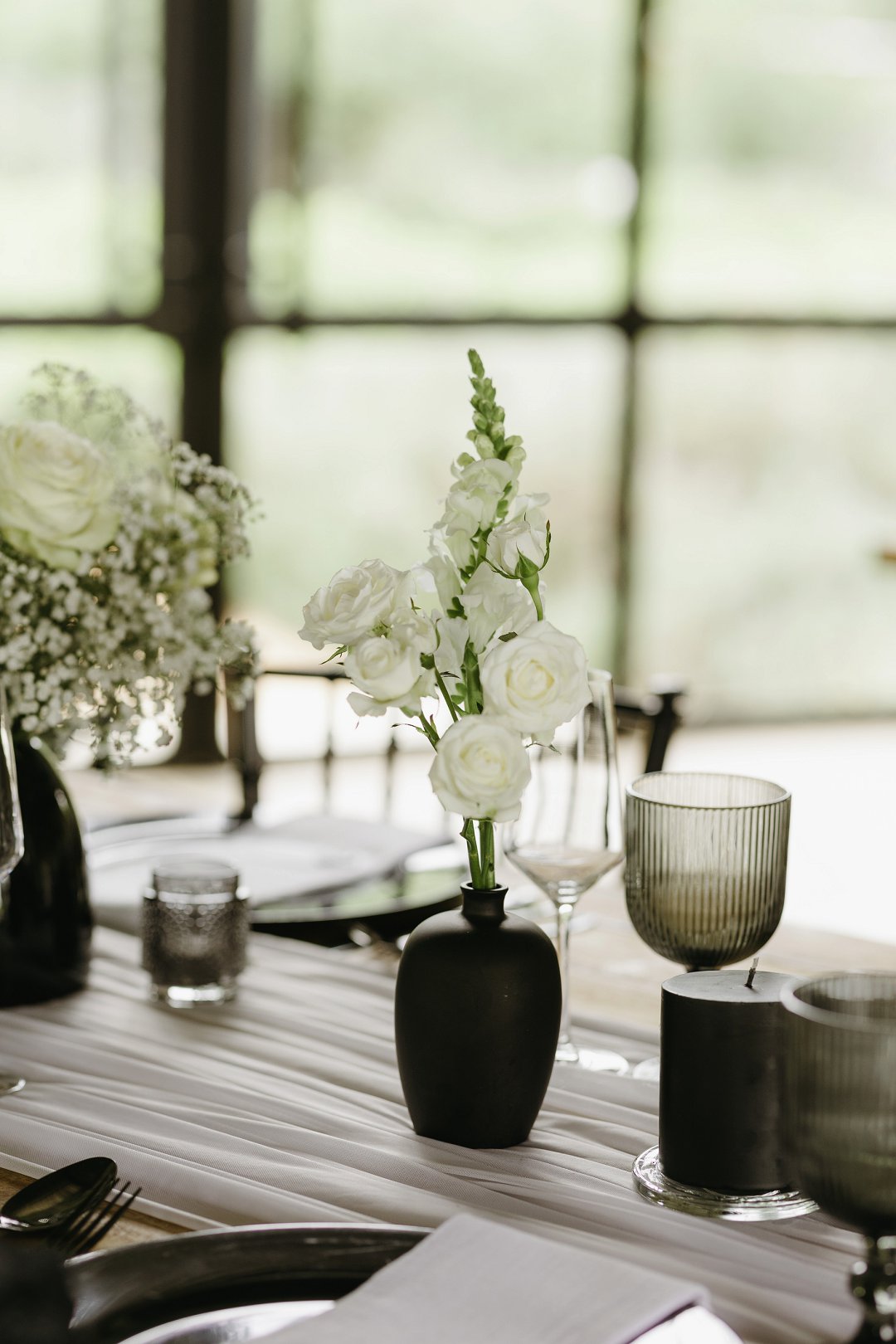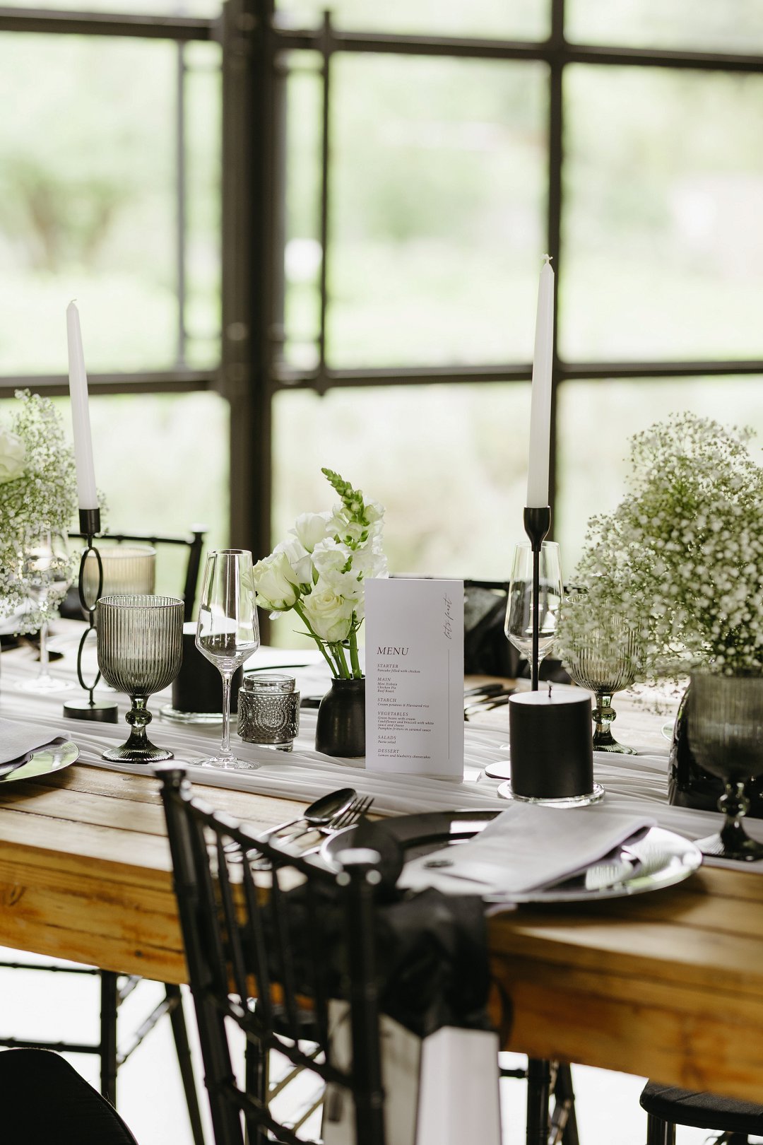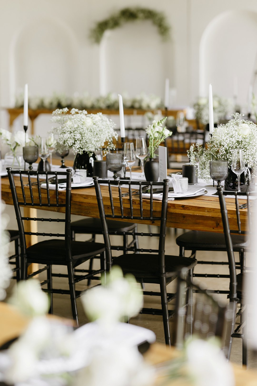 Tafels van die onthaal was oorgetrek met wit lopers wat ʼn sagte en romantiese basis gevorm het. Swart Tiffany-stoele het ʼn moderne, dog elegante aanslag gegee. Die tafels was versier met swart dekor items soos blompotte, kersstaanders, kerse, borde en glasware, wat ʼn tydlose en verfynde voorkoms geskep het. Sagte wit blom ontwerpe het die romantiese atmosfeer beklemtoon en die swart elemente perfek gekomplimenteer.