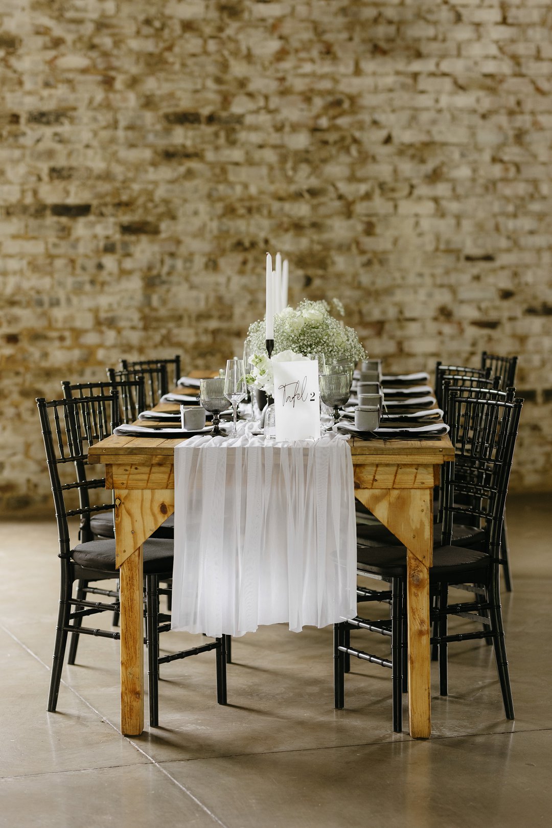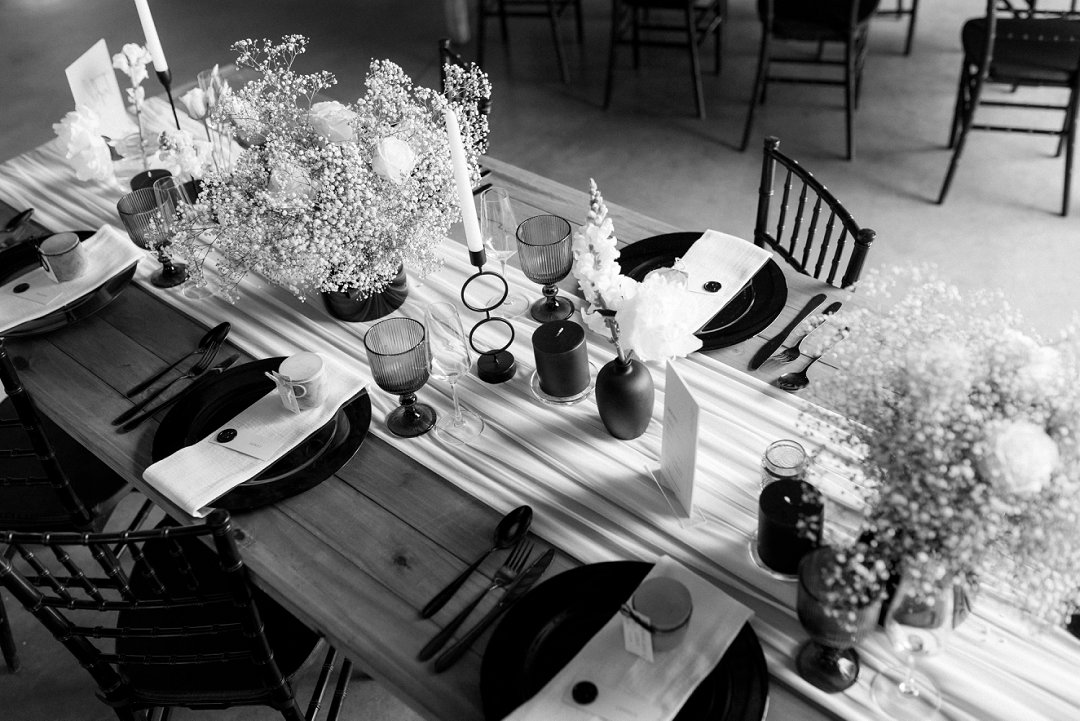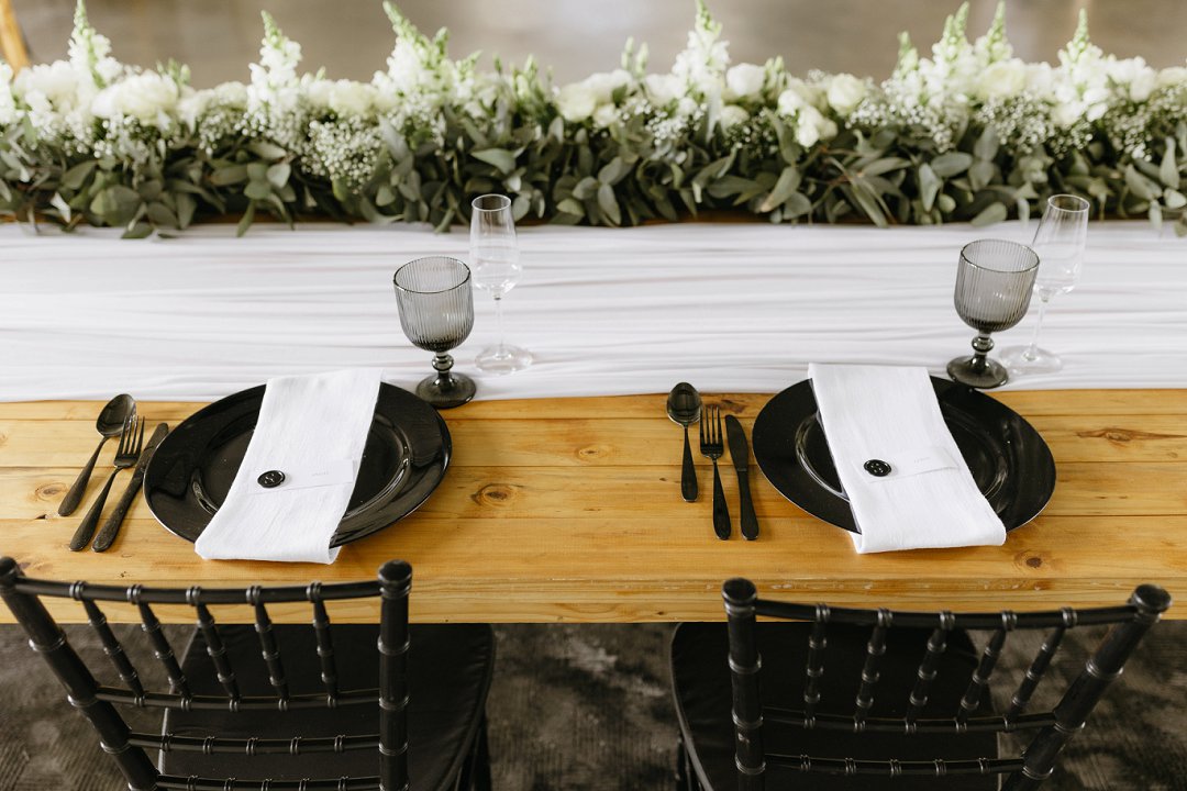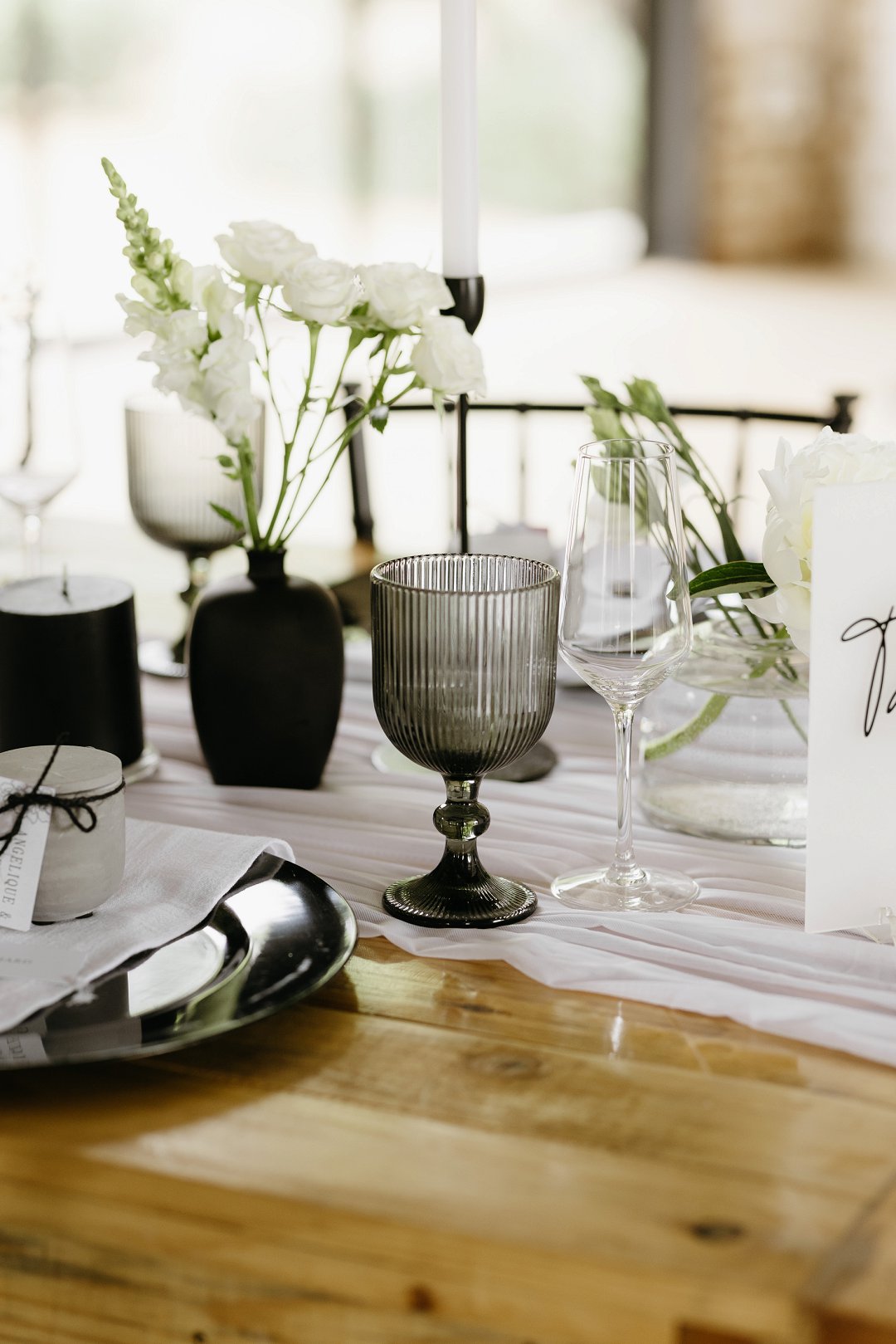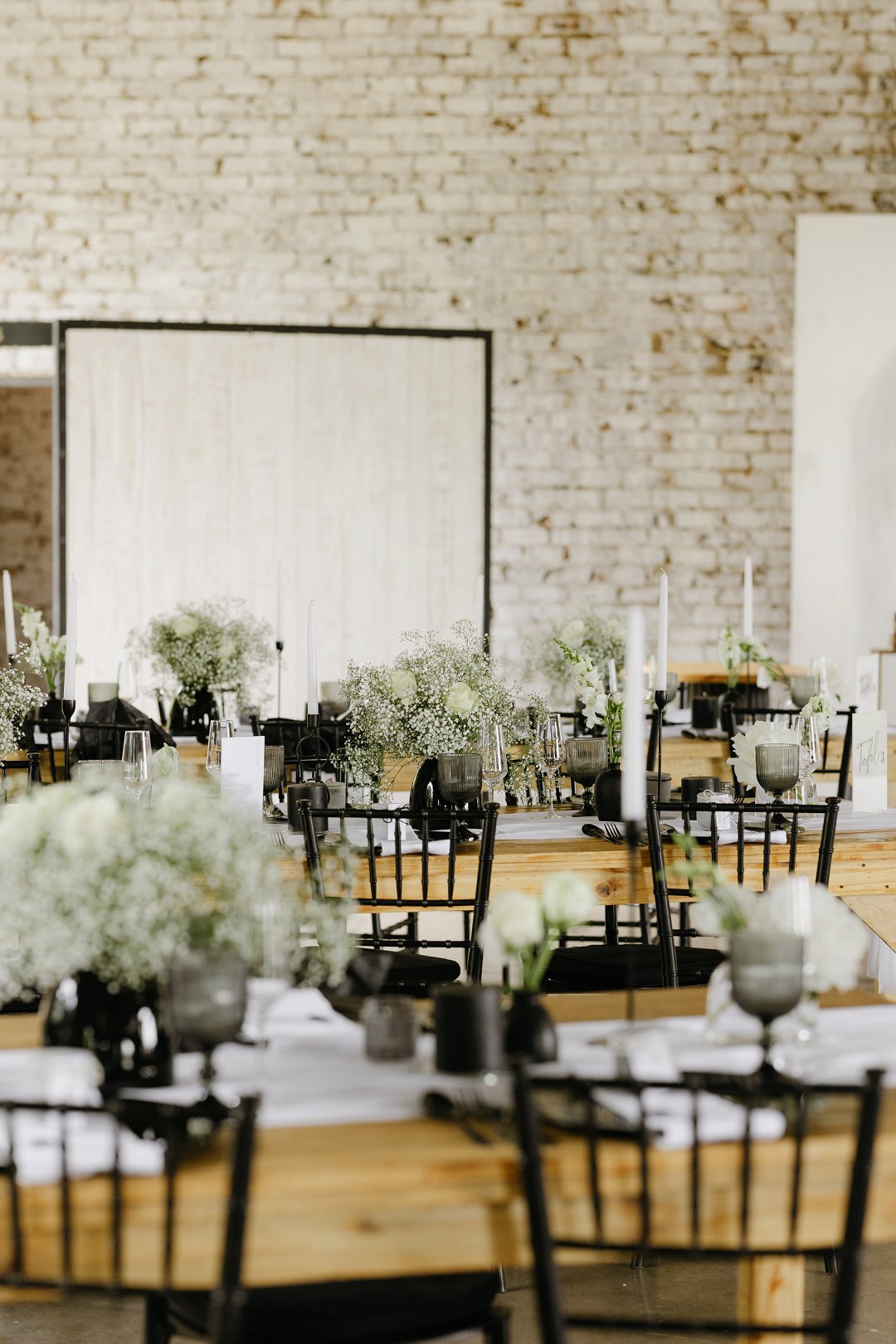 Tafels van die onthaal was oorgetrek met wit lopers wat ʼn sagte en romantiese basis gevorm het. Swart Tiffany-stoele het ʼn moderne, dog elegante aanslag gegee. Die tafels was versier met swart dekor items soos blompotte, kersstaanders, kerse, borde en glasware, wat ʼn tydlose en verfynde voorkoms geskep het. Sagte wit blom ontwerpe het die romantiese atmosfeer beklemtoon en die swart elemente perfek gekomplimenteer.