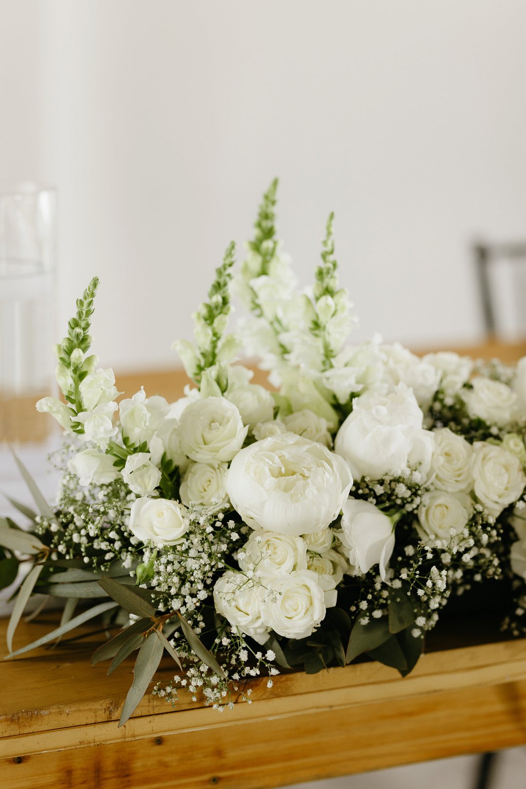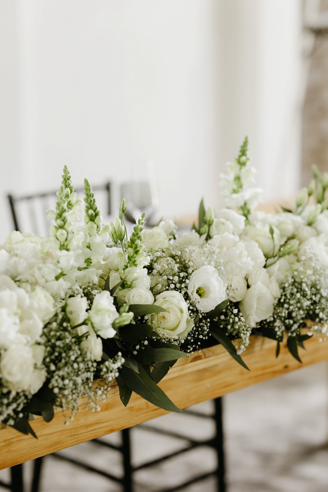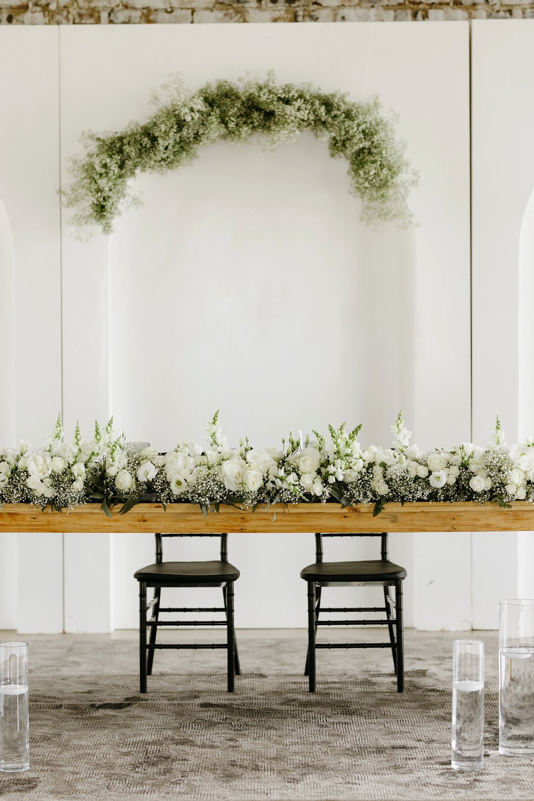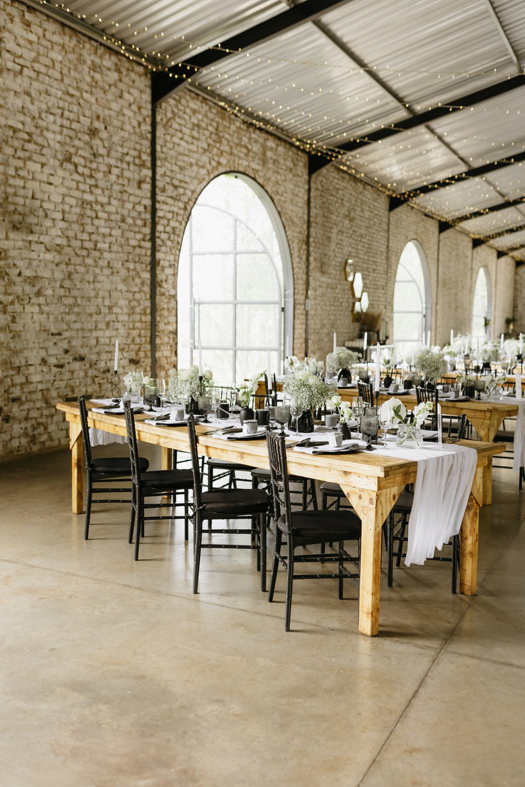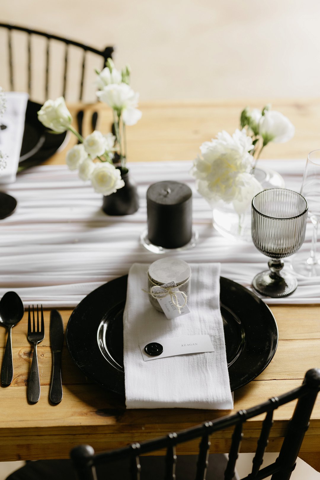 Tafels van die onthaal was oorgetrek met wit lopers wat ʼn sagte en romantiese basis gevorm het. Swart Tiffany-stoele het ʼn moderne, dog elegante aanslag gegee. Die tafels was versier met swart dekor items soos blompotte, kersstaanders, kerse, borde en glasware, wat ʼn tydlose en verfynde voorkoms geskep het. Sagte wit blom ontwerpe het die romantiese atmosfeer beklemtoon en die swart elemente perfek gekomplimenteer.