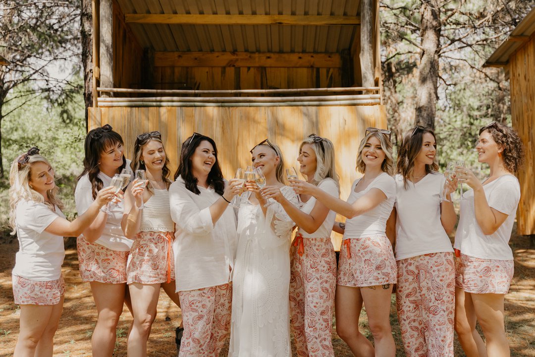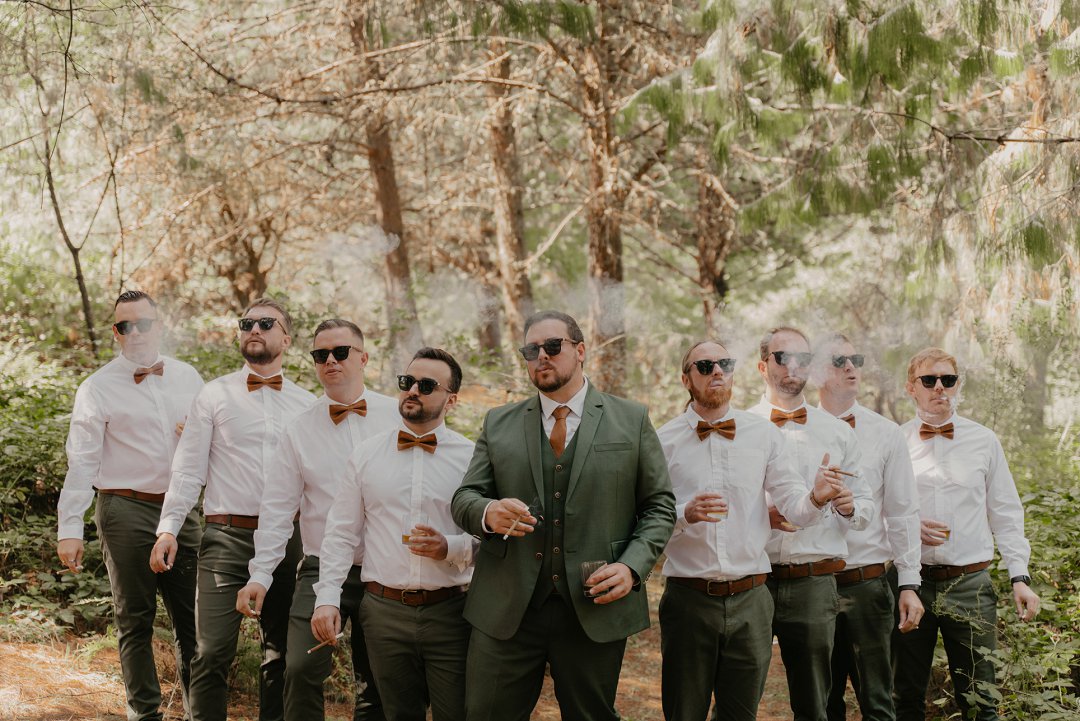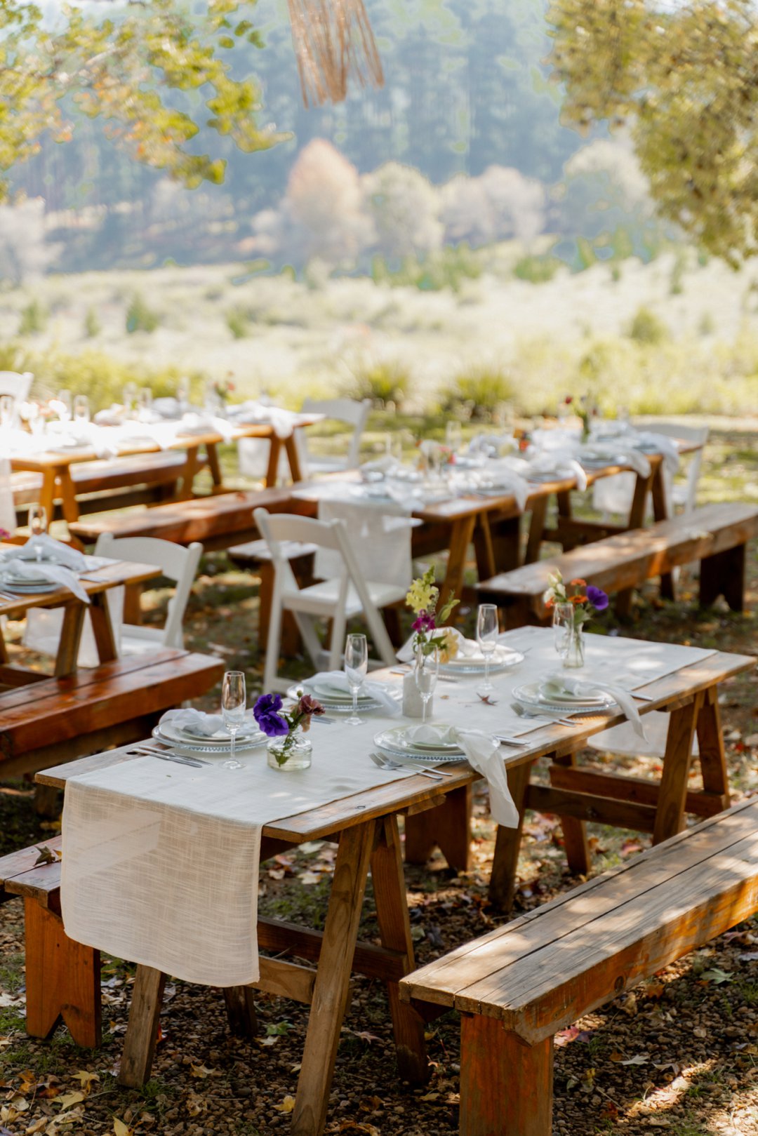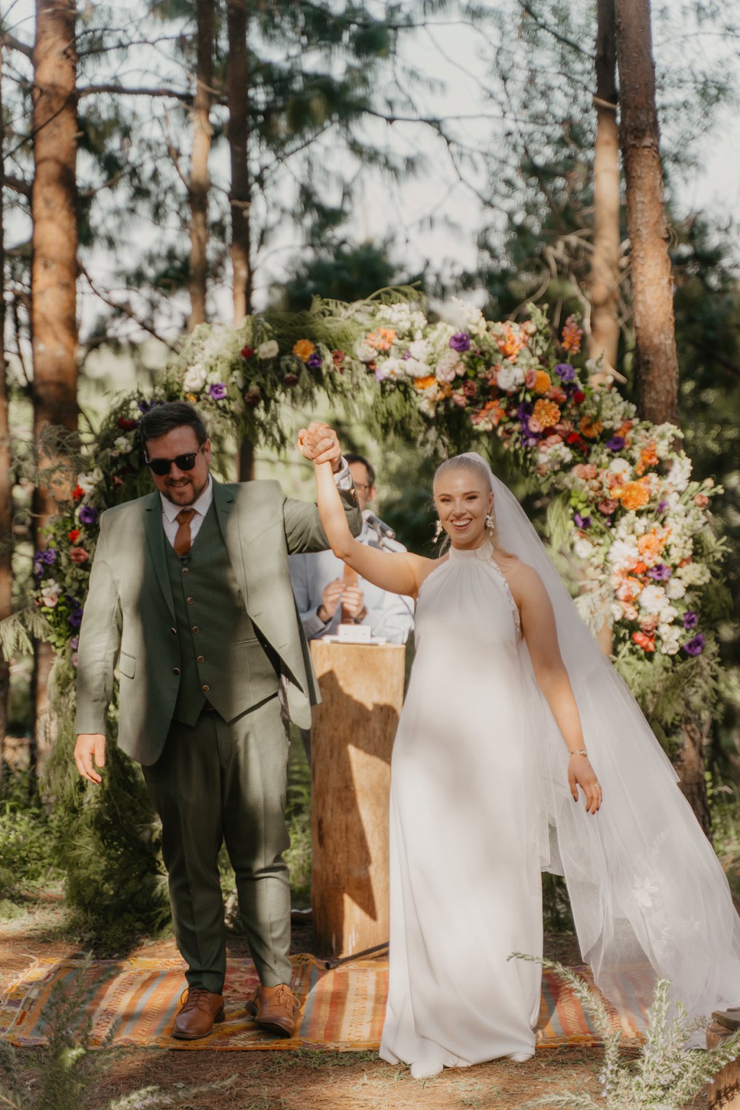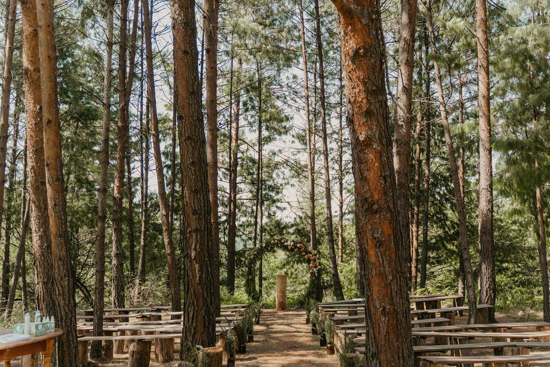 Die wilde blomme wat op die plaas groei het ons so geïnspireer dat ons die kleurskema van ons troue by die natuurlike skoonheid wou laat pas. Ons het meestal minimalistiese dekor gebruik om die woud se eenvoudigheid te beklemtoon, met ʼn bietjie kleur hier en daar om die dag se vreugdevolle atmosfeer te reflekteer. Die doel was om ʼn lekker atmosfeer te skep waar almal die liefde wat ons vir mekaar en vir ons gaste het, kon ervaar. Ons styl was lig, dromerig en vry – net soos die woud ons laat voel. Ons wou dit soortgelyk aan ʼn deftige musiekfees laat voel.