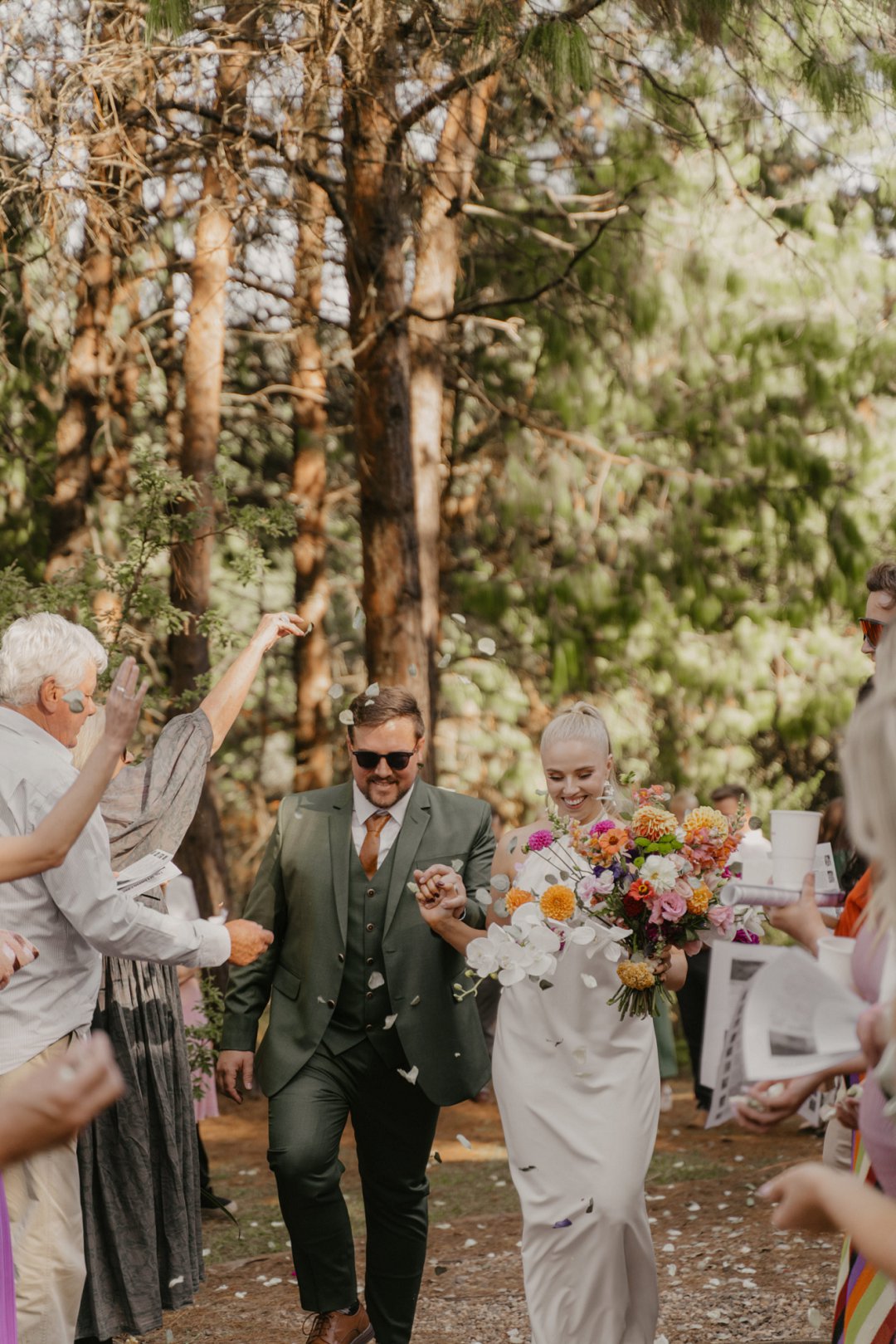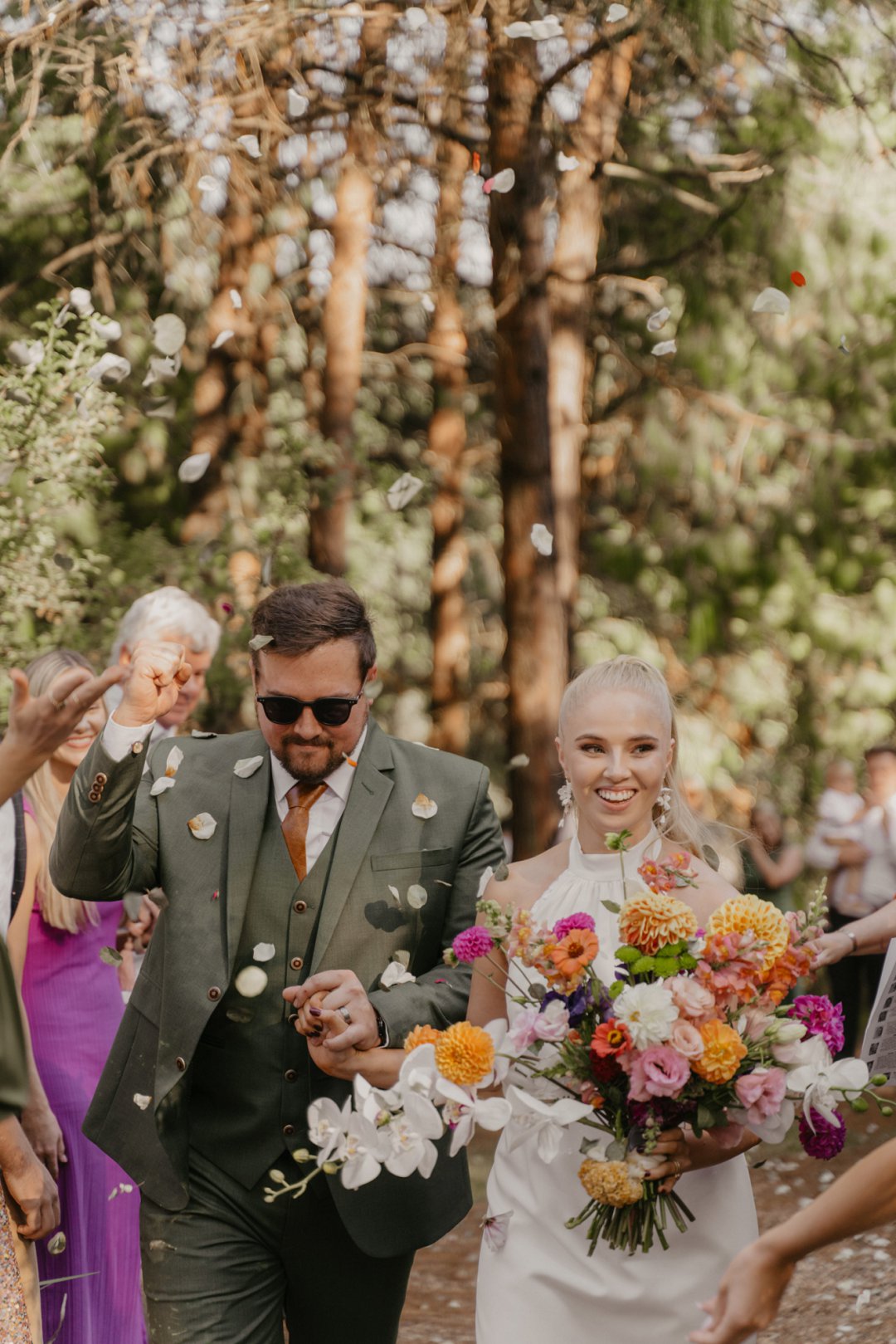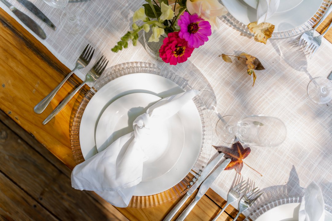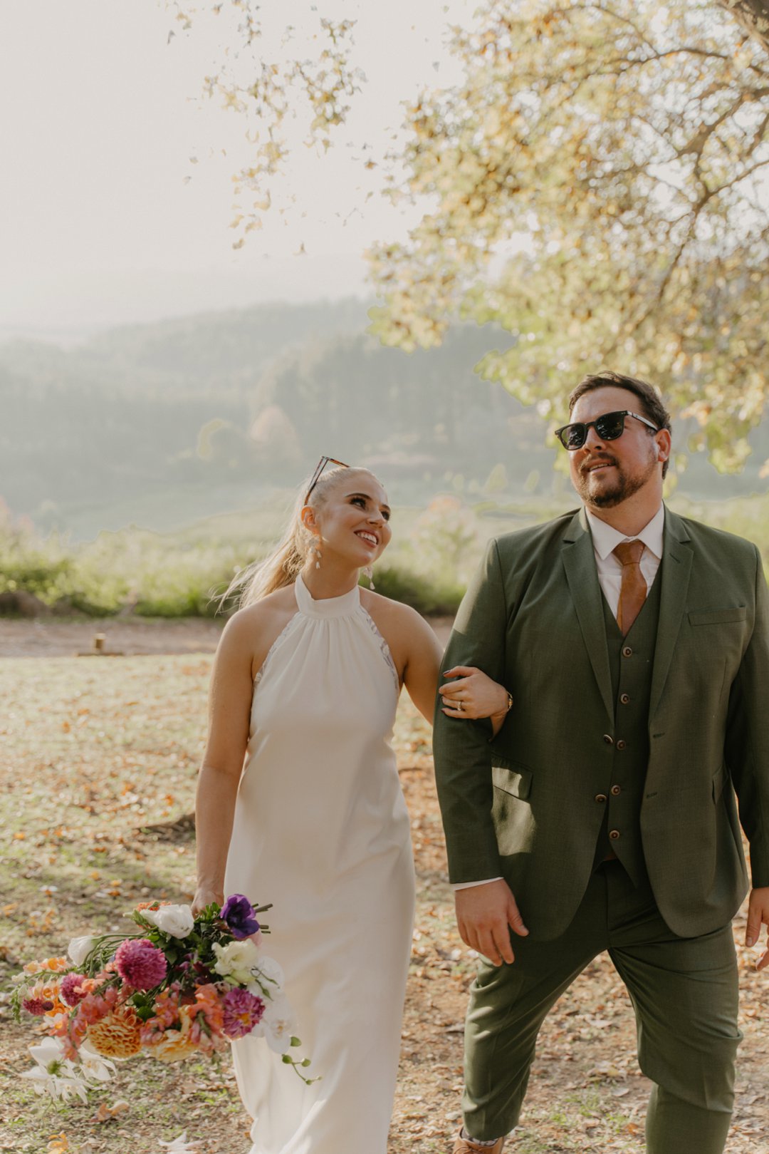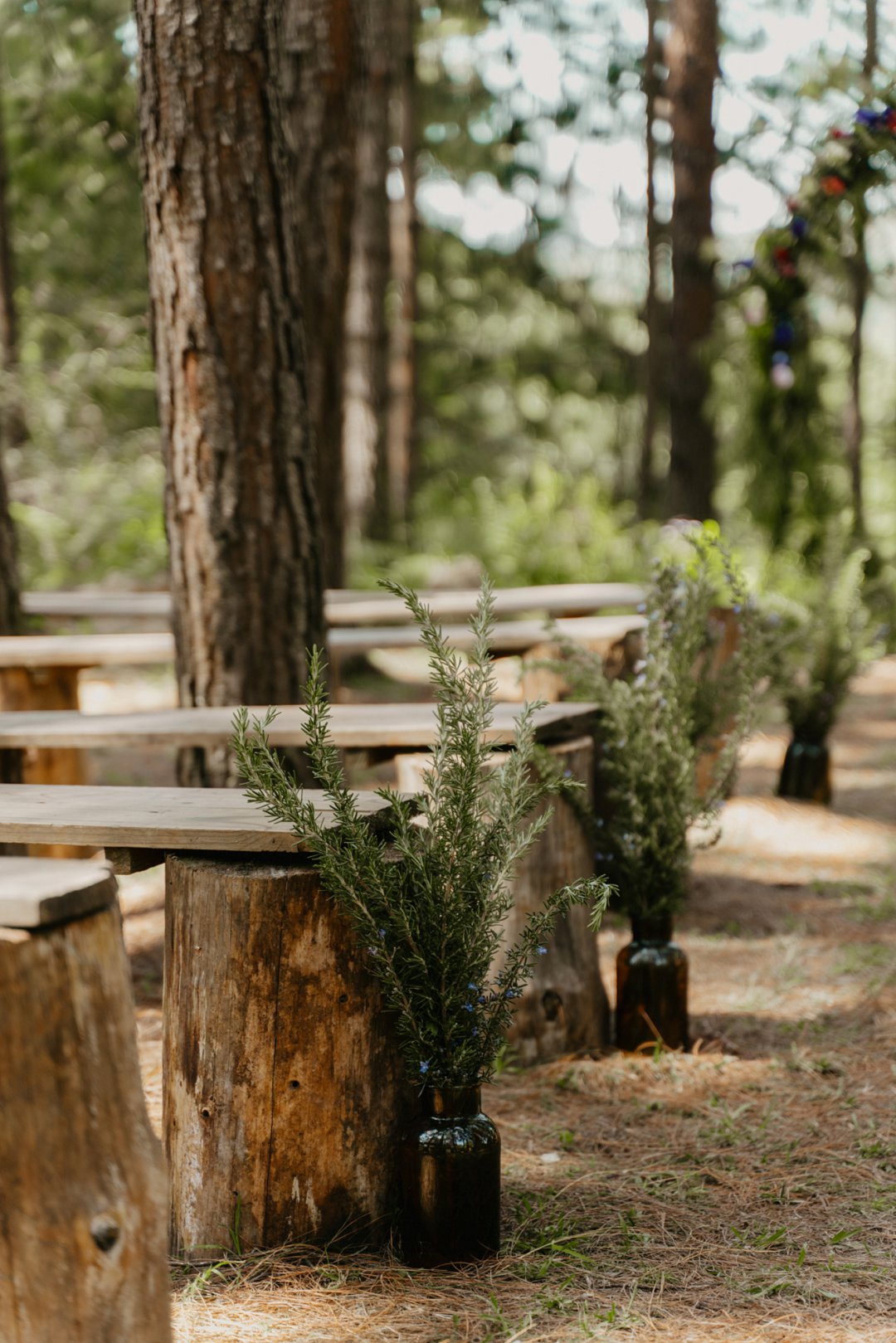 Die wilde blomme wat op die plaas groei het ons so geïnspireer dat ons die kleurskema van ons troue by die natuurlike skoonheid wou laat pas. Ons het meestal minimalistiese dekor gebruik om die woud se eenvoudigheid te beklemtoon, met ʼn bietjie kleur hier en daar om die dag se vreugdevolle atmosfeer te reflekteer. Die doel was om ʼn lekker atmosfeer te skep waar almal die liefde wat ons vir mekaar en vir ons gaste het, kon ervaar. Ons styl was lig, dromerig en vry – net soos die woud ons laat voel. Ons wou dit soortgelyk aan ʼn deftige musiekfees laat voel.