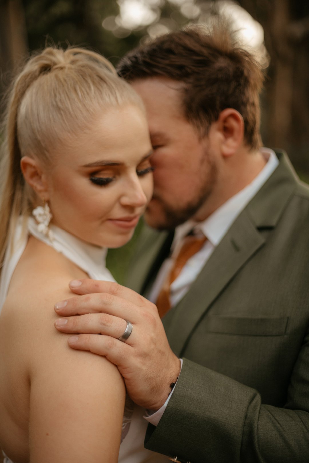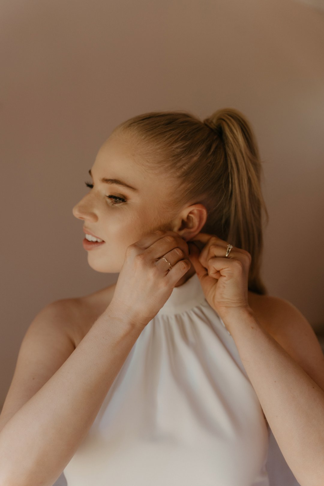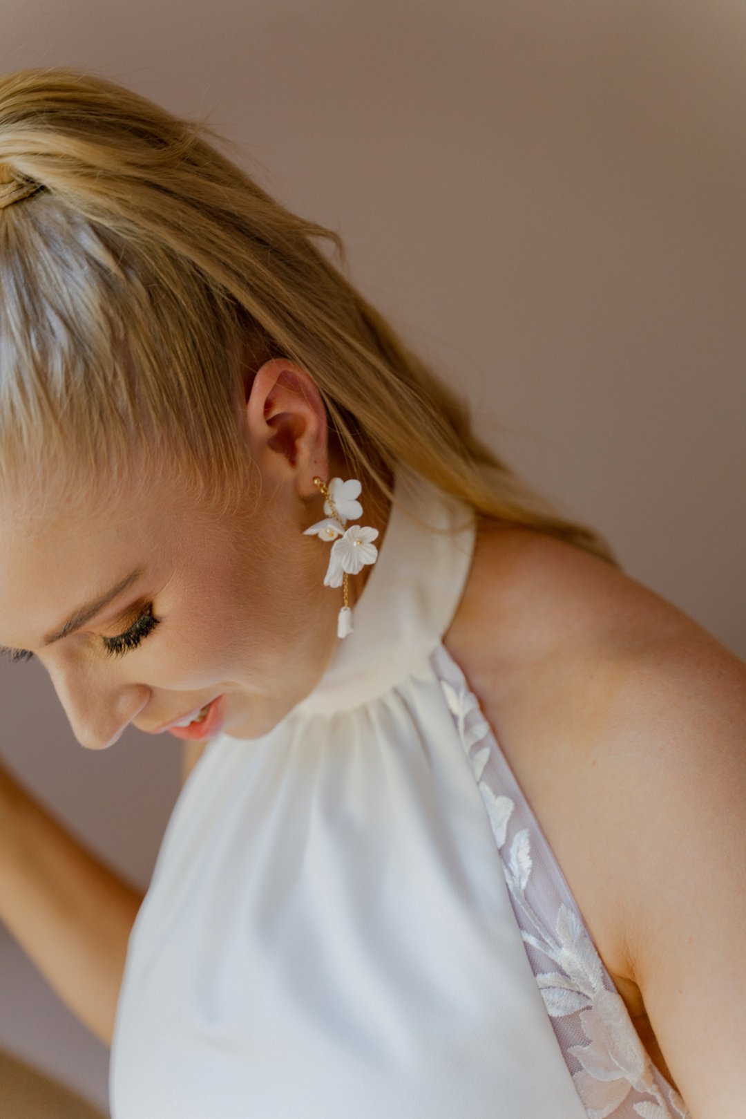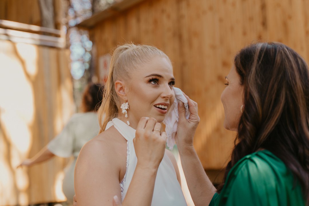 Michaela het op haar troudag soos ʼn droom gelyk in haar elegante en tydlose trourok, beklemtoon deur pragtige oorbelle. Haar grimering, met skakerings van bruin en koper, ʼn neutrale lip, en gloeiende vel, het haar natuurlike skoonheid perfek uitgebring. Cornél du Toit Makeup Artistry het ongelooflike werk gedoen met Michaela, haar ma, en strooimeisies. Die grimering het heeltyd foutloos gebly, selfs deur trane van vreugde.