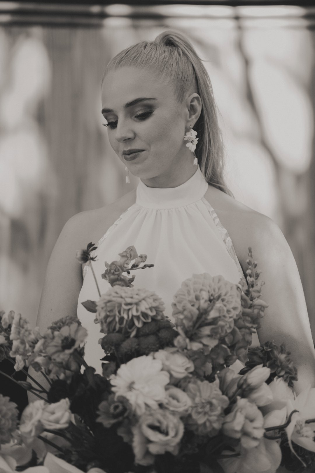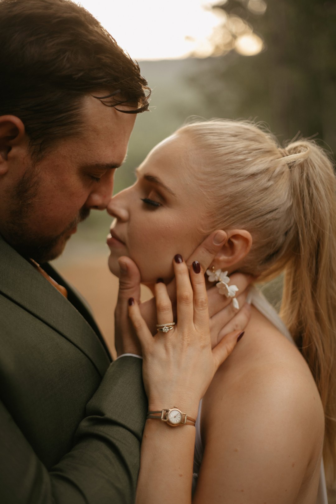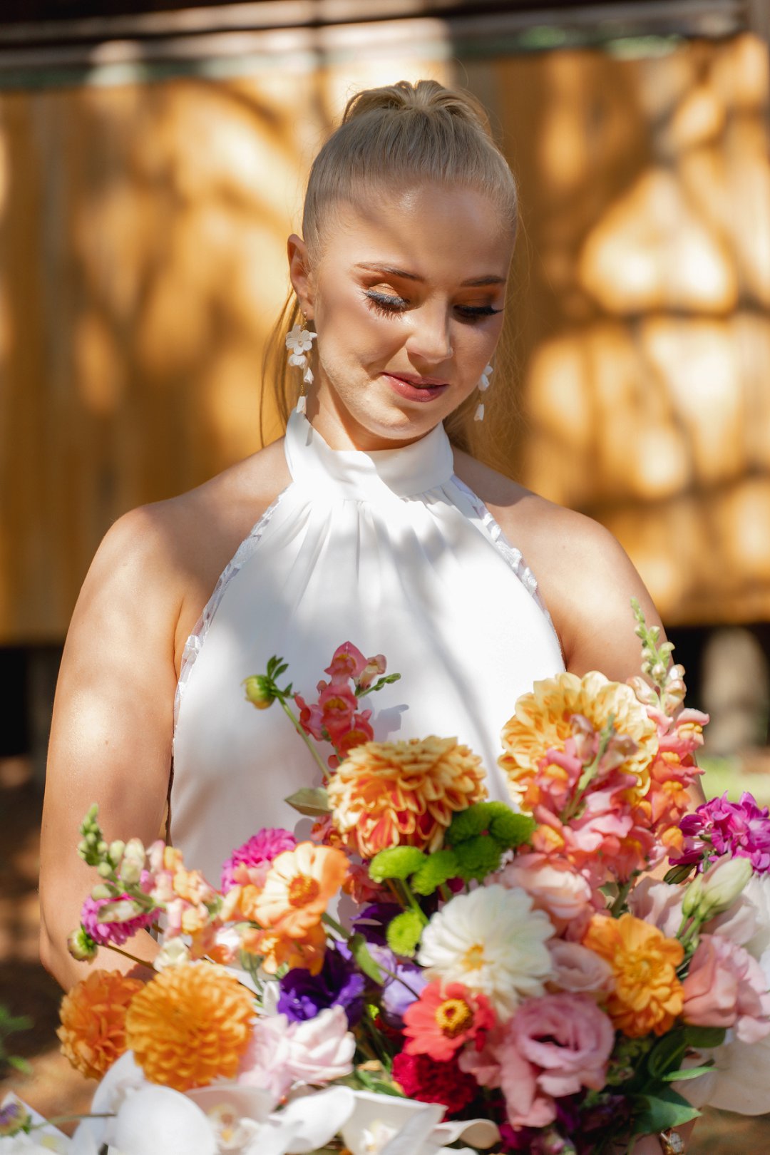Michaela het op haar troudag soos ʼn droom gelyk in haar elegante en tydlose trourok, beklemtoon deur pragtige oorbelle. Haar grimering, met skakerings van bruin en koper, ʼn neutrale lip, en gloeiende vel, het haar natuurlike skoonheid perfek uitgebring. Cornél du Toit Makeup Artistry het ongelooflike werk gedoen met Michaela, haar ma, en strooimeisies. Die grimering het heeltyd foutloos gebly, selfs deur trane van vreugde.
