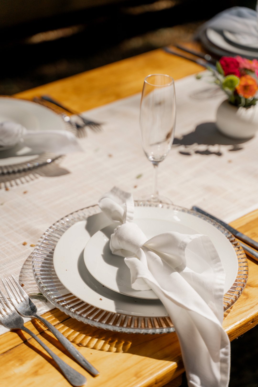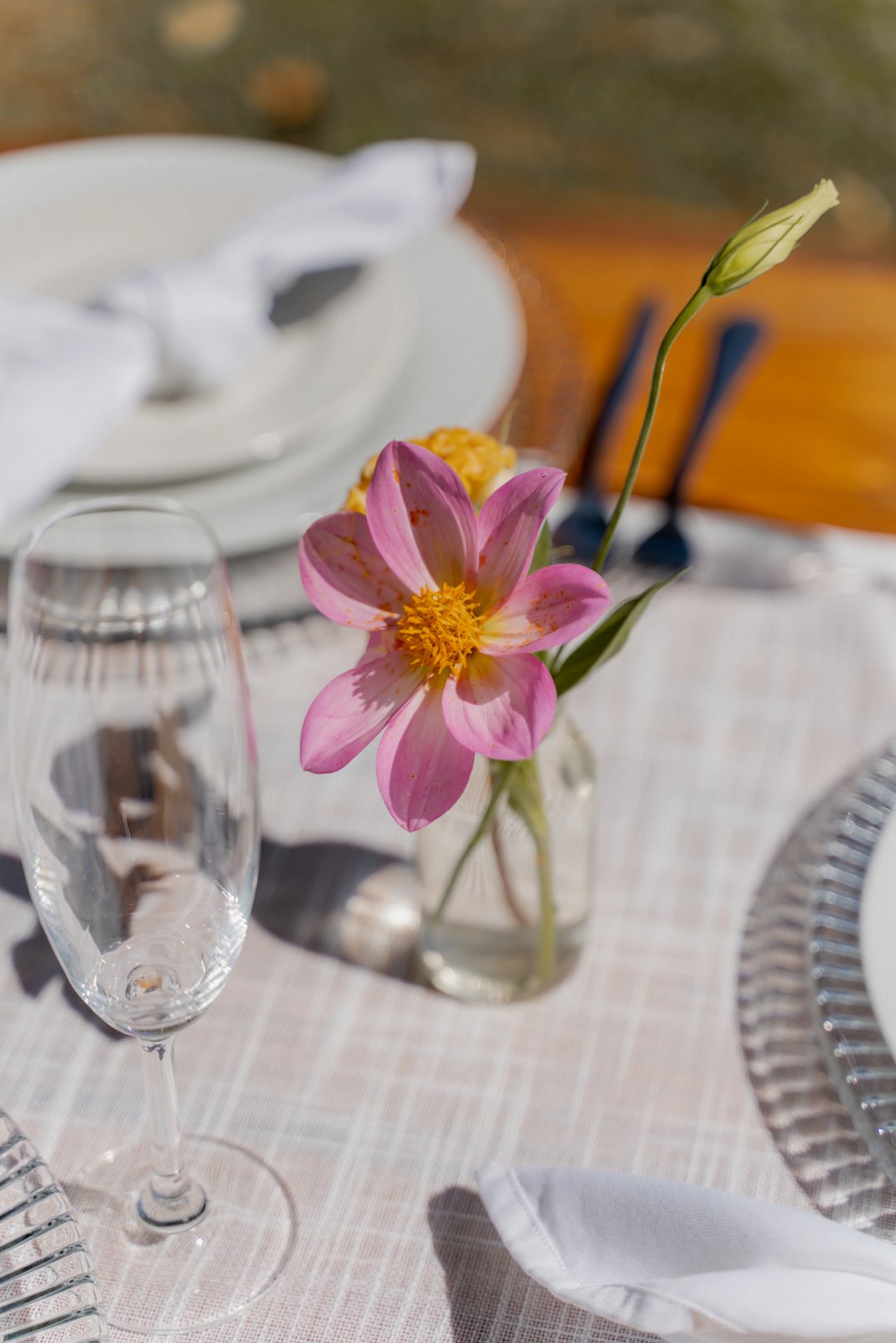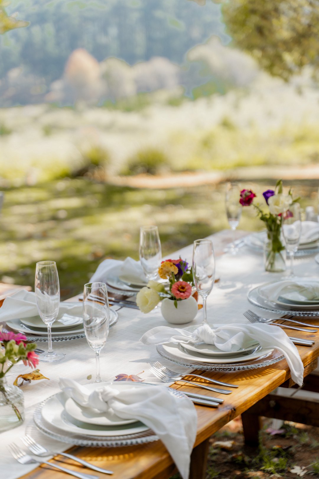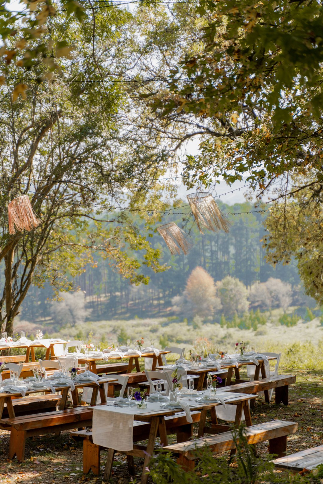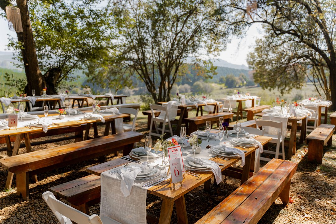 Die opelug onthaalarea onder die bome was ʼn prentjie van romantiek. Soos die son gesak het, het liggies begin skyn en die natuur se sagte geluide het die atmosfeer gevul. Dit was die perfekte plek vir ʼn intieme en gesellige viering. Die tafels was eenvoudig, maar pragtig versier met breë tafellopers en helder blommetjies in klein potjies, wat mooi by die natuurlike omgewing gepas het.