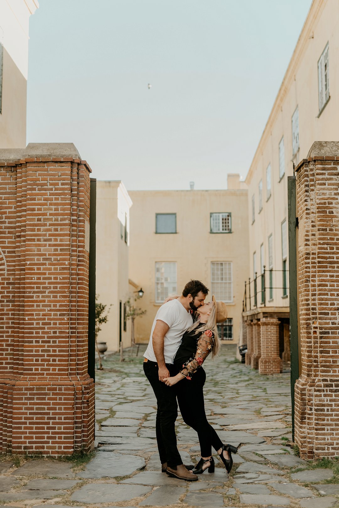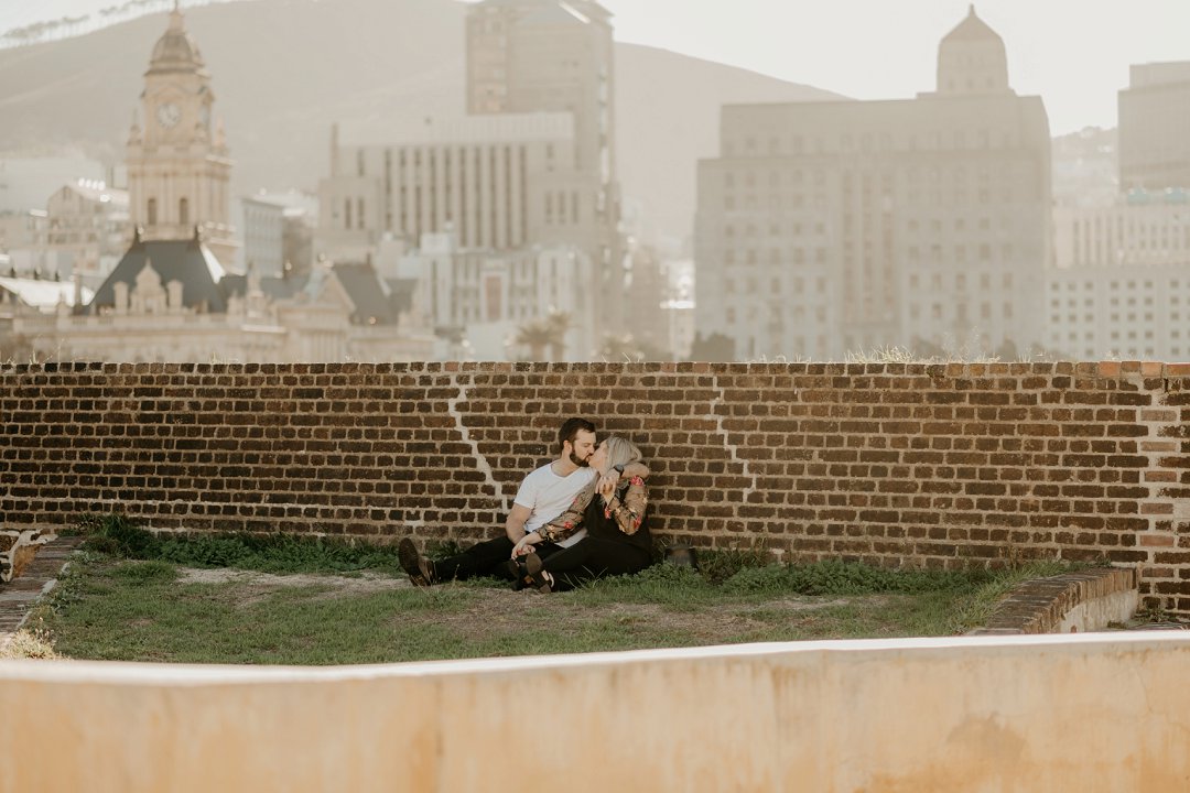 Kasteel de Goede Hoop se asemrowende argitektuur en skilderagtige uitsigte bied die perfekte agtergrond vir hierdie spesiale oomblik. Die antieke klipmure en lig oranje, amper geel geboue kontrasteer pragtig met die paartjie se donker uitrustings, wat elke foto ʼn unieke, romantiese gevoel gee.