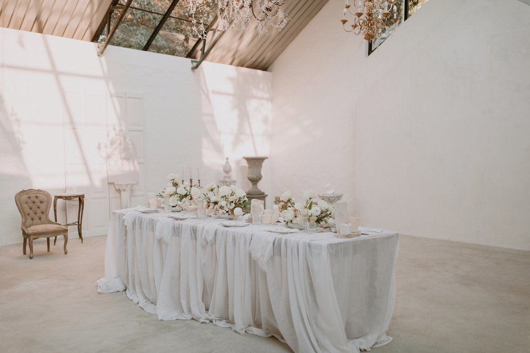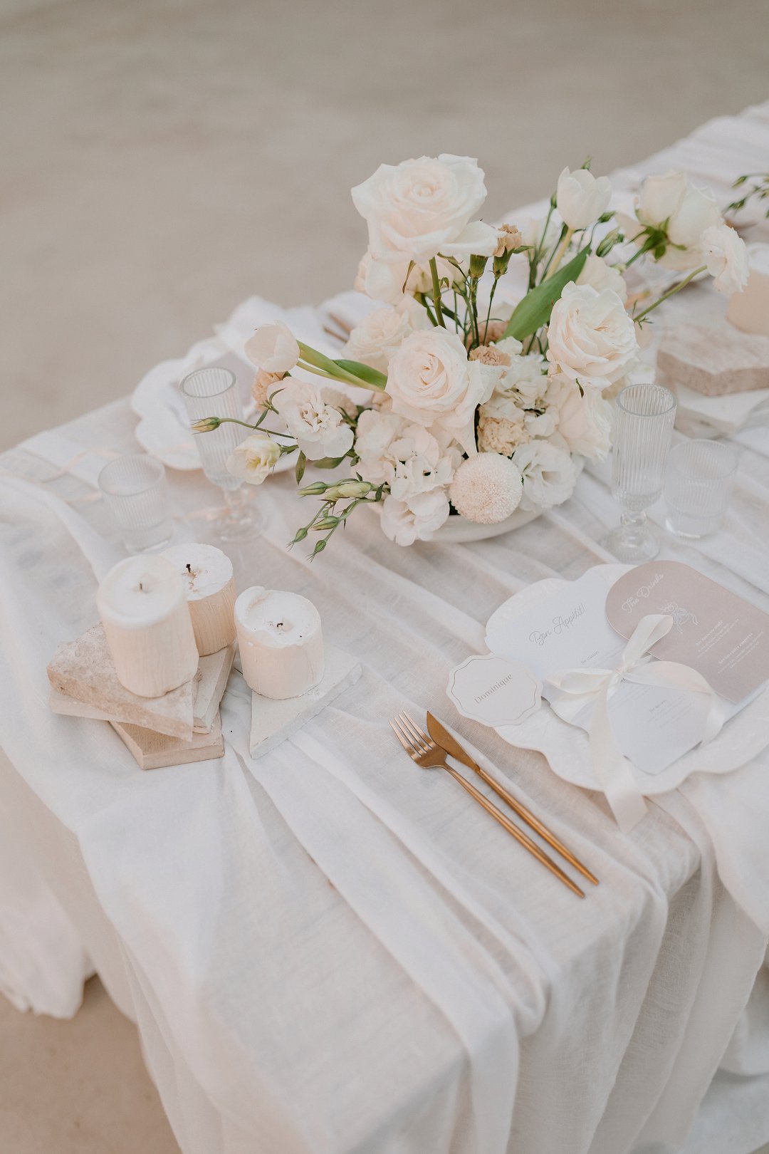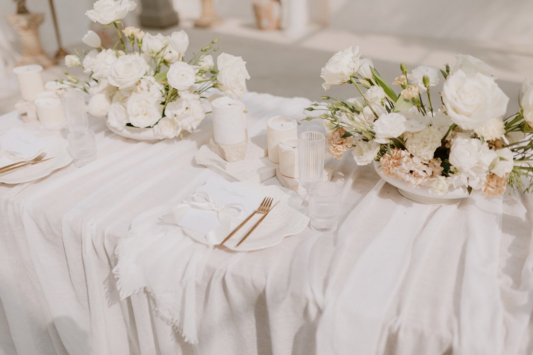 Die tafel is pragtig gestileer met deursigtige materiaal van ligte aardse kleure in wit en sagte sand skakerings. Dit skep die perfekte basis, terwyl welige wit blommerangskikkings ʼn vrolike atmosfeer en elegante voorkoms bring. Die kerse voeg weer die romantiese gevoel by.