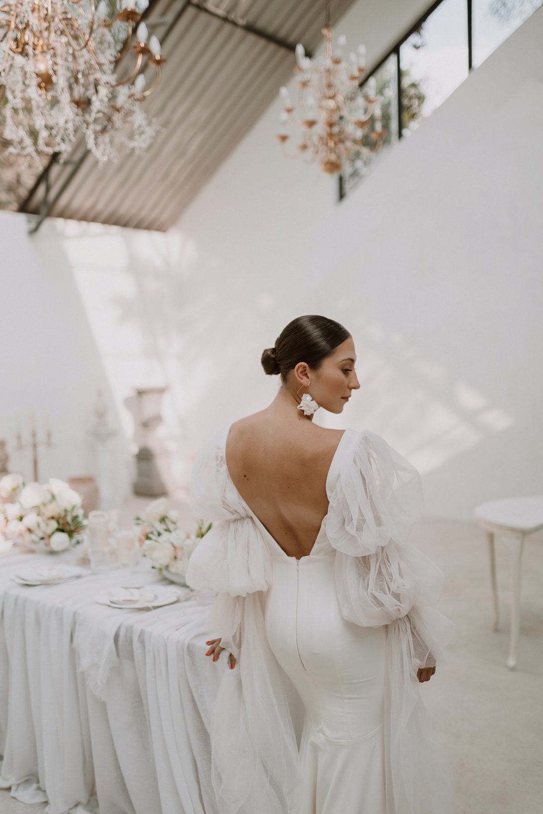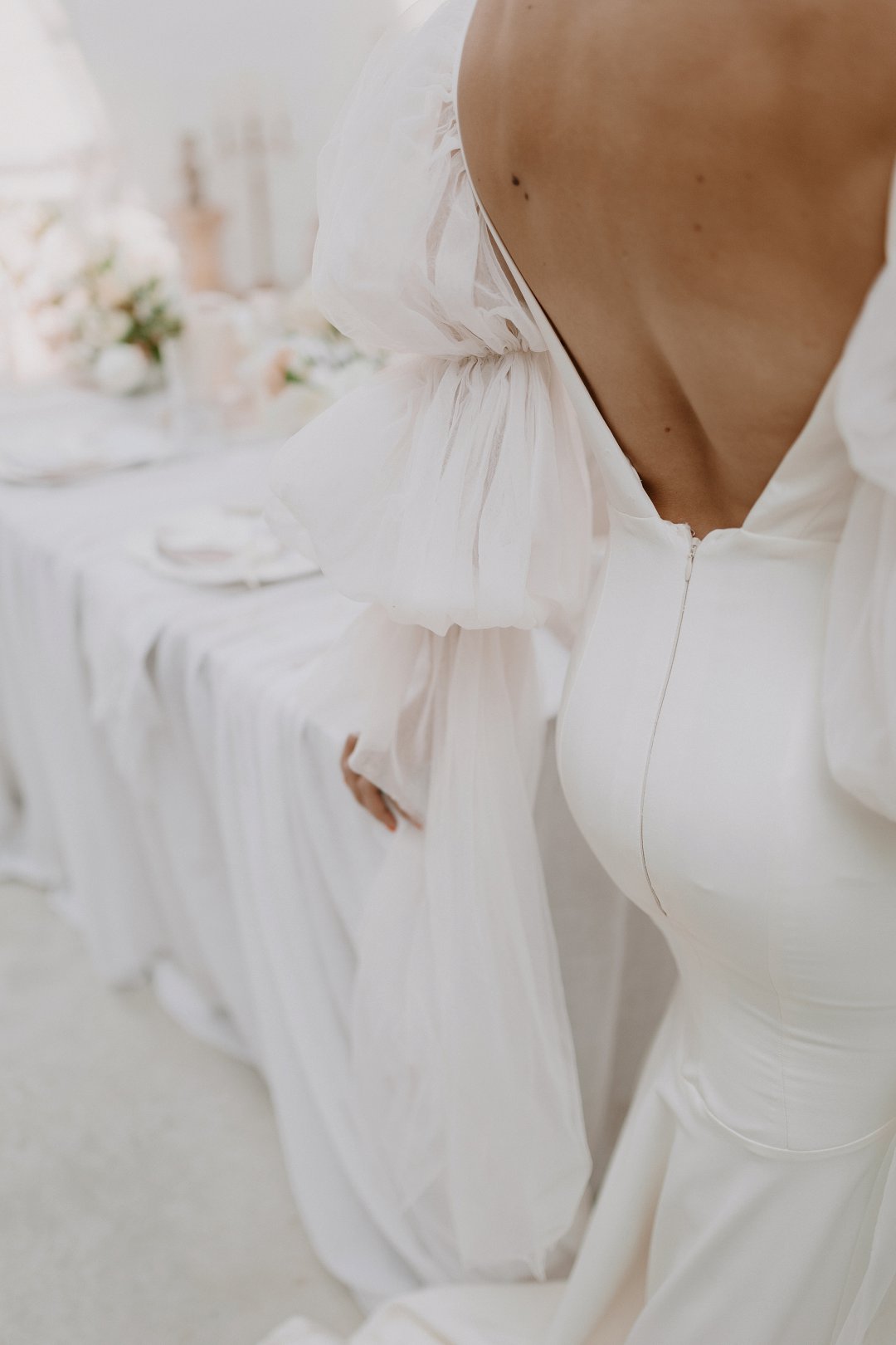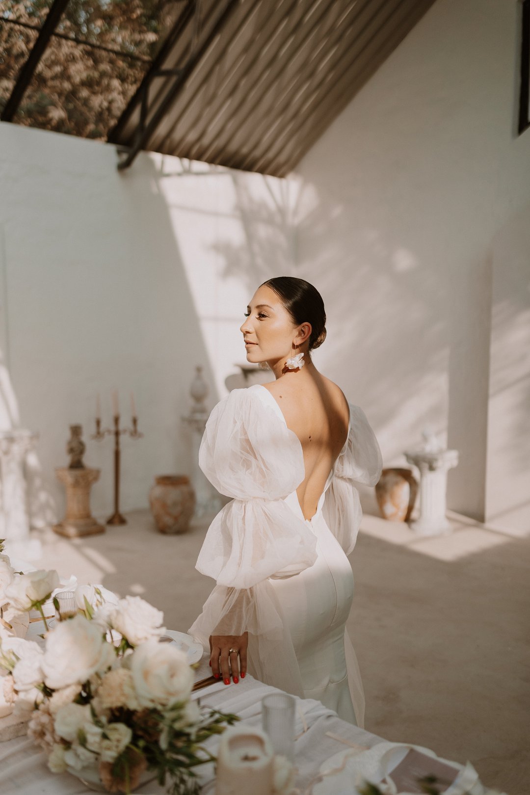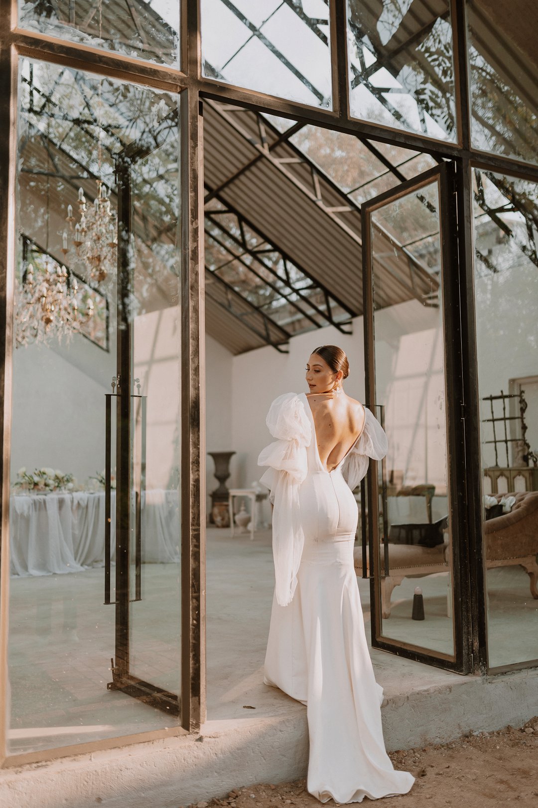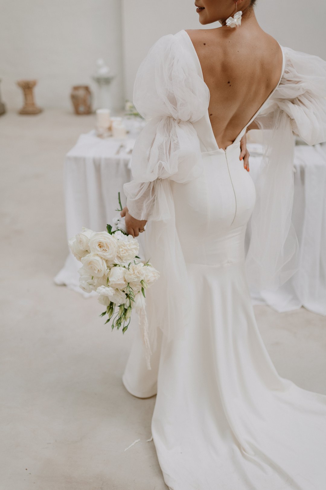 Die model, geklee in ʼn trourok wat perfek pas by die styl van die fotosessie, straal elegansie uit met die pofferige moue en oop rug. Die rok se unieke ontwerp is ʼn perfekte pasmaat vir die tydlose tema.