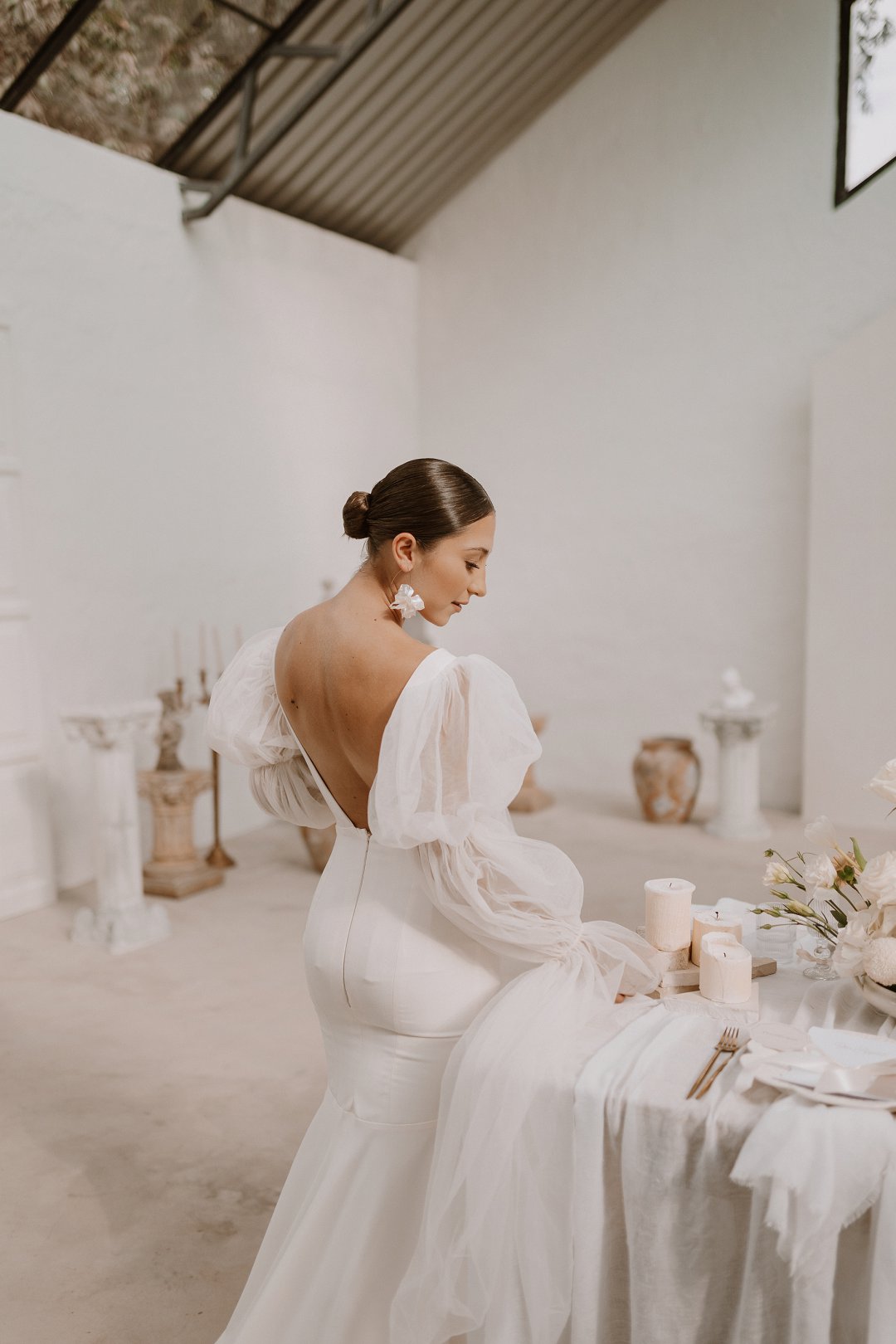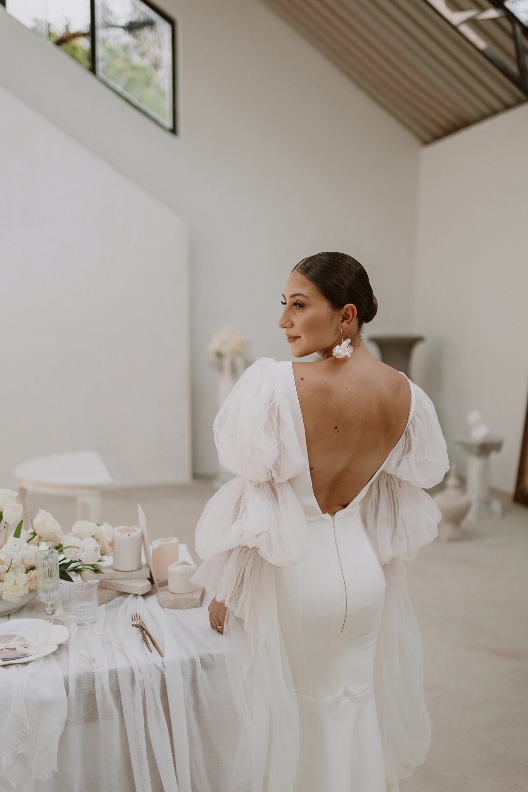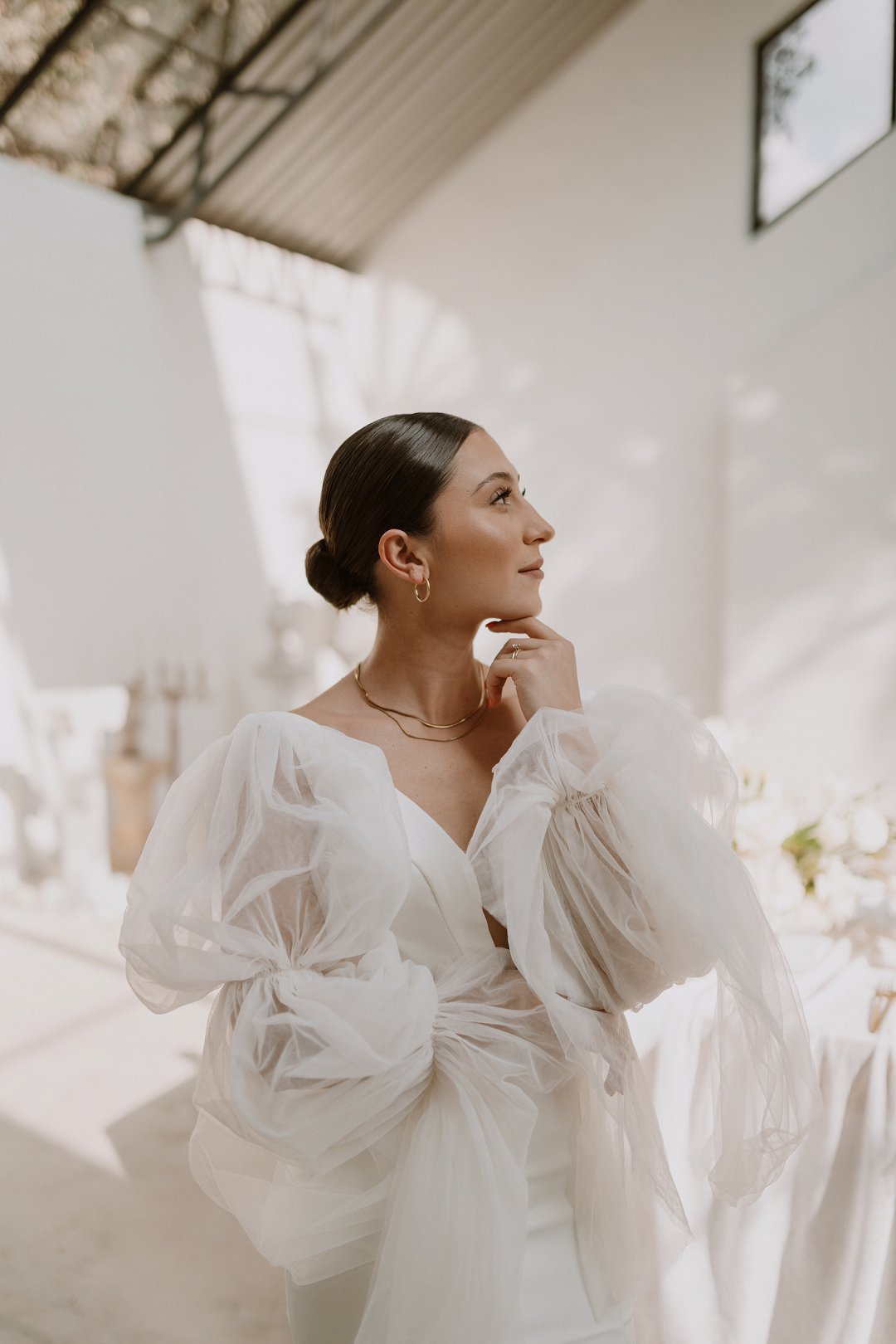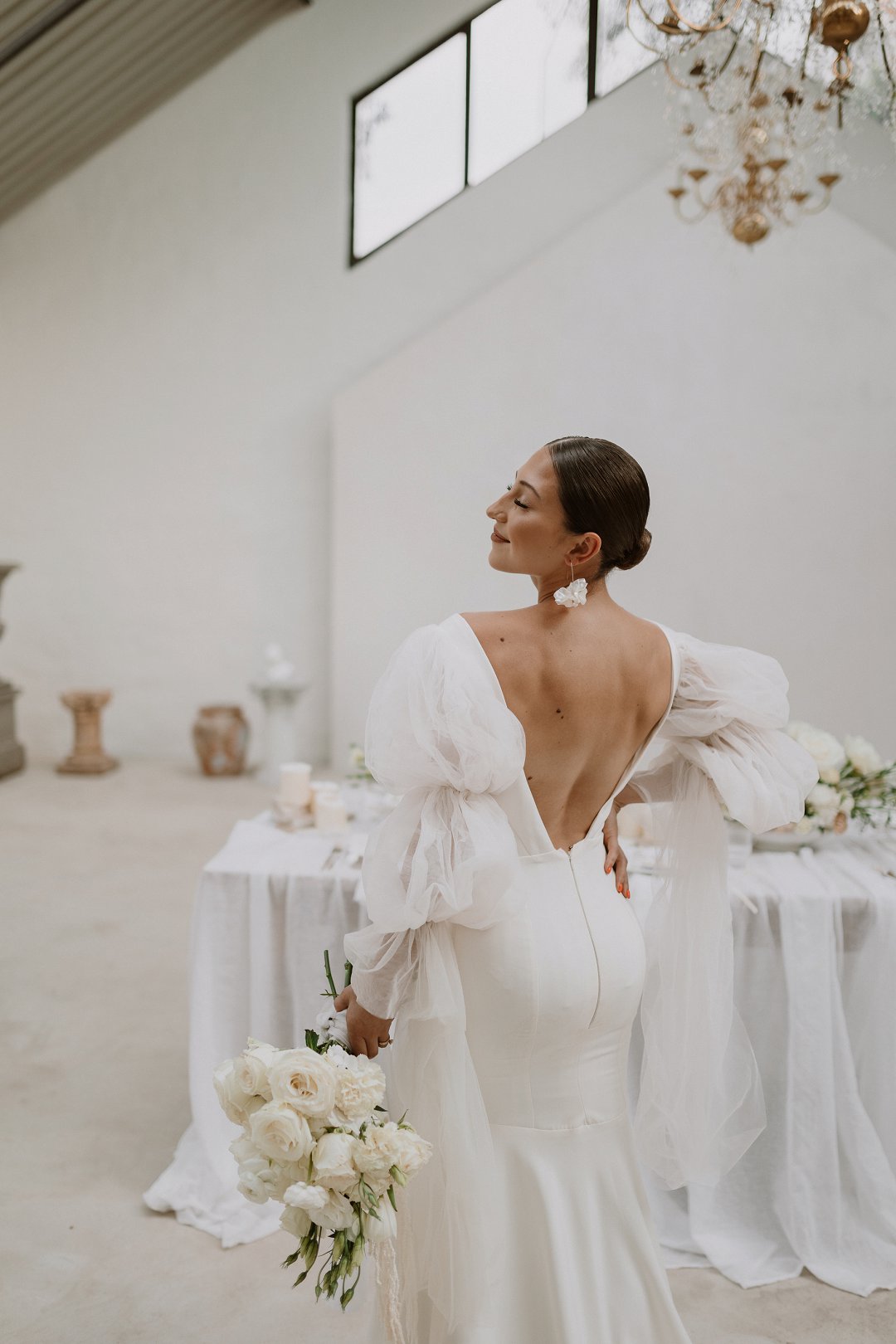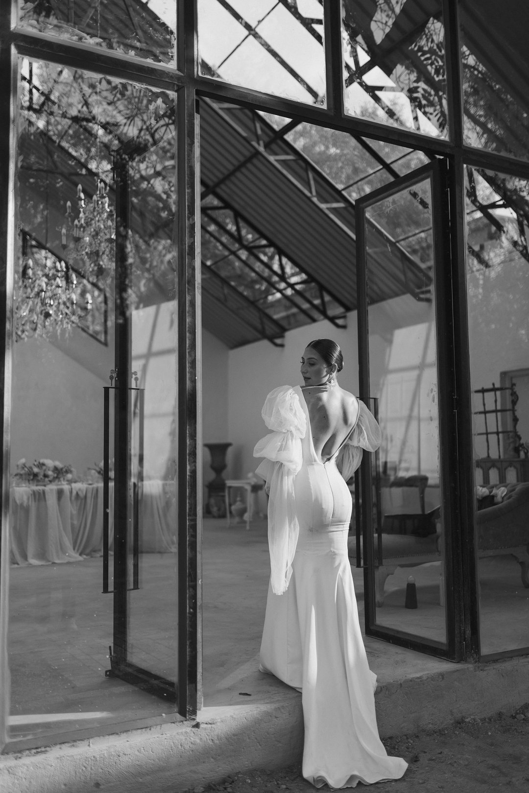 Die model, geklee in ʼn trourok wat perfek pas by die styl van die fotosessie, straal elegansie uit met die pofferige moue en oop rug. Die rok se unieke ontwerp is ʼn perfekte pasmaat vir die tydlose tema.