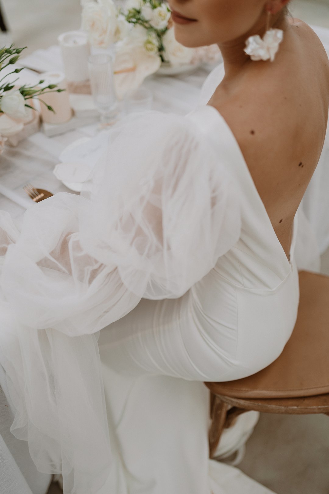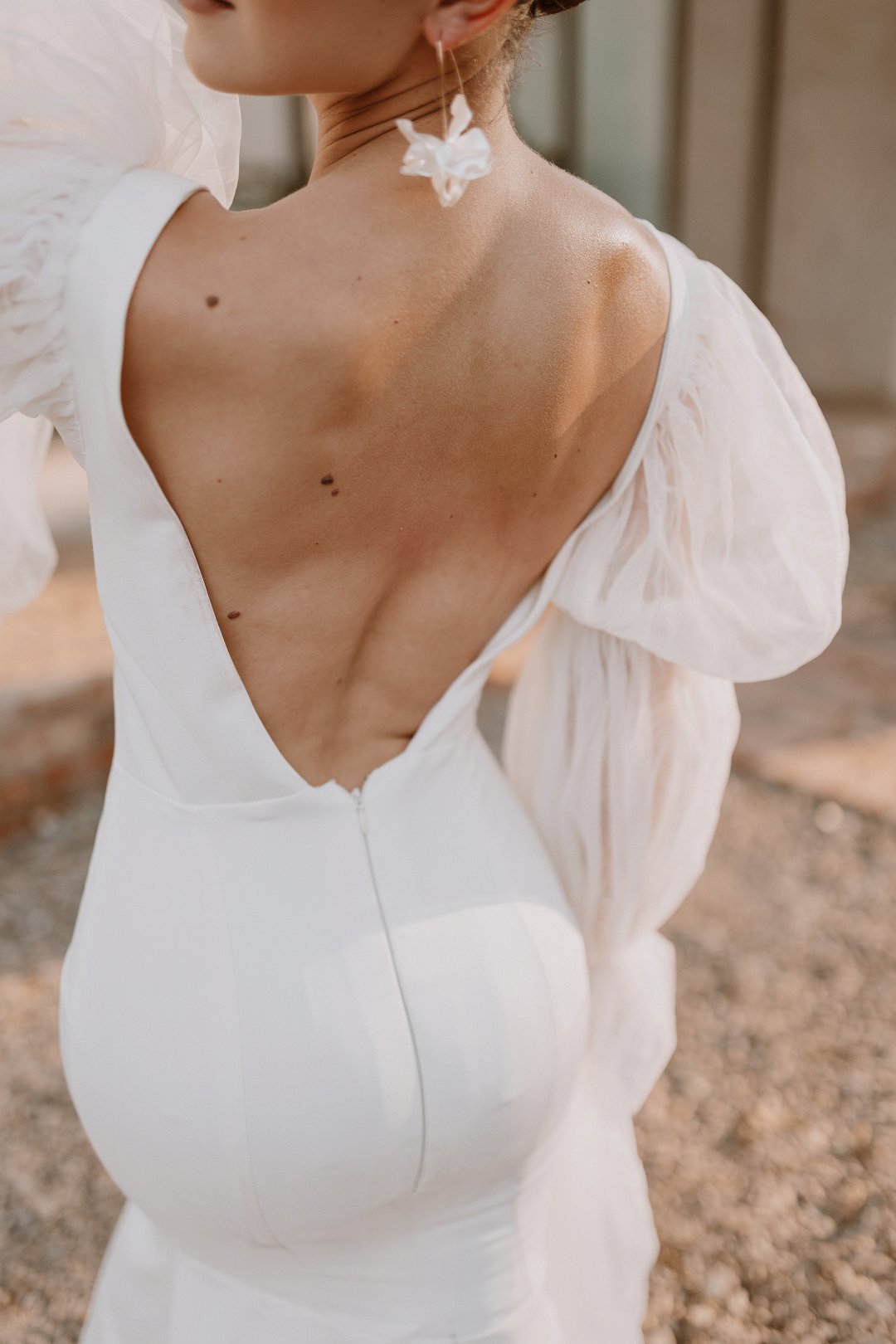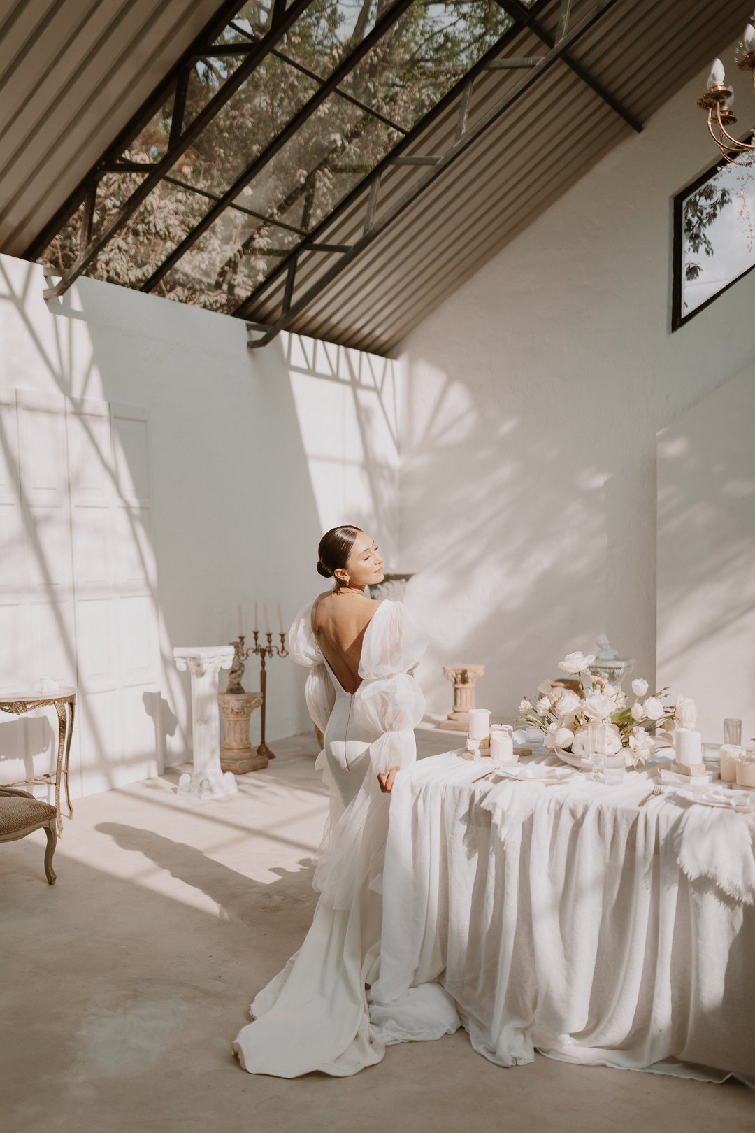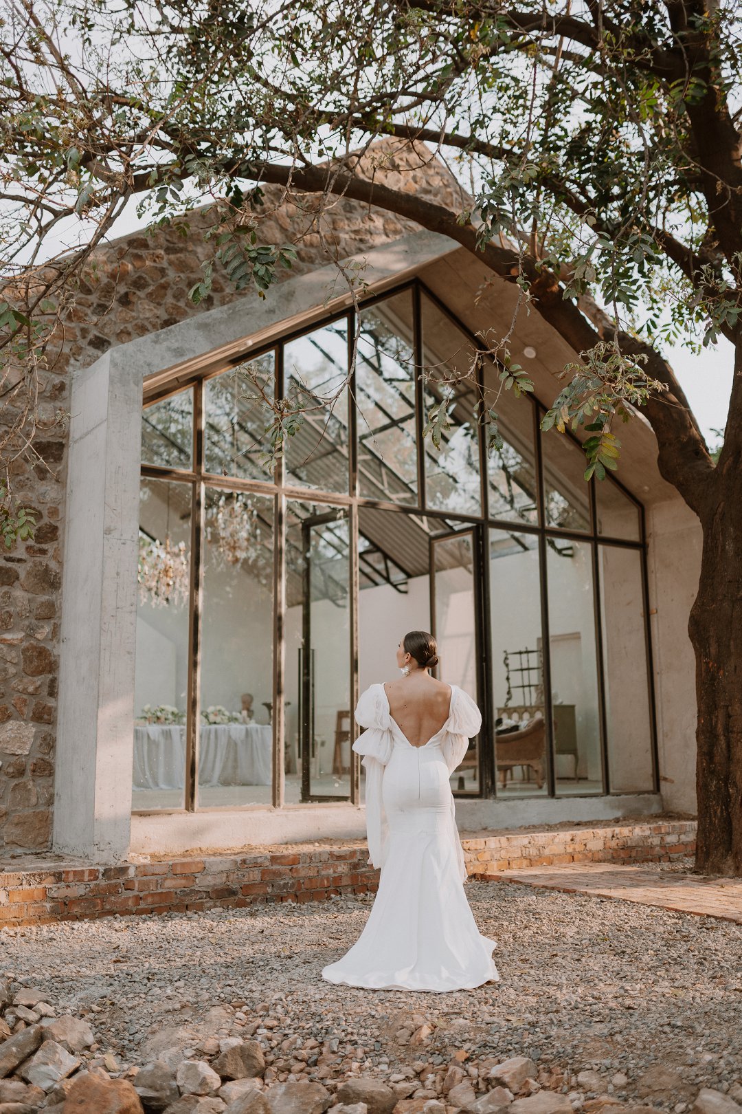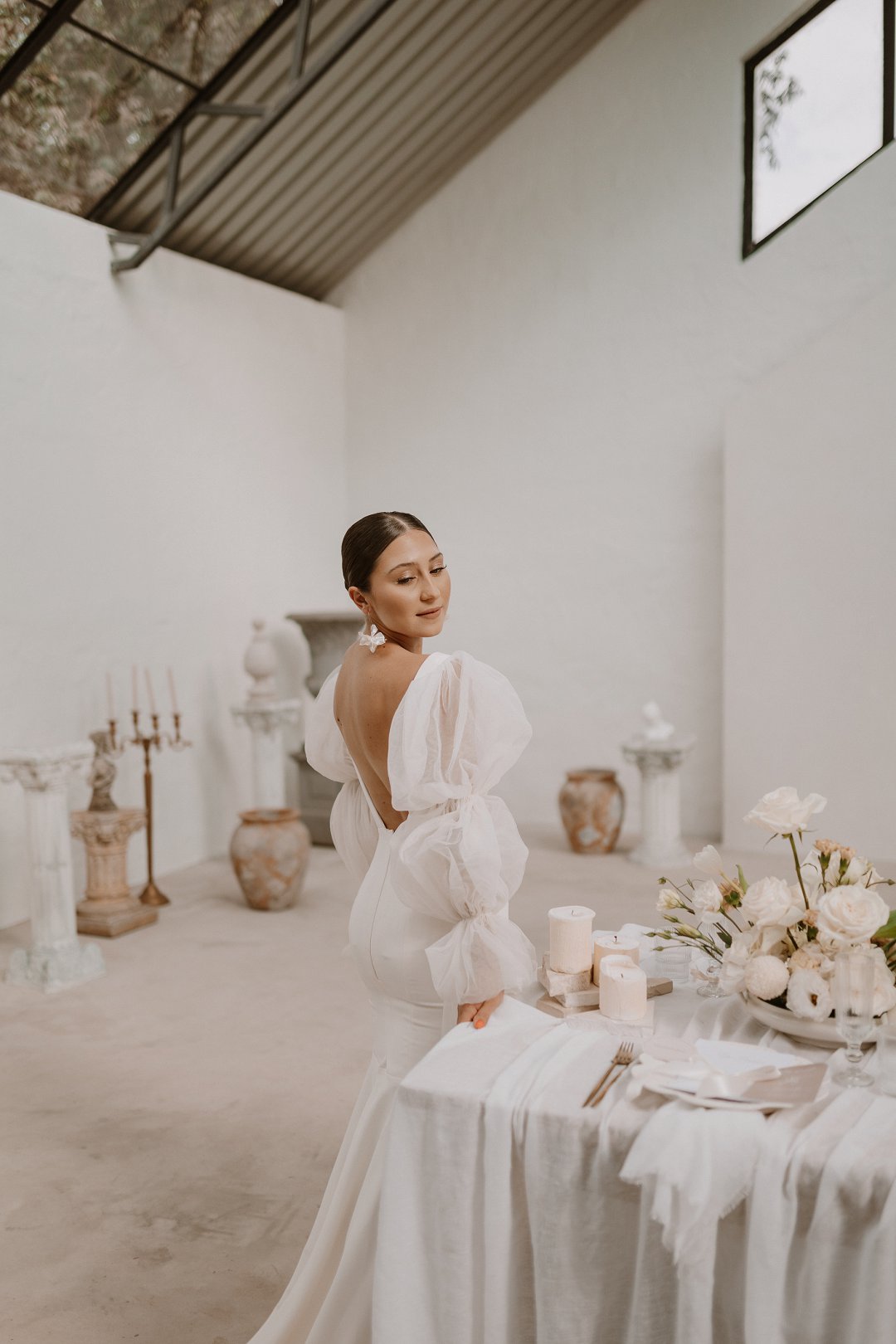 Die model, geklee in ʼn trourok wat perfek pas by die styl van die fotosessie, straal elegansie uit met die pofferige moue en oop rug. Die rok se unieke ontwerp is ʼn perfekte pasmaat vir die tydlose tema.