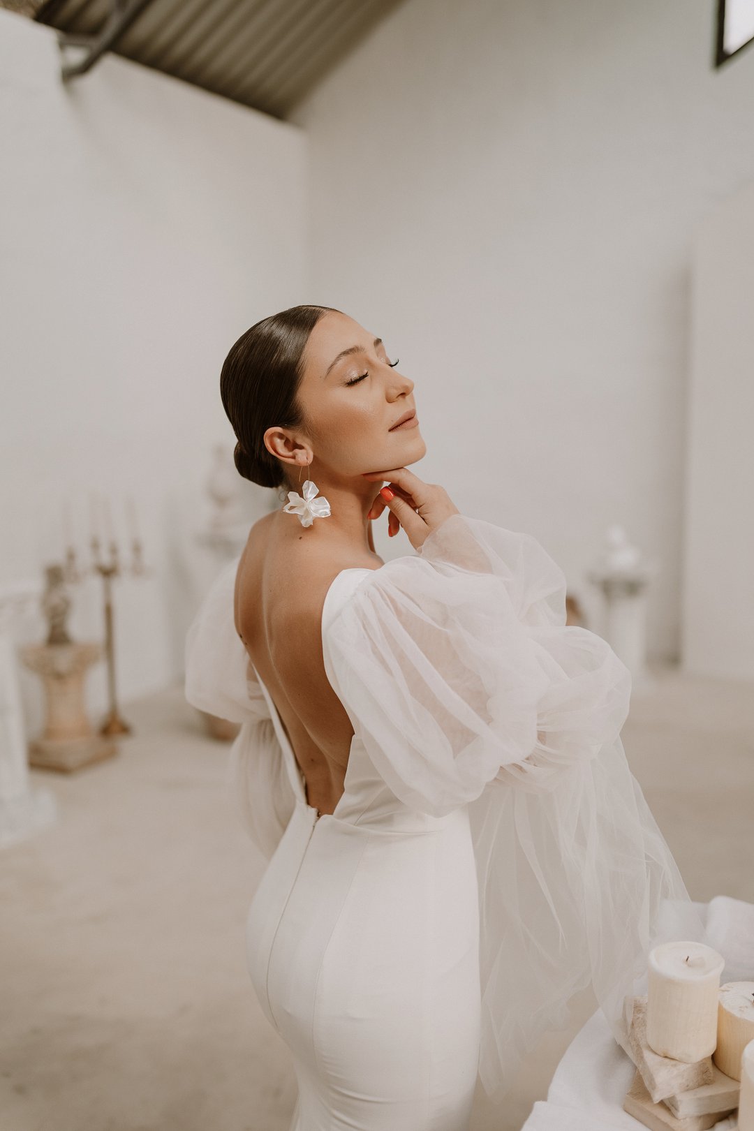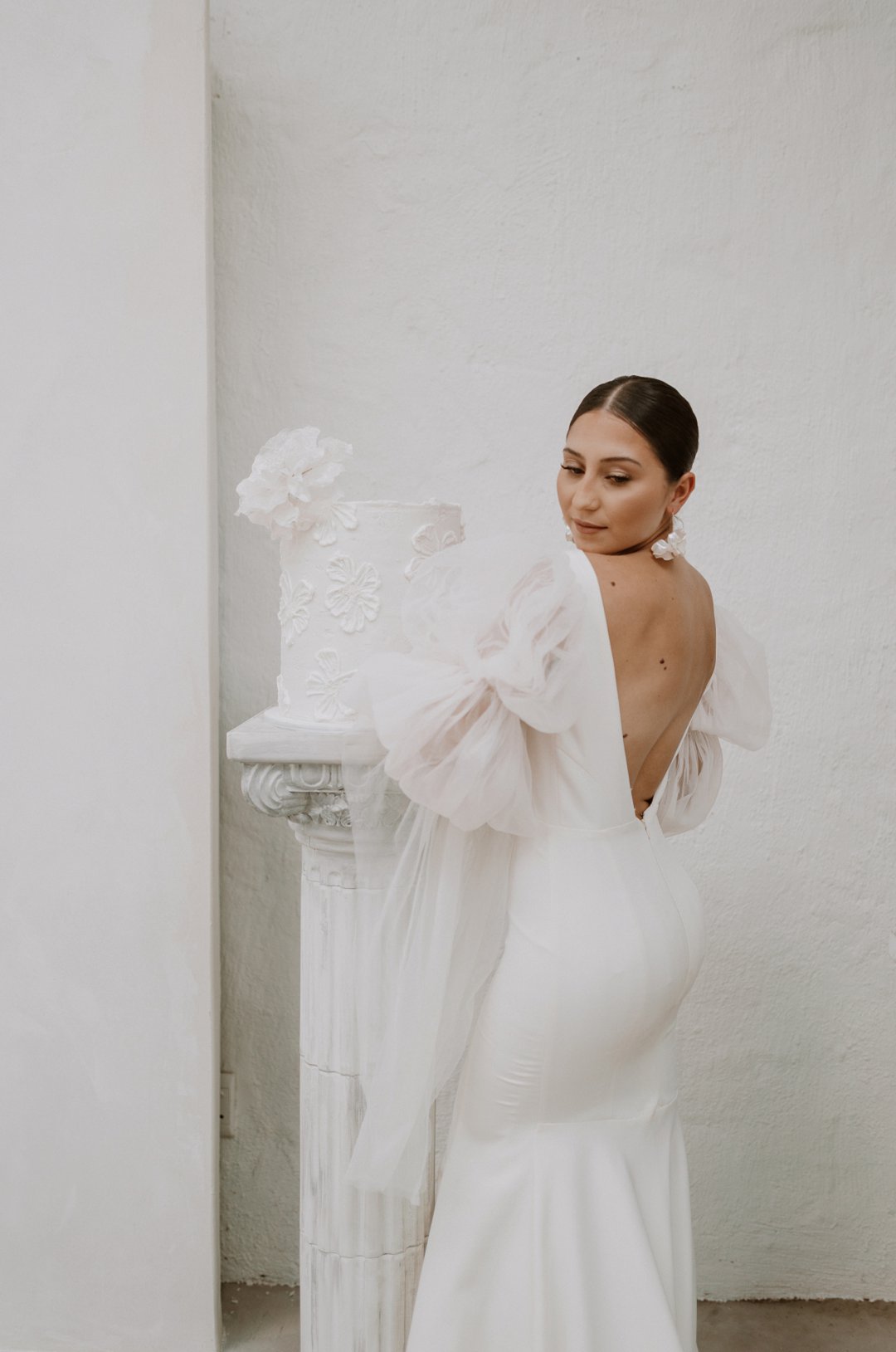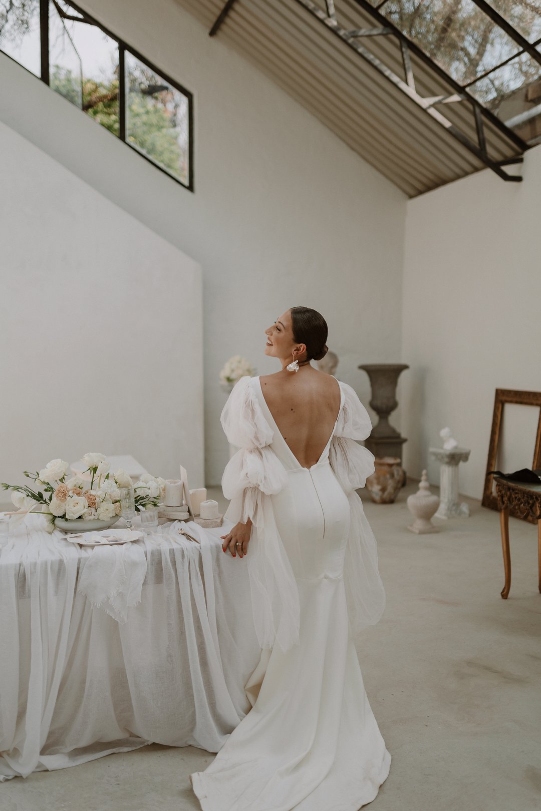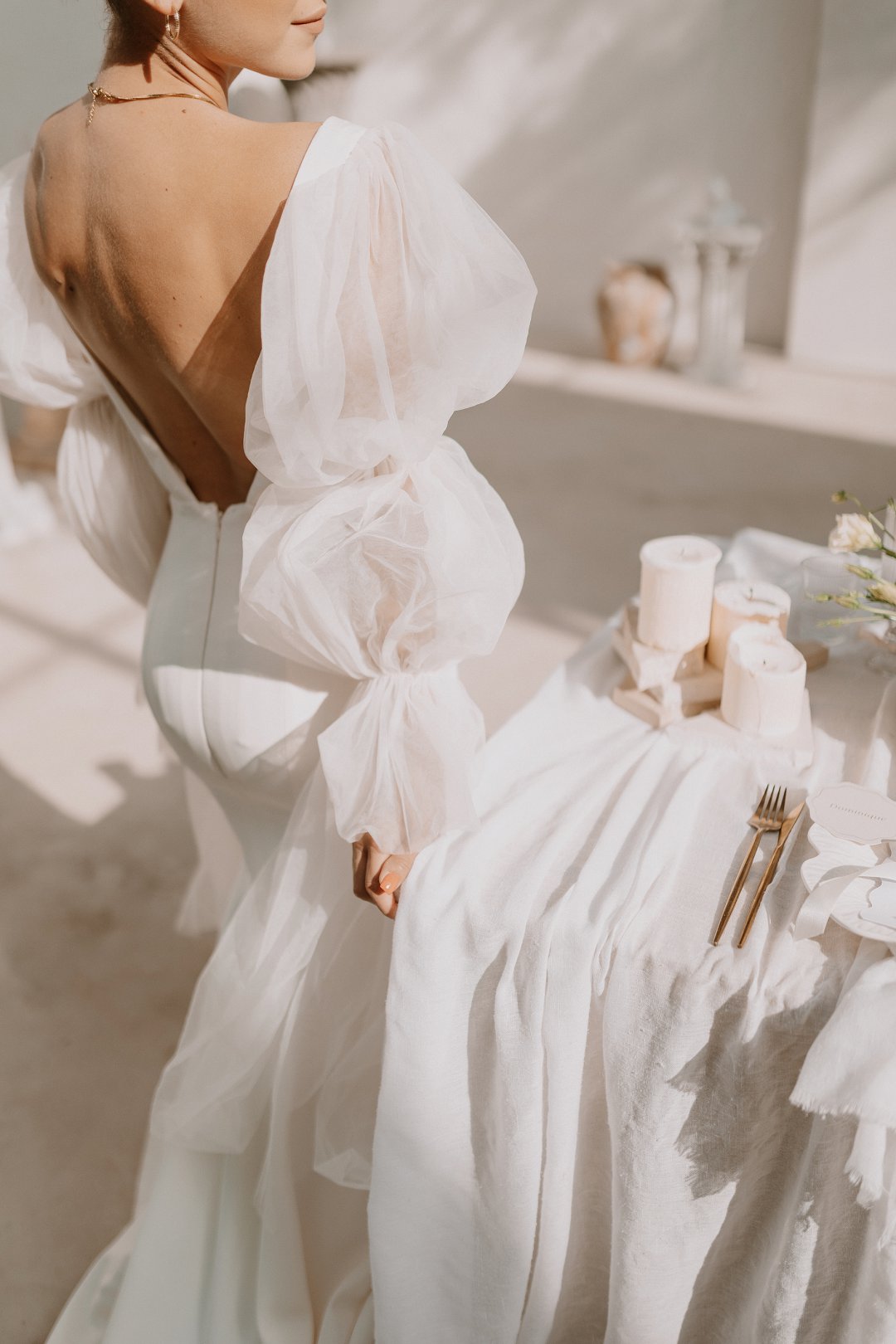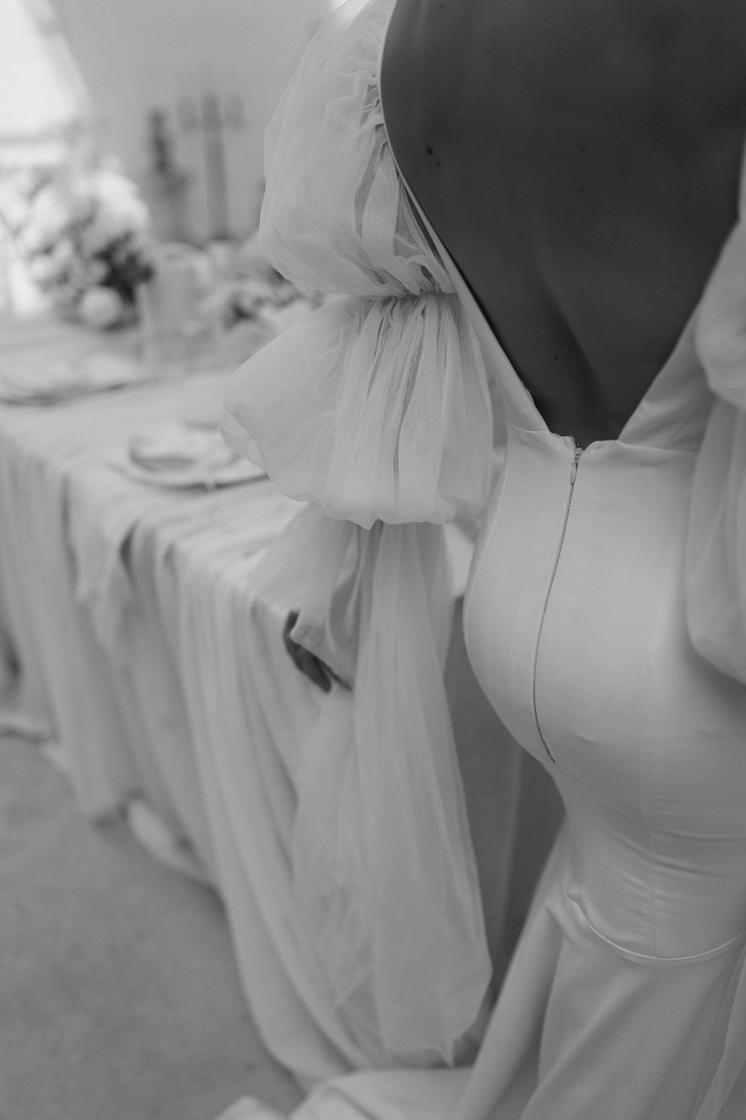 Die model, geklee in ʼn trourok wat perfek pas by die styl van die fotosessie, straal elegansie uit met die pofferige moue en oop rug. Die rok se unieke ontwerp is ʼn perfekte pasmaat vir die tydlose tema.