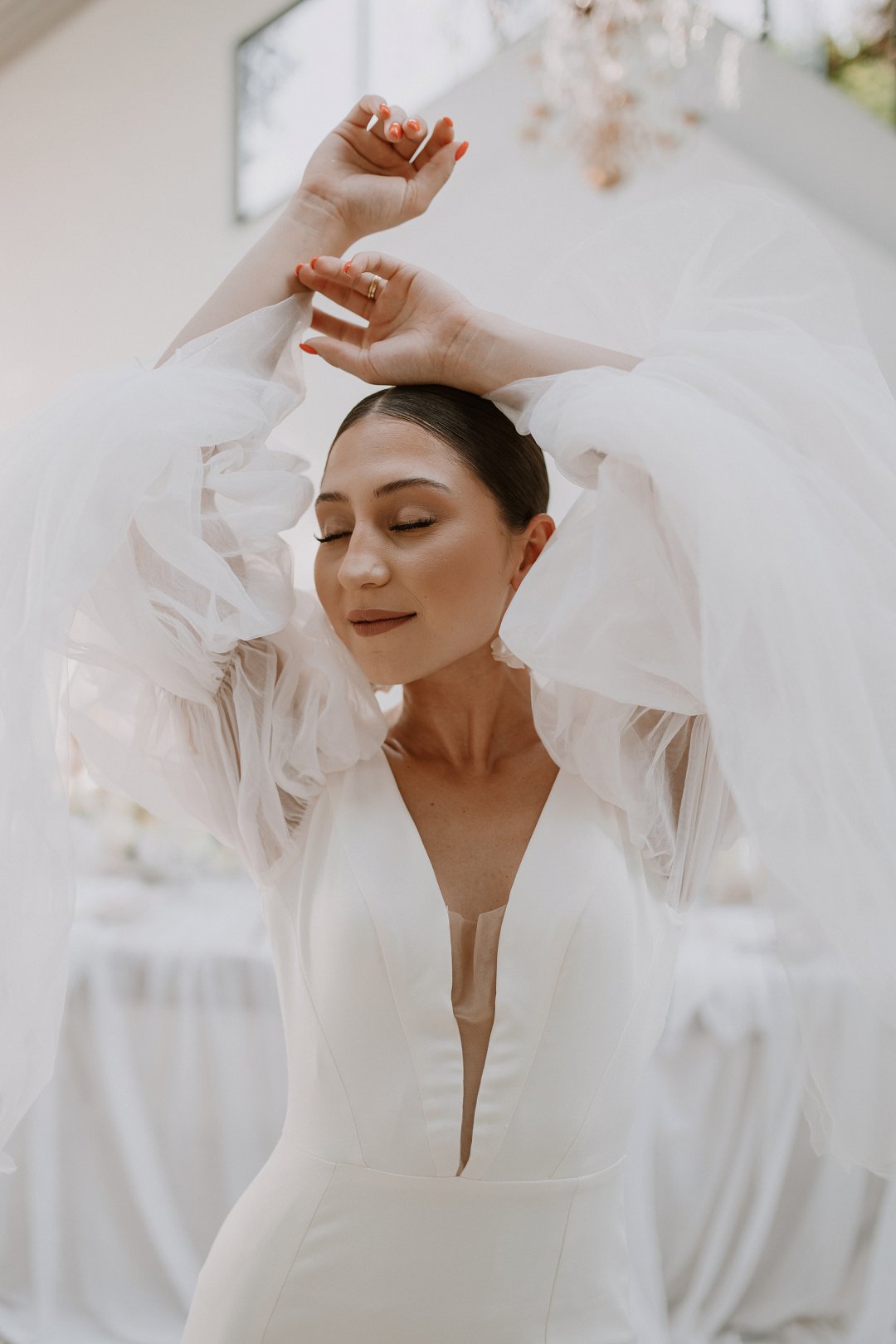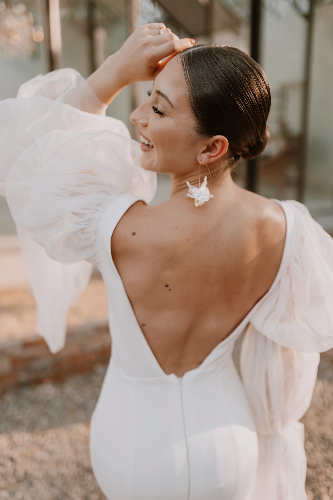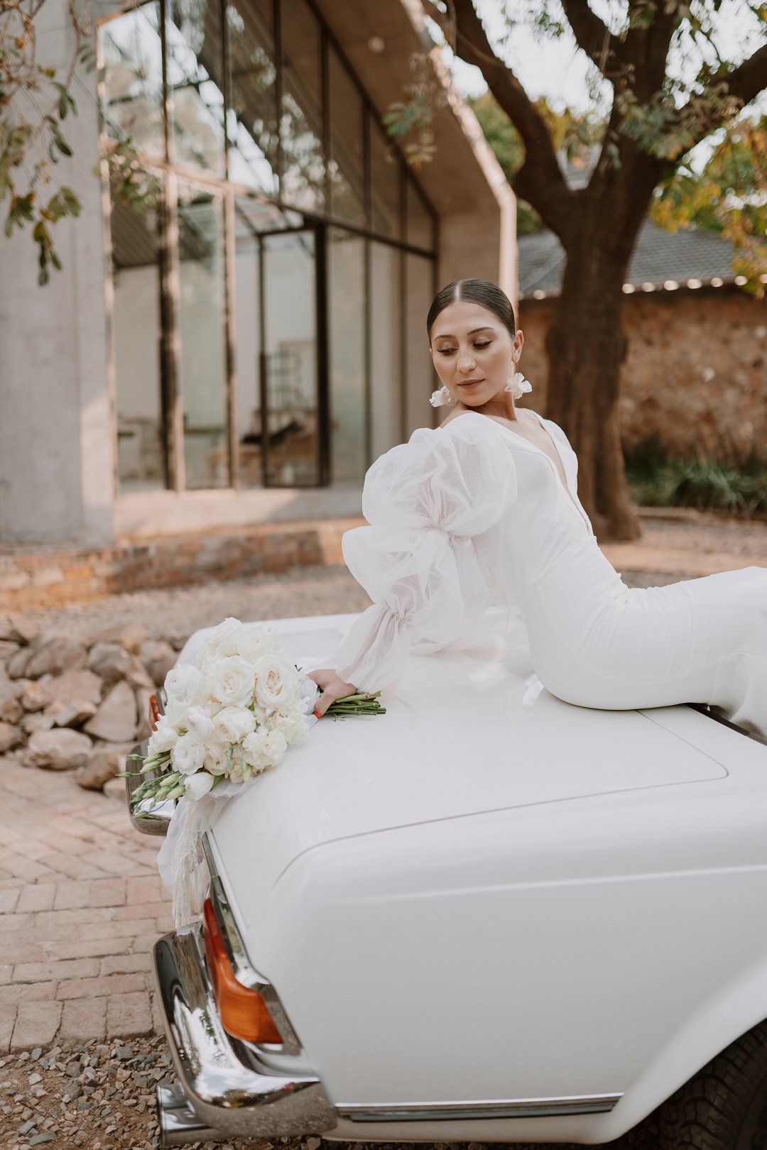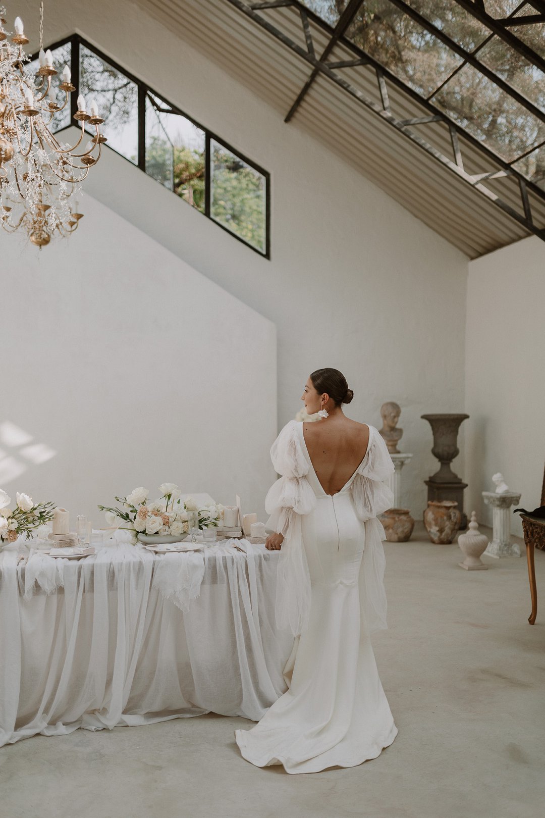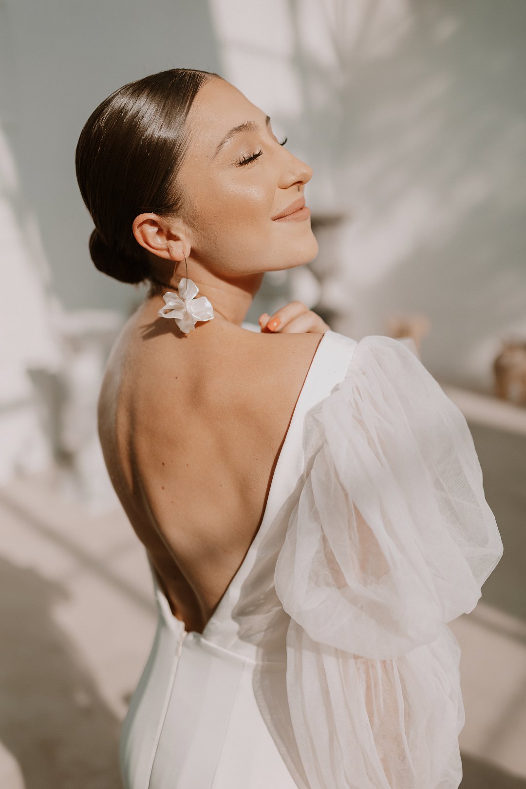 Die model, geklee in ʼn trourok wat perfek pas by die styl van die fotosessie, straal elegansie uit met die pofferige moue en oop rug. Die rok se unieke ontwerp is ʼn perfekte pasmaat vir die tydlose tema.