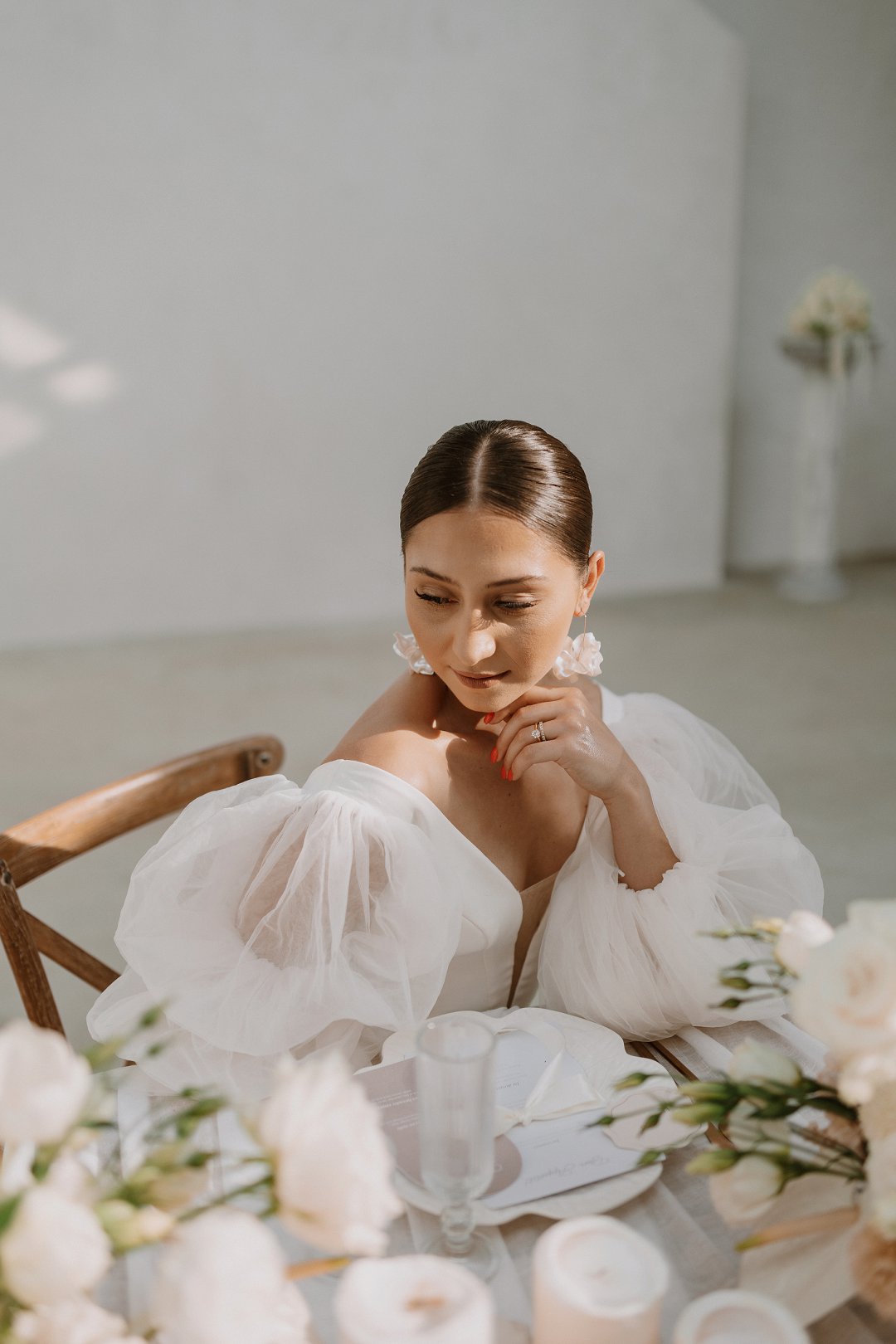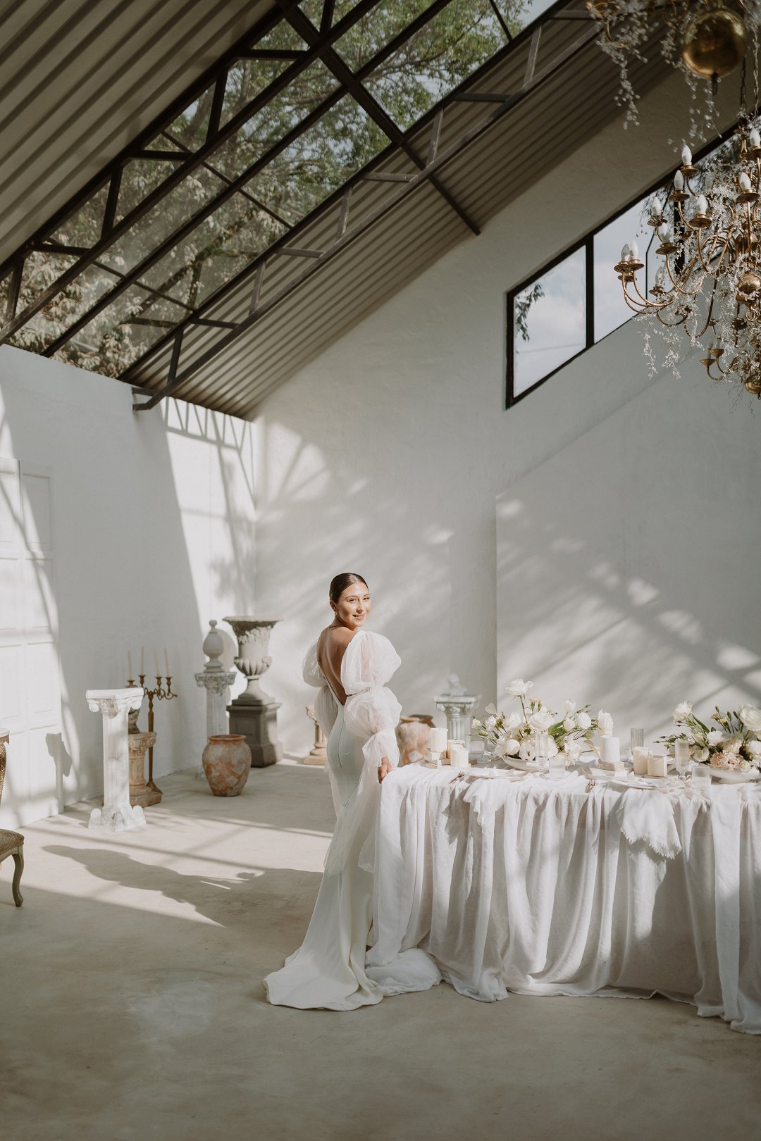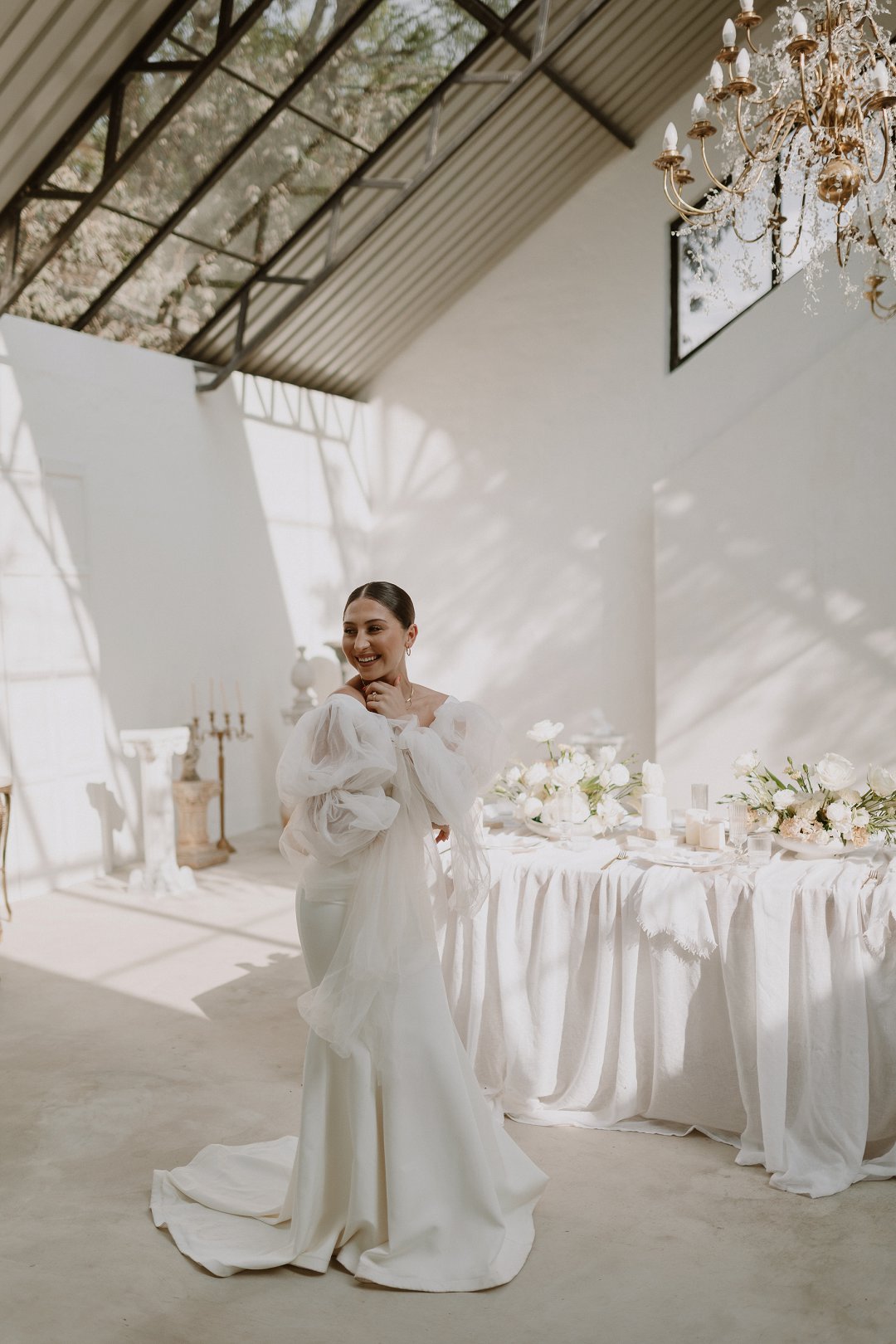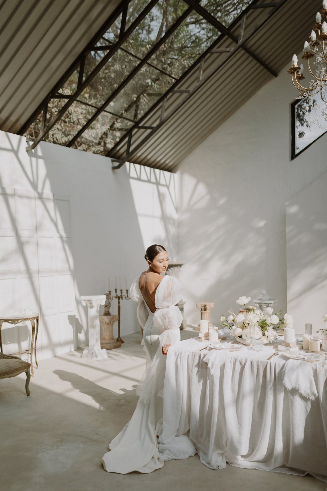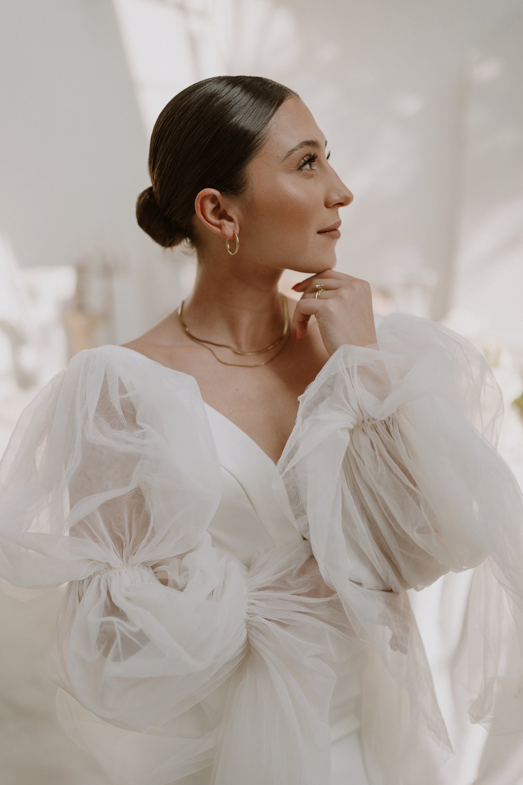 Die model, geklee in ʼn trourok wat perfek pas by die styl van die fotosessie, straal elegansie uit met die pofferige moue en oop rug. Die rok se unieke ontwerp is ʼn perfekte pasmaat vir die tydlose tema.