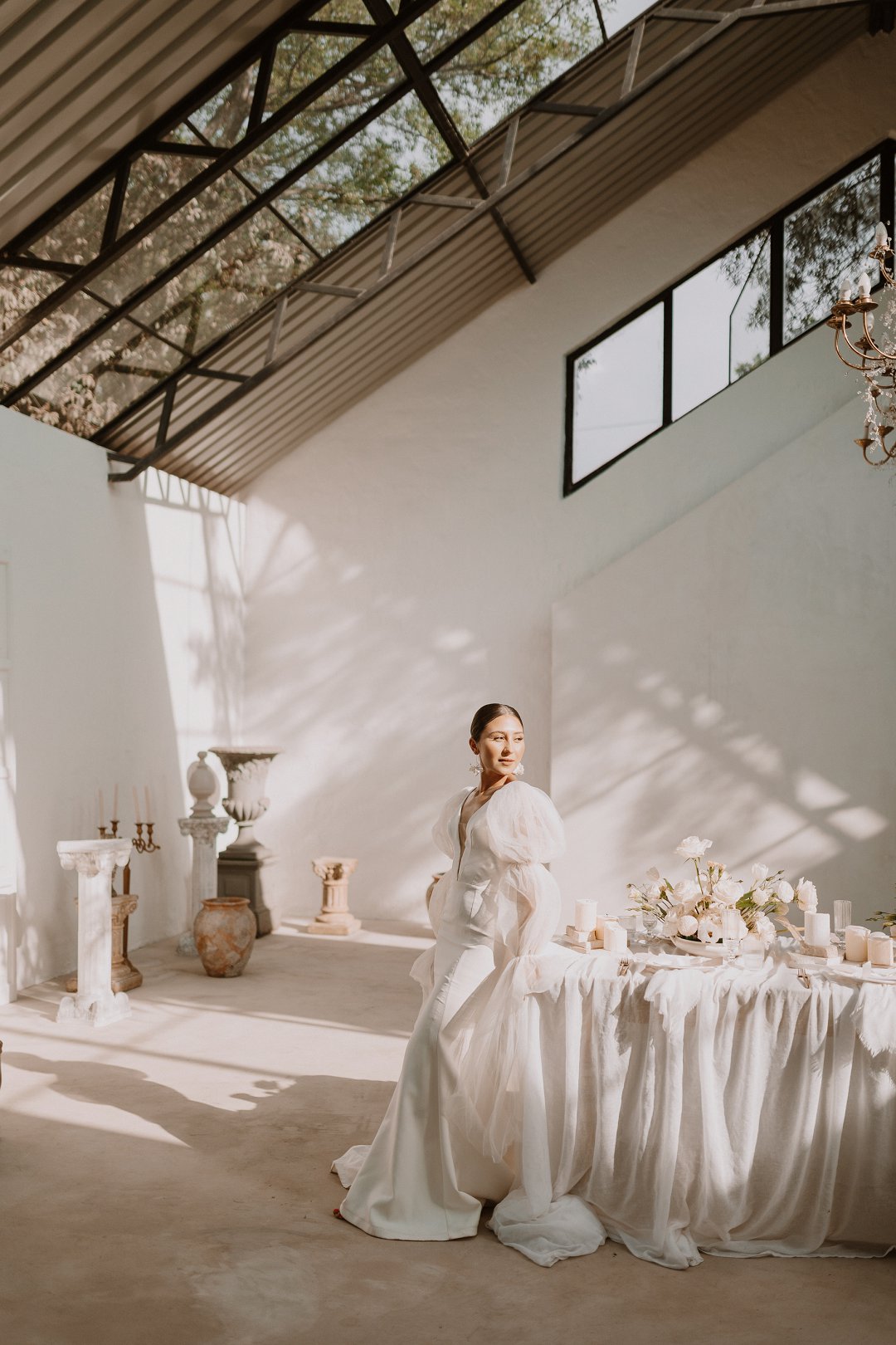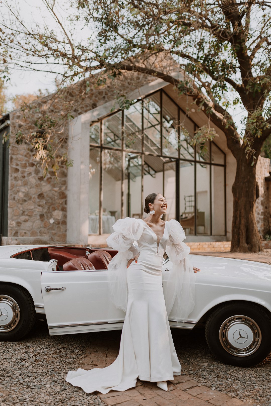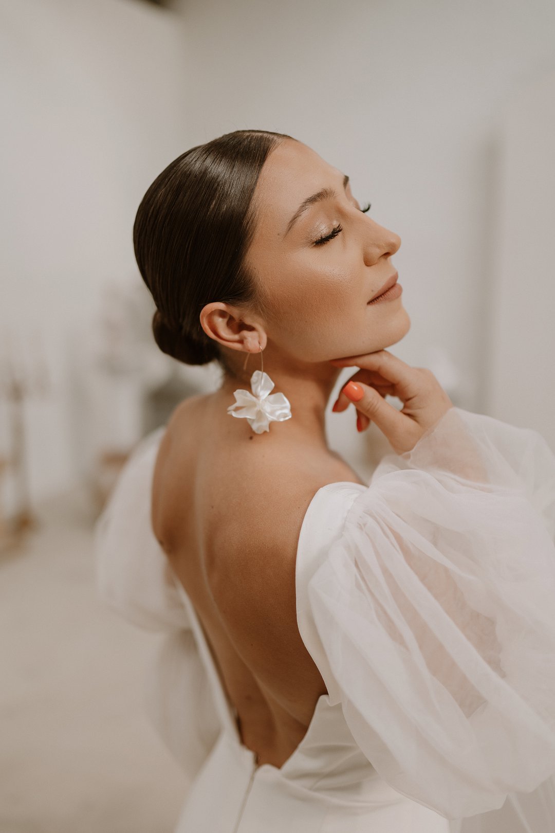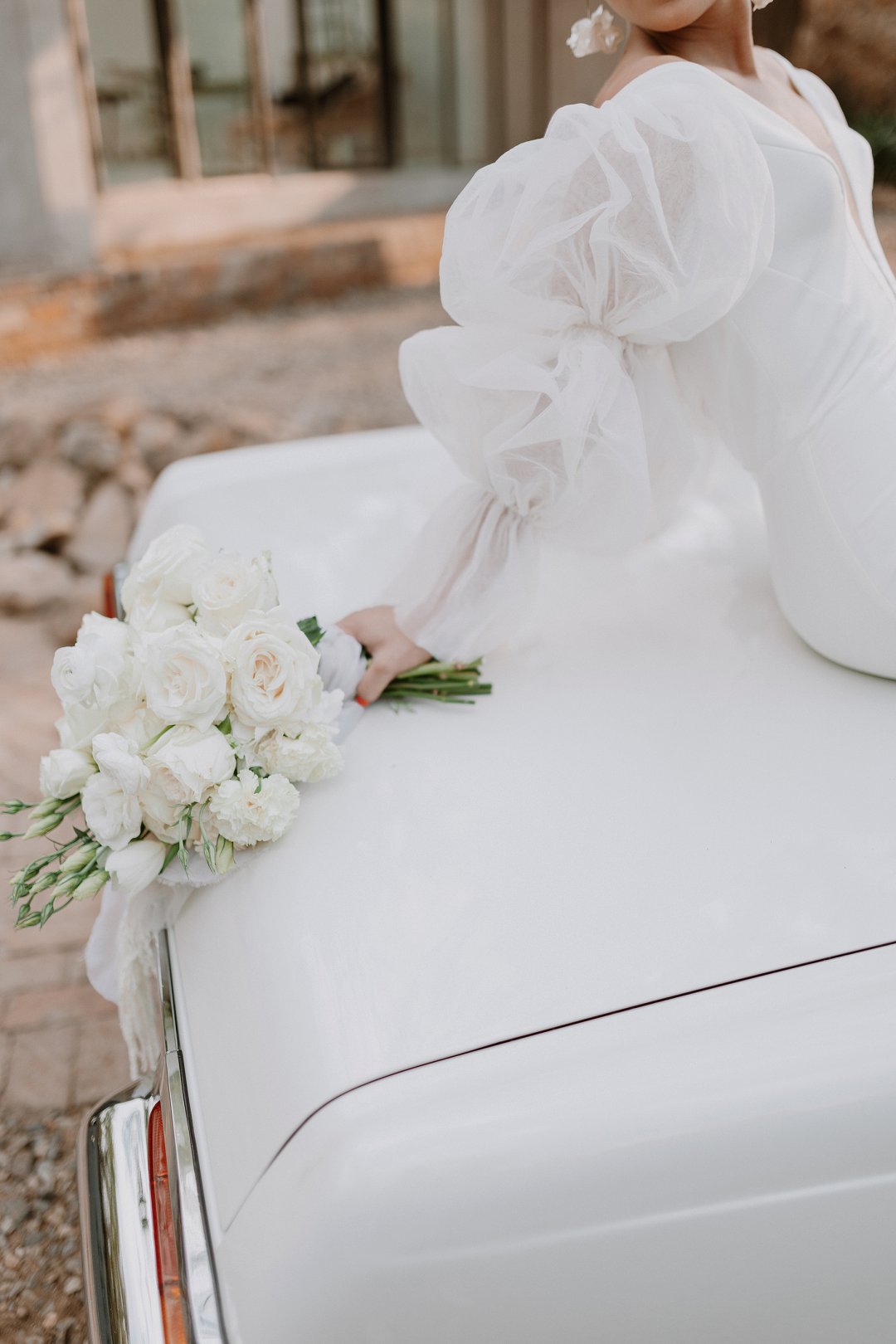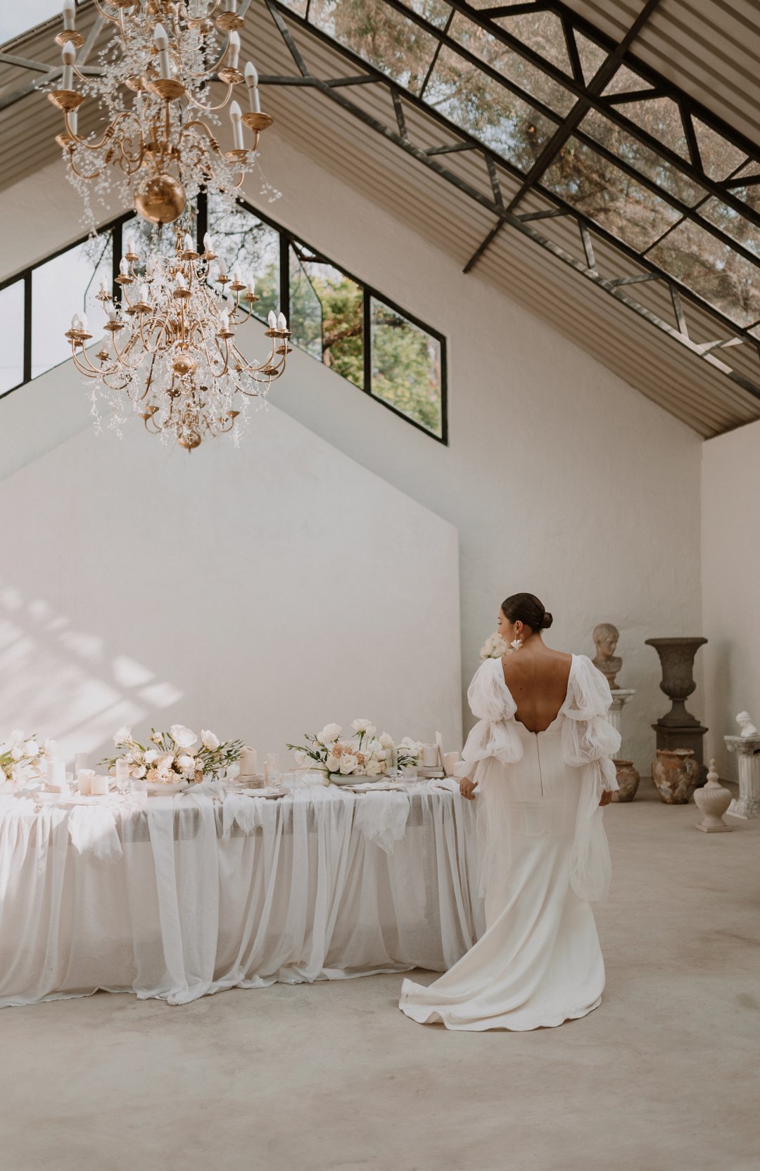Die model, geklee in ʼn trourok wat perfek pas by die styl van die fotosessie, straal elegansie uit met die pofferige moue en oop rug. Die rok se unieke ontwerp is ʼn perfekte pasmaat vir die tydlose tema.