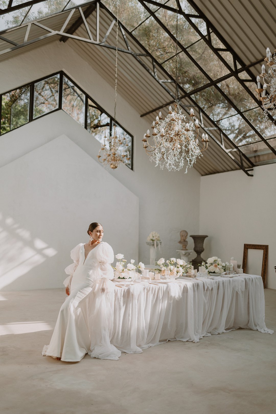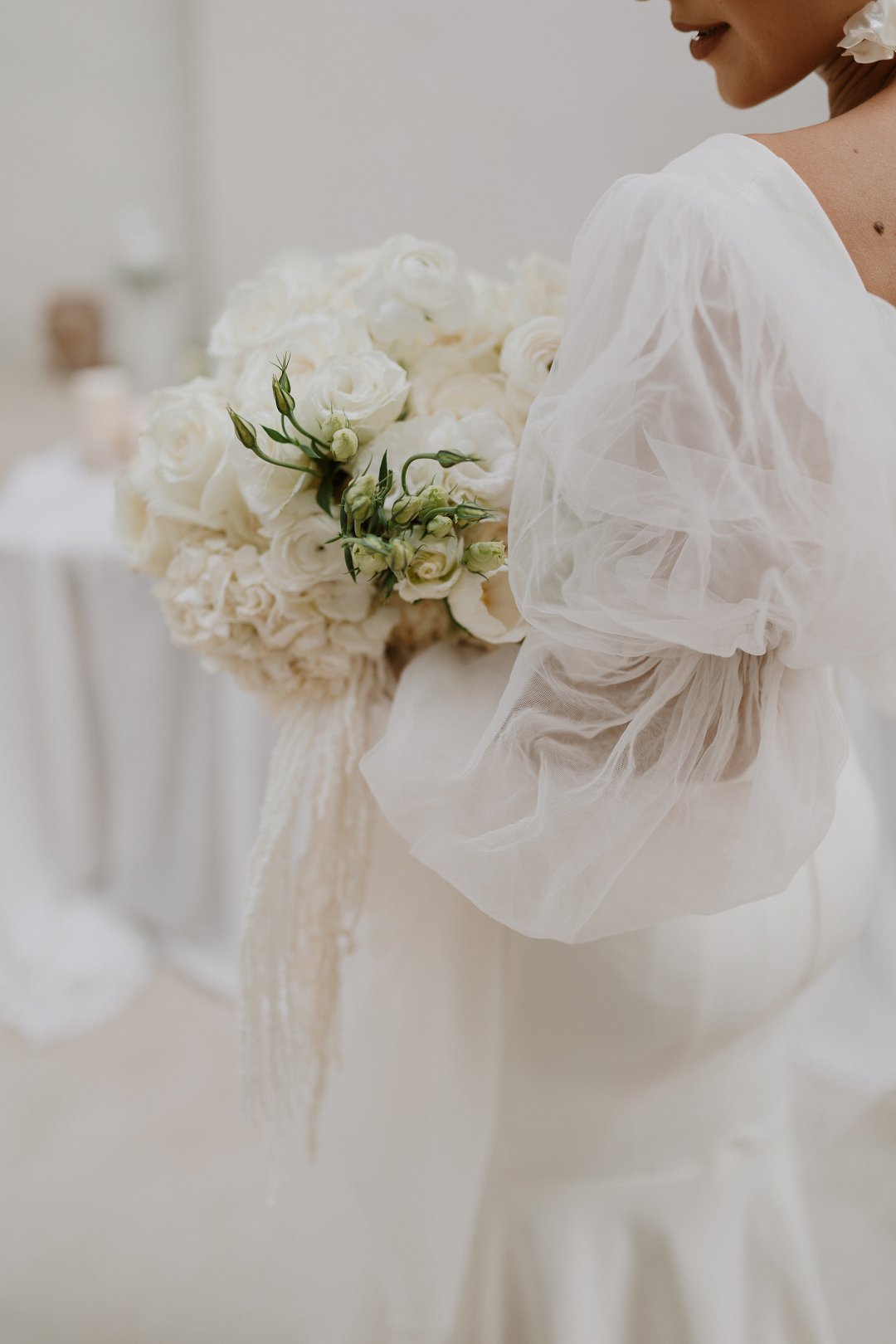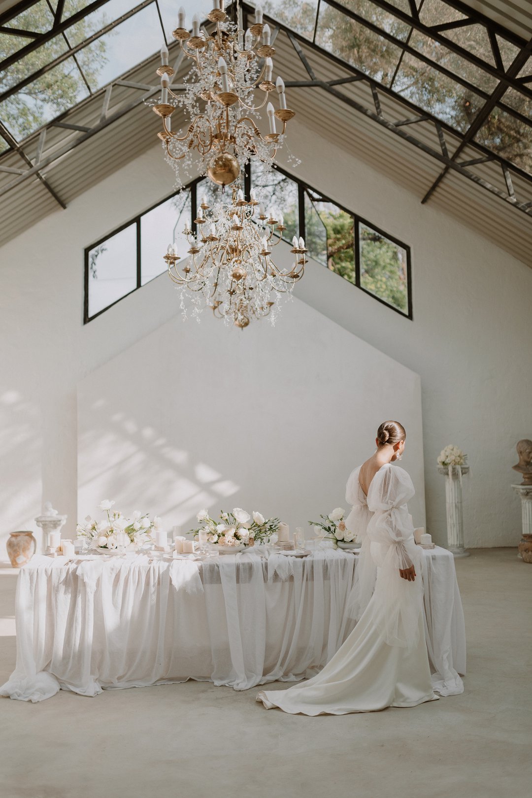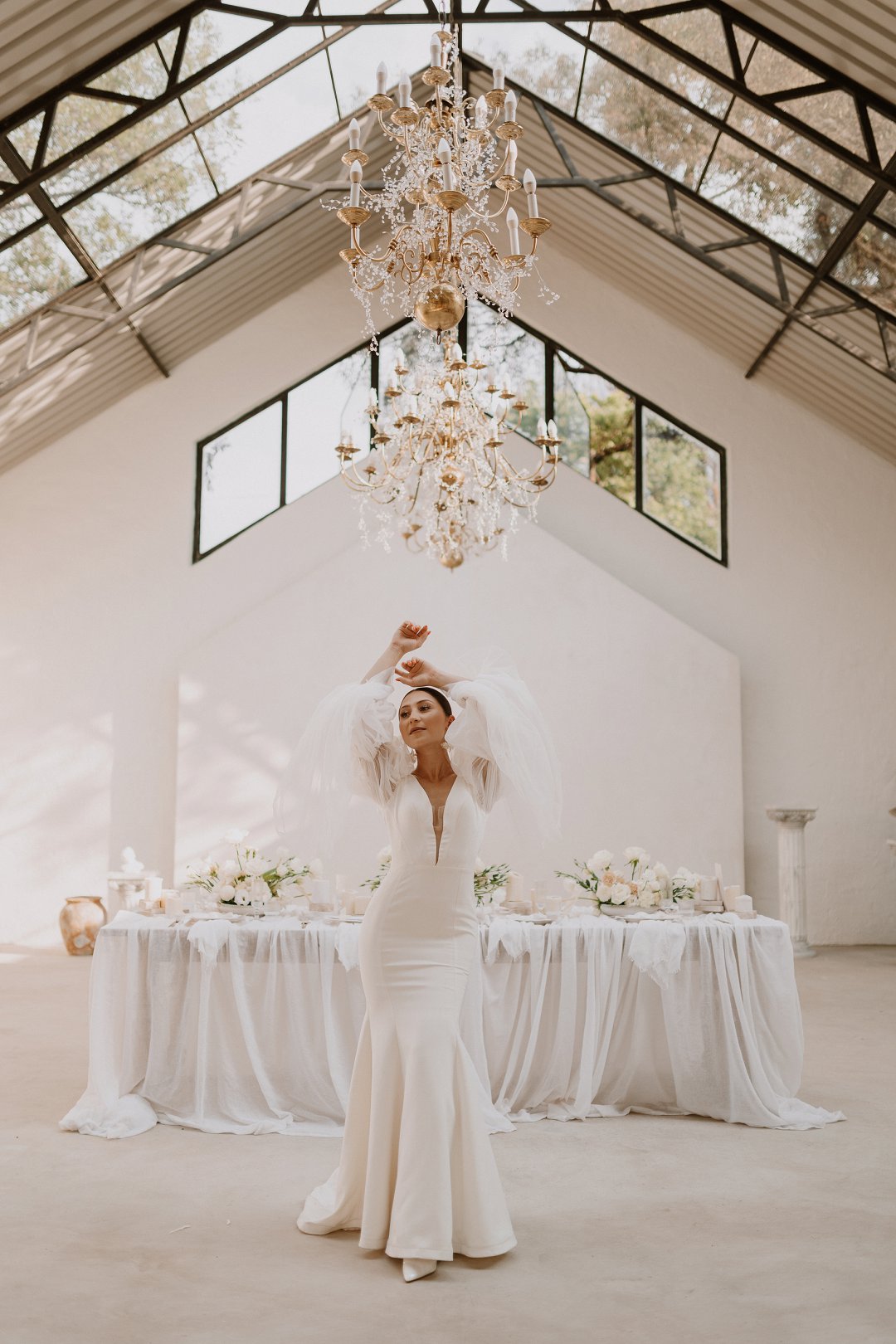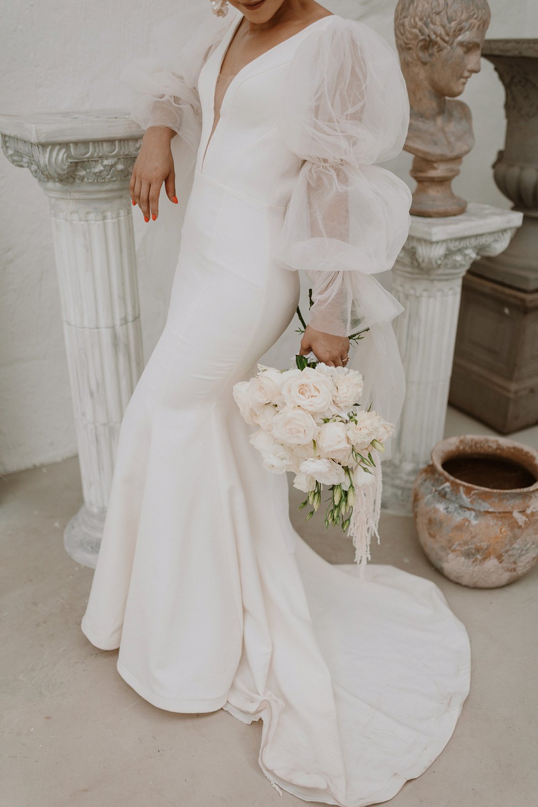 Die model, geklee in ʼn trourok wat perfek pas by die styl van die fotosessie, straal elegansie uit met die pofferige moue en oop rug. Die rok se unieke ontwerp is ʼn perfekte pasmaat vir die tydlose tema.