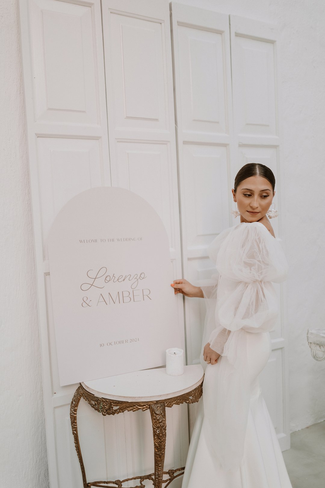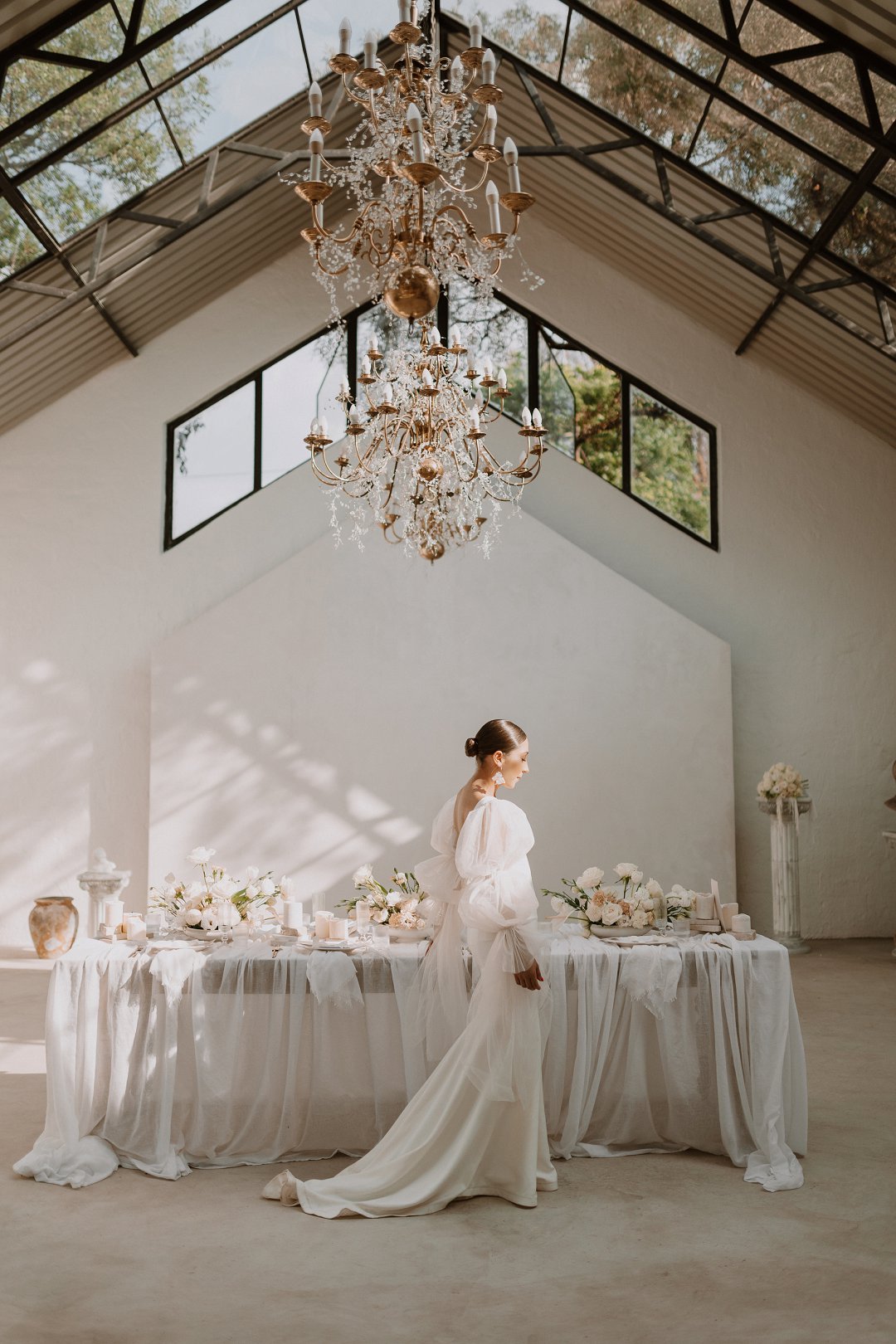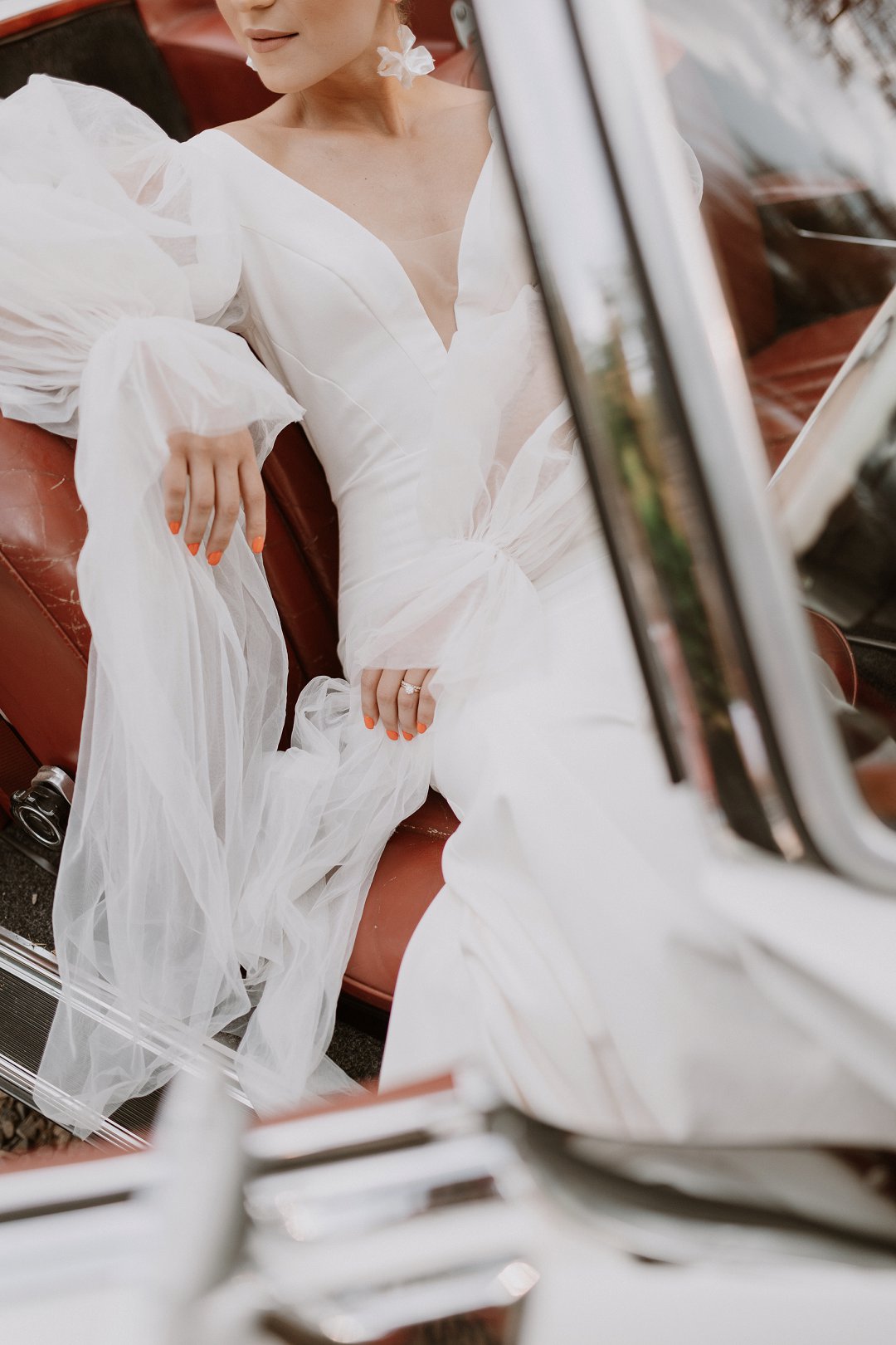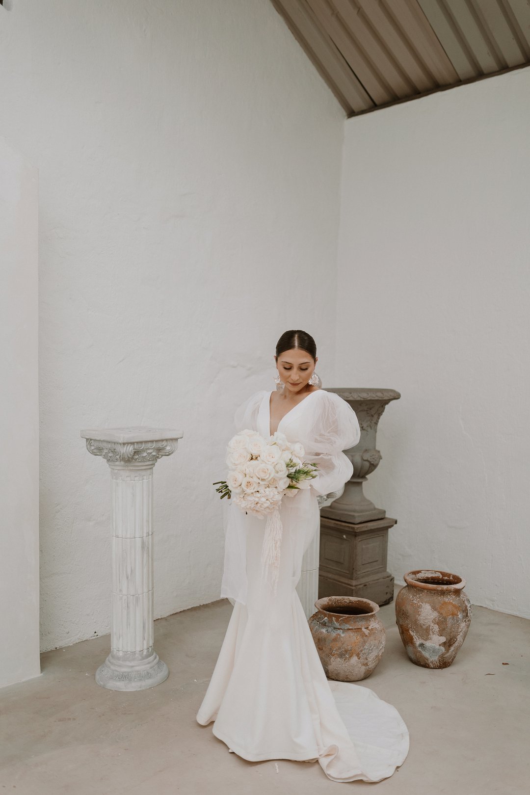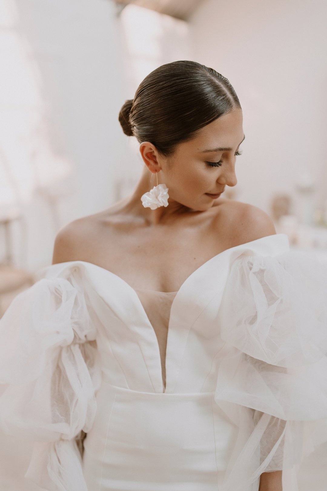 Die model, geklee in ʼn trourok wat perfek pas by die styl van die fotosessie, straal elegansie uit met die pofferige moue en oop rug. Die rok se unieke ontwerp is ʼn perfekte pasmaat vir die tydlose tema.