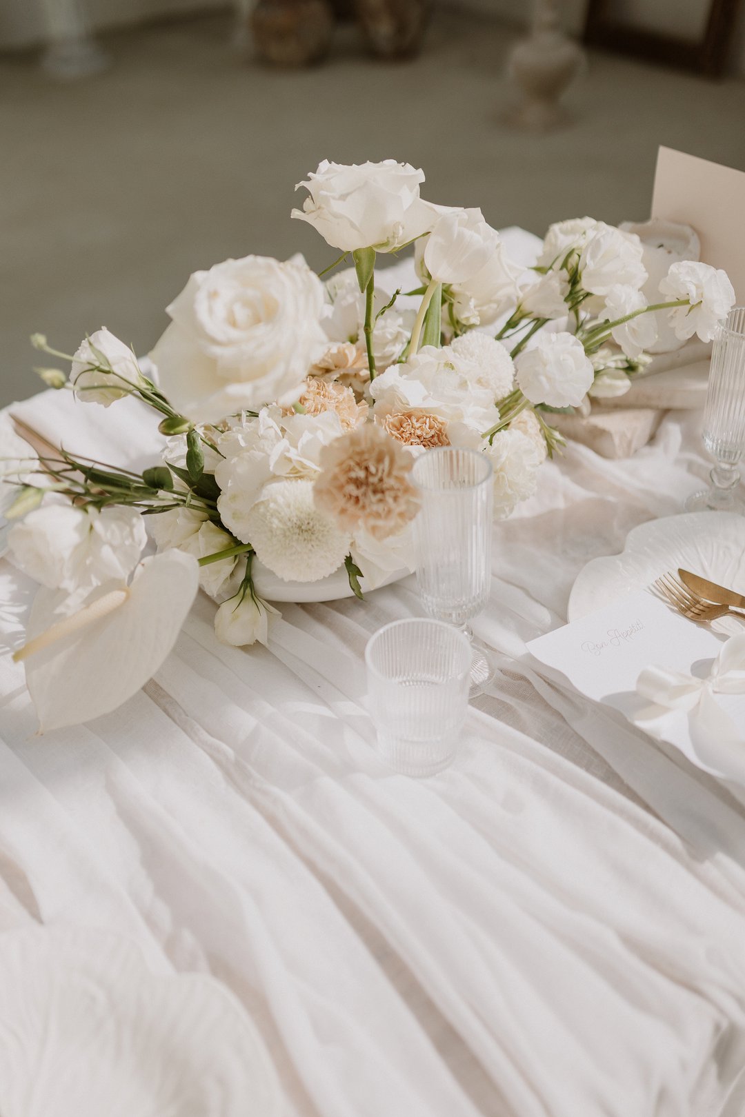 Tafellinne en lopers: Ons het sagte, neutrale linne gekies om ʼn kalm, tydlose basis te skep, wat die ander elemente toelaat om uit te staan sonder om die ontwerp te oorweldig. ’n Fyn, getekstureerde loper in ’n komplementêre skakering het diepte bygevoeg en die fokus op die middelpunt geplaas.