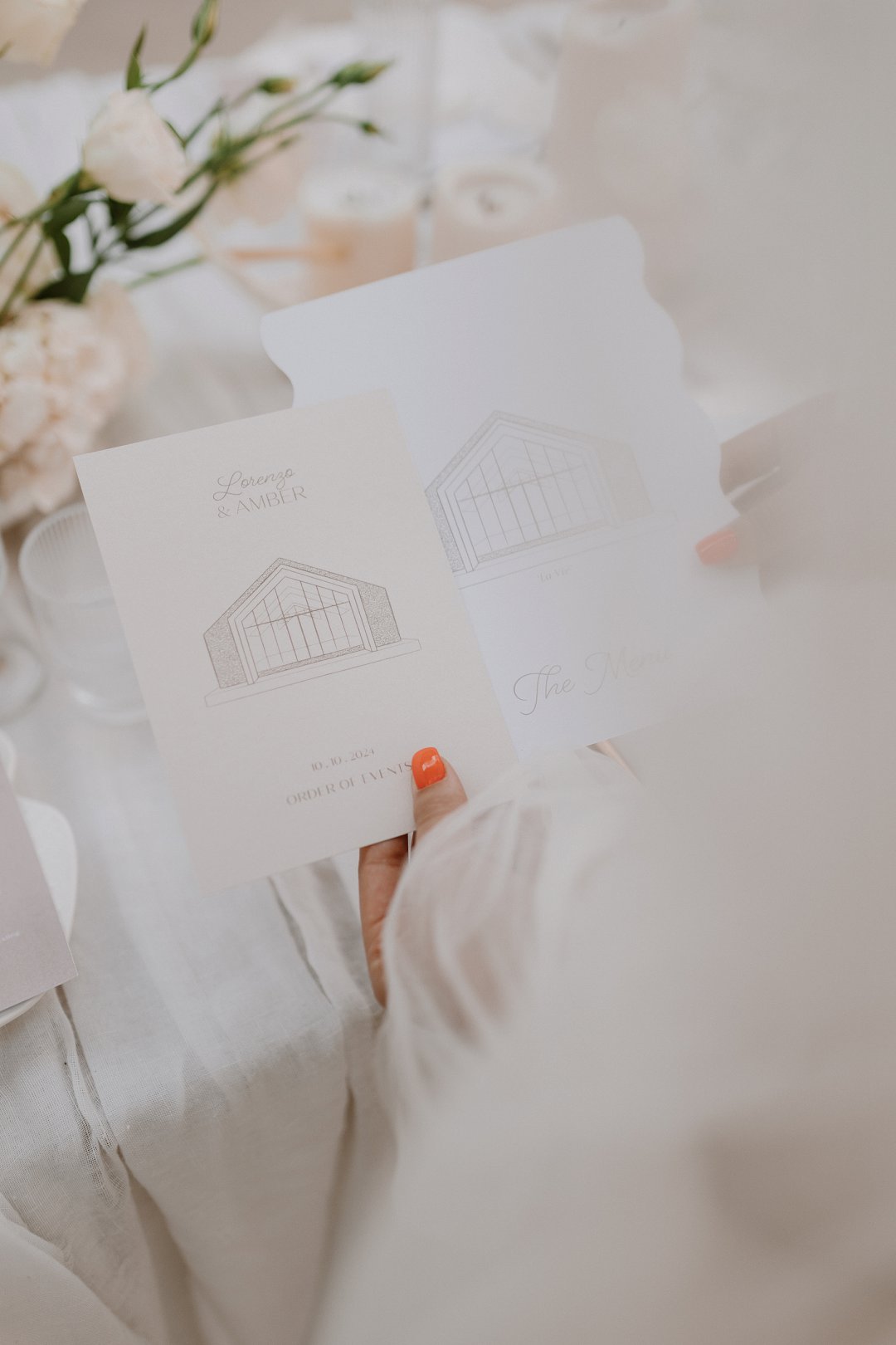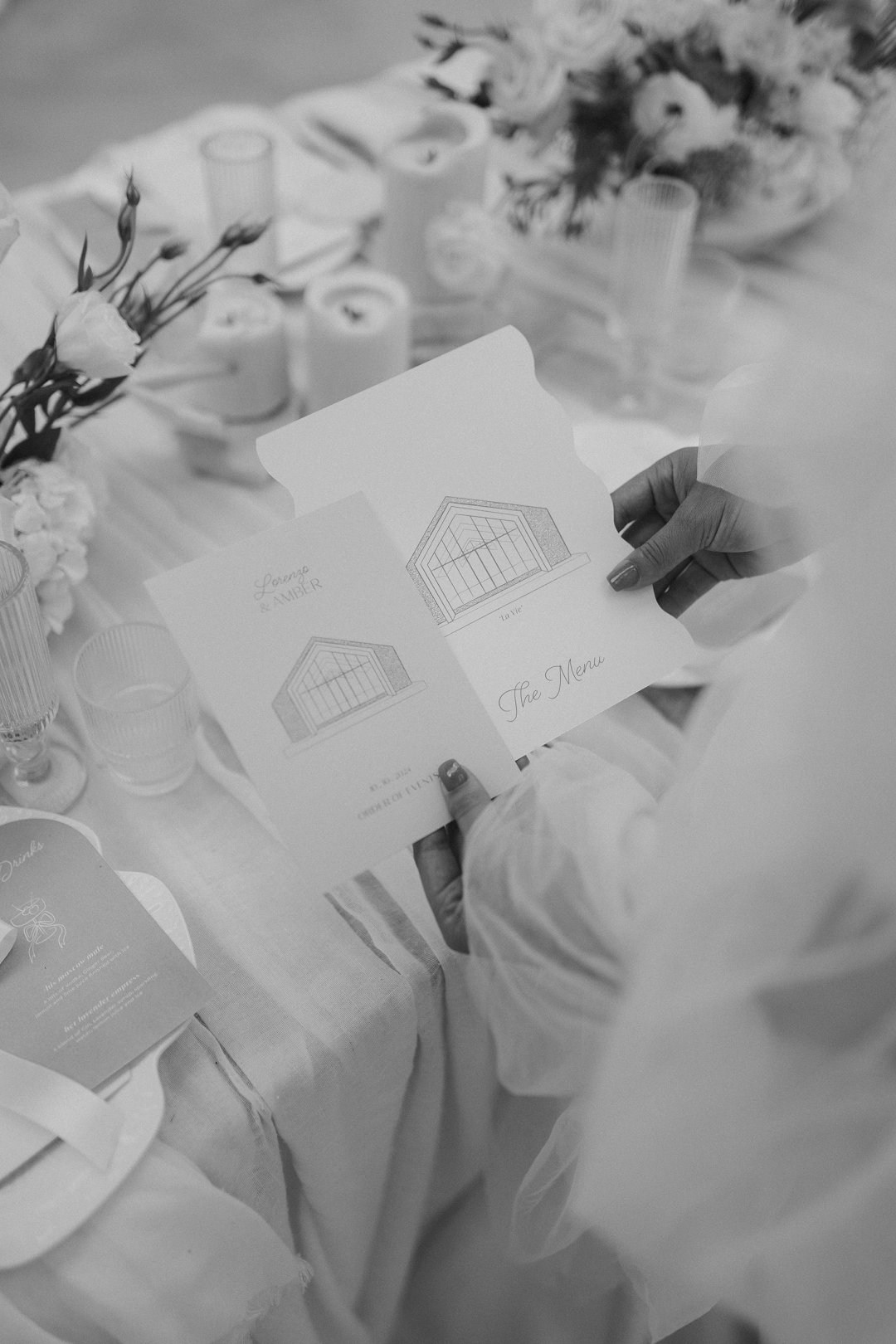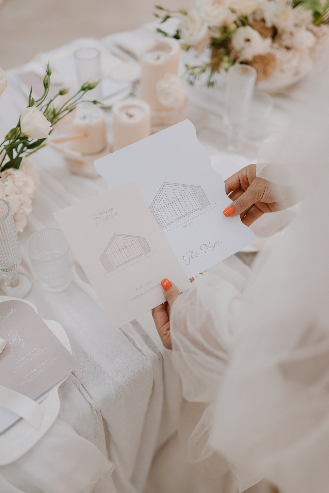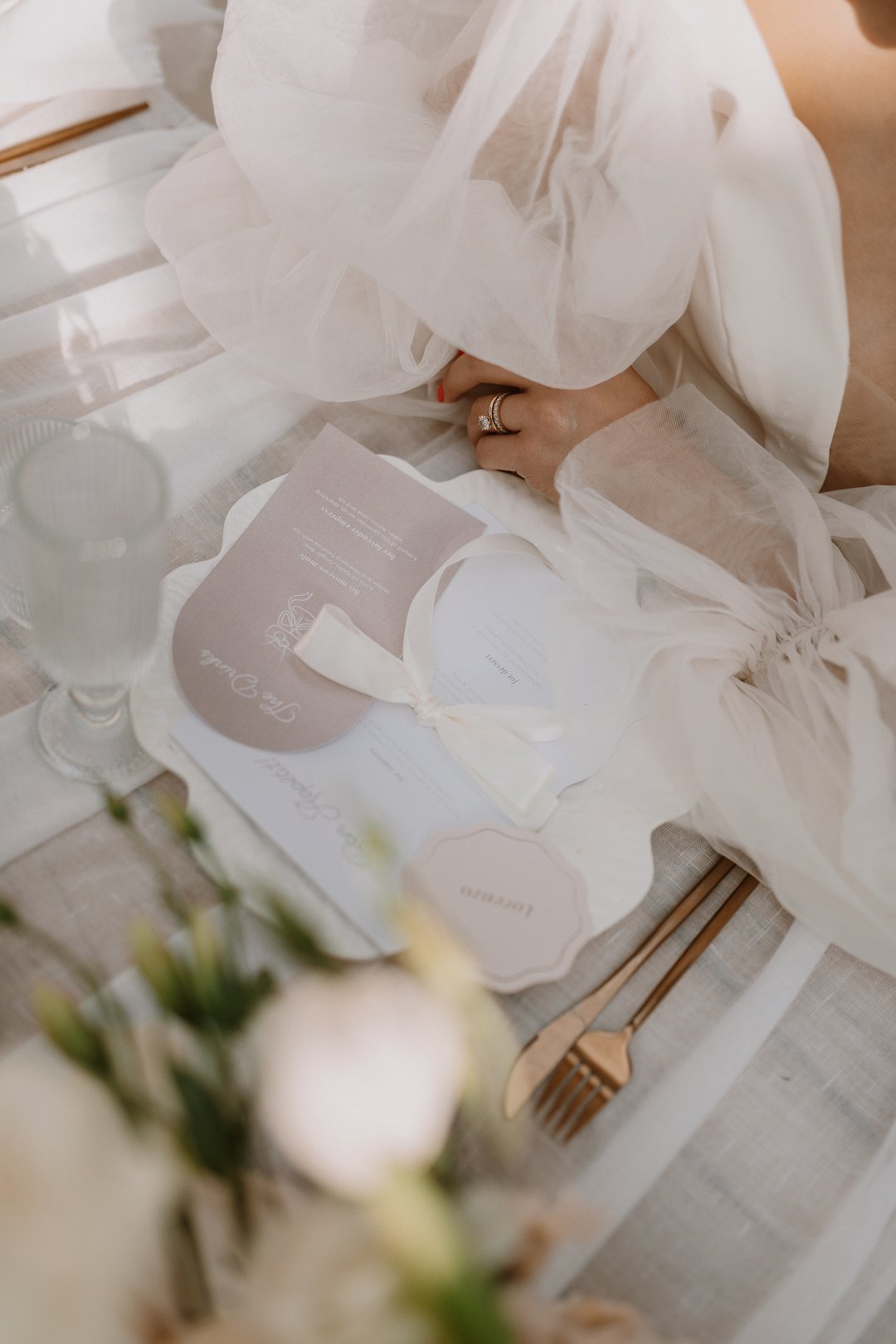 Skryfbehoeftes en plek instellings: Copper Grey Studio se minimalistiese plek kaartjies en spyskaarte, met elegante lettertipes op hoë kwaliteit papier, het ’n persoonlike aanslag bygevoeg en die tafeldekor verfyn.