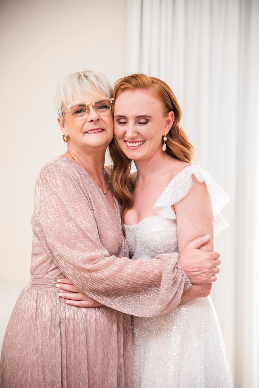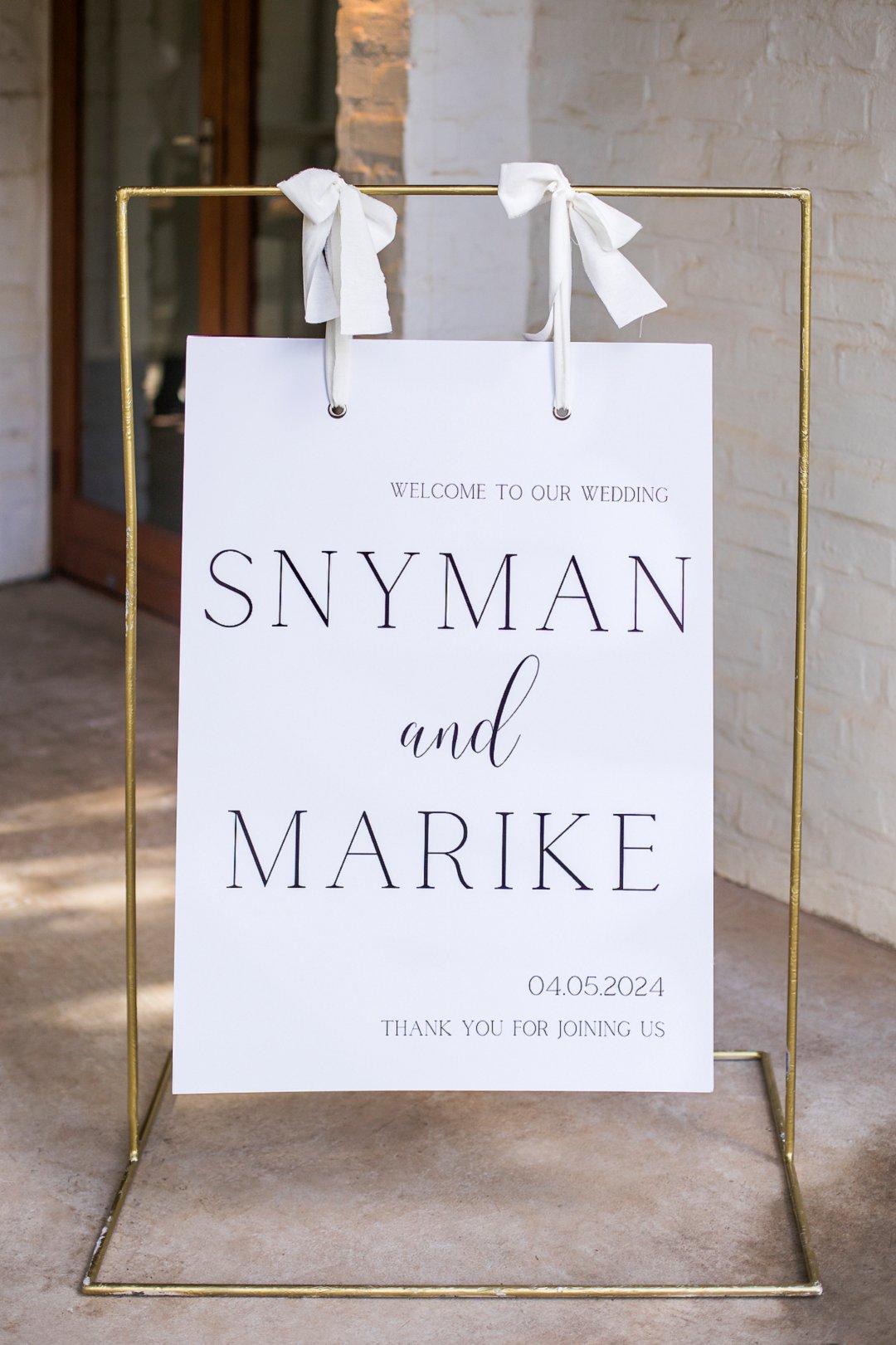 Marike het só mooi gelyk in haar baie stylvolle trourok. Ons is mal oor die wit krale detail op die trourok en die fyner detail van die trourok. Die mou gedeelte van haar trourok is vir ons besonders mooi, omrede dit beide die skouer kan toe hou of mooi los hang en die skouers oop hê. Dit is ‘n klassieke, maar tog ook so elegante voorkoms. Snyman het net so deftig gelyk in sy grys pak met tikseltjies bruin elemente soos die belt, das en skoene.