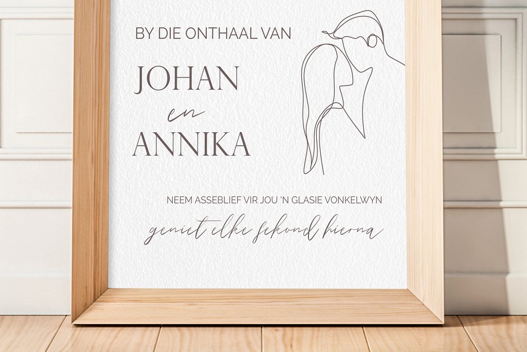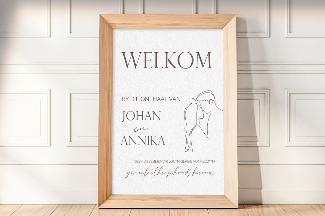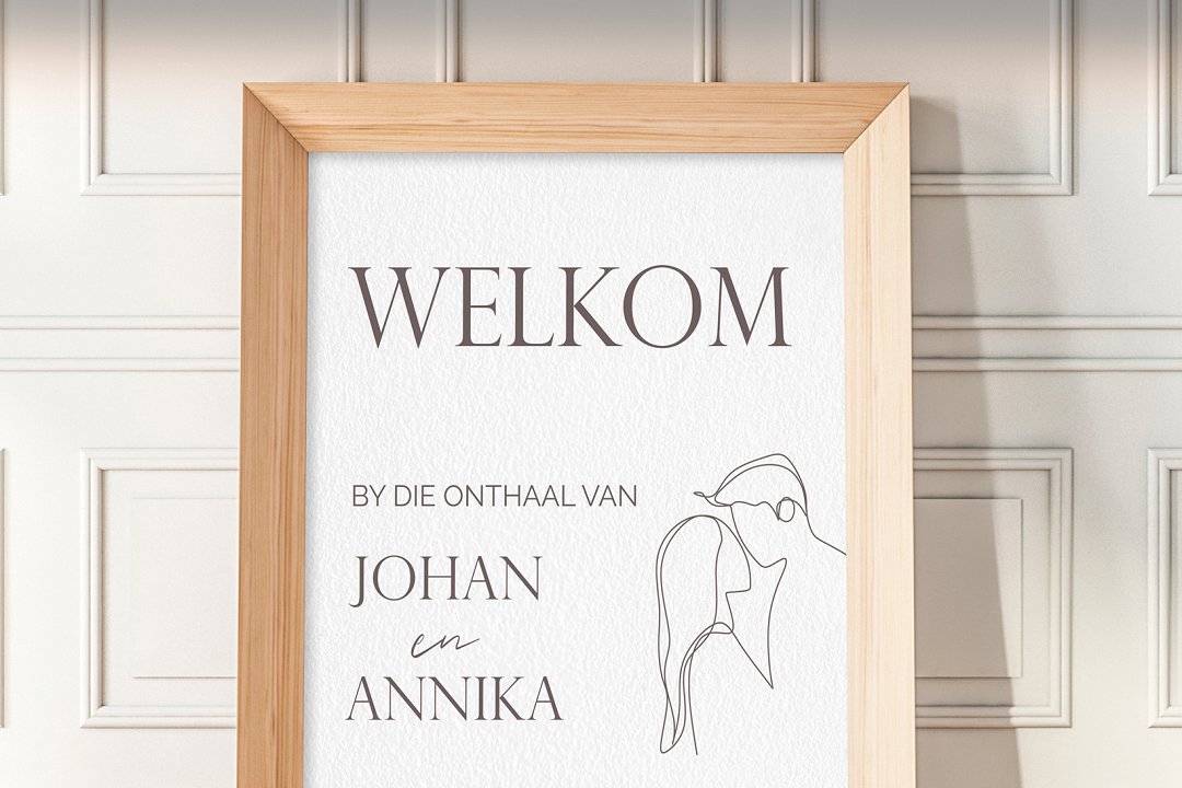 Die Simplistiese Welkomsbord by die Onthaal Plakkaat is ʼn eenvoudige, maar stylvolle ontwerp wat nie net tydloos is nie, maar ook visueel aantreklik. Dit spog met skoon lyne en ʼn fyn lyn-illustrasie van die paartjie se silhoeëtte. Die verskillende teks tipes trek onmiddellik jou trougaste se aandag na die plakkaat.
