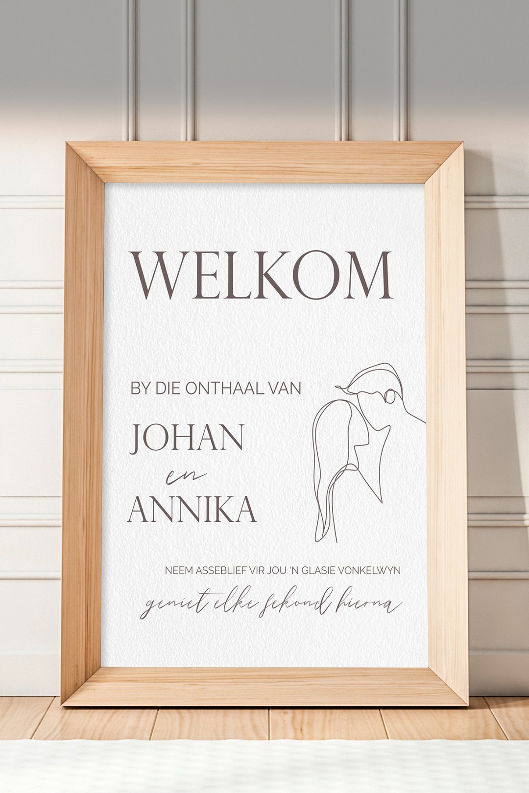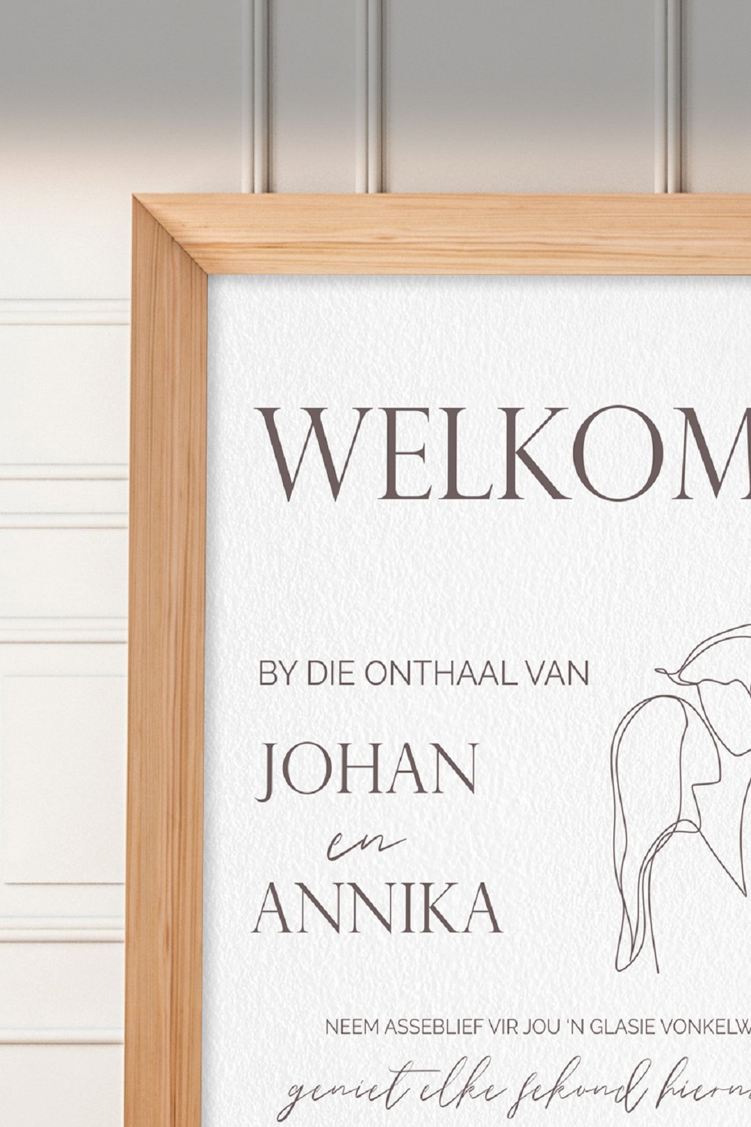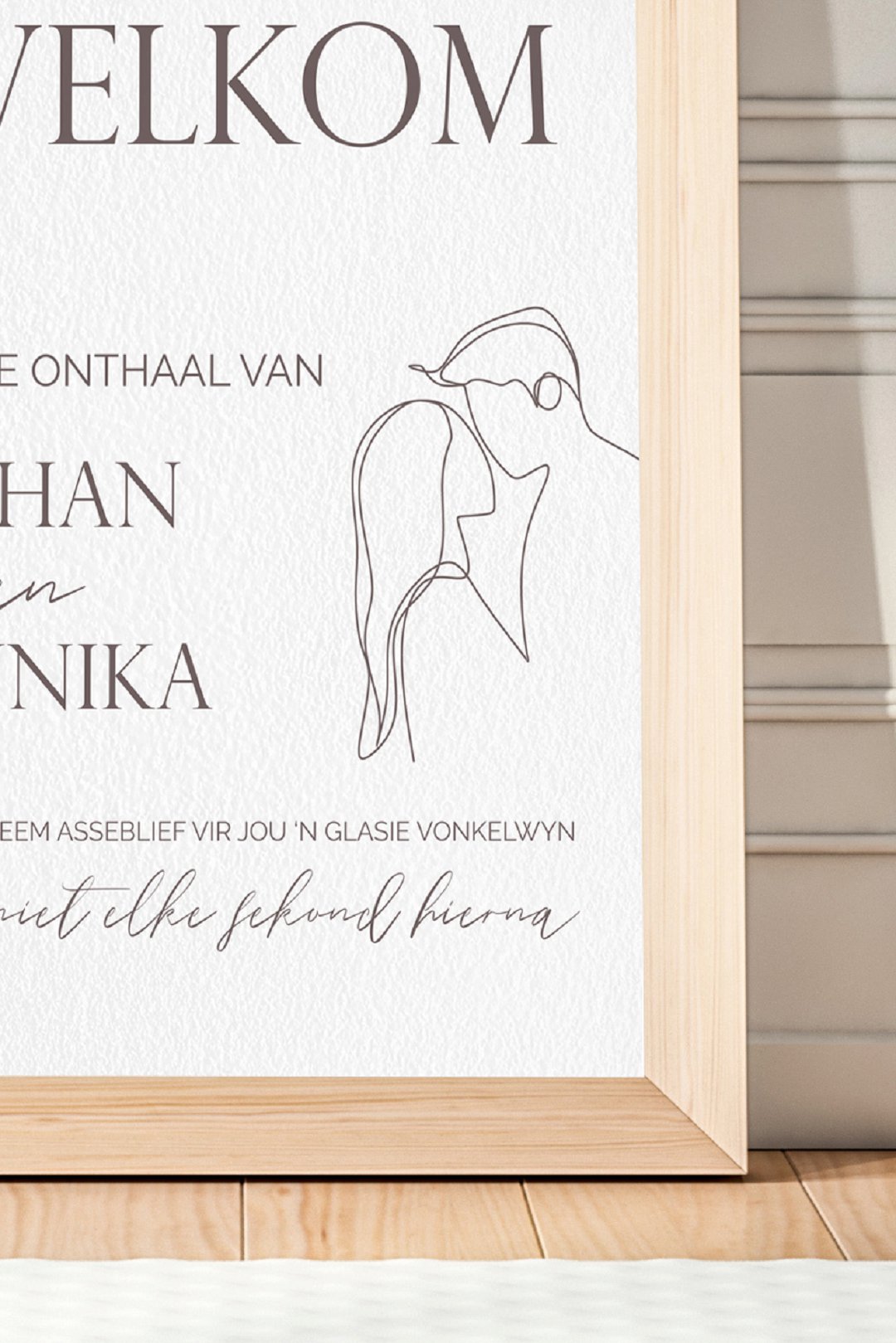 Vir paartjies wat opsoek is na ʼn eenvoudige ontwerp vir hul welkomsbord, is hierdie ʼn pragtige keuse. Die fyn illustrasie van die paartjie se silhoeët behou die bord se minimalistiese voorkoms, terwyl dit terselfdertyd ʼn persoonlike gevoel gee. Rol af om meer te sien.