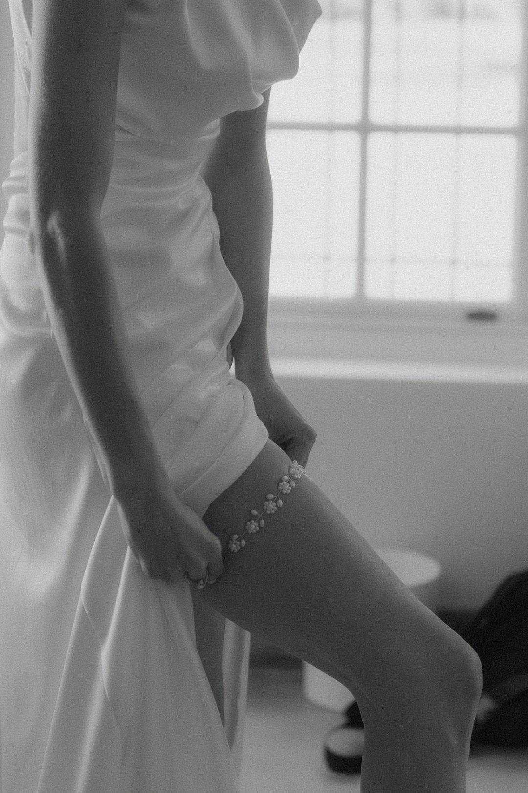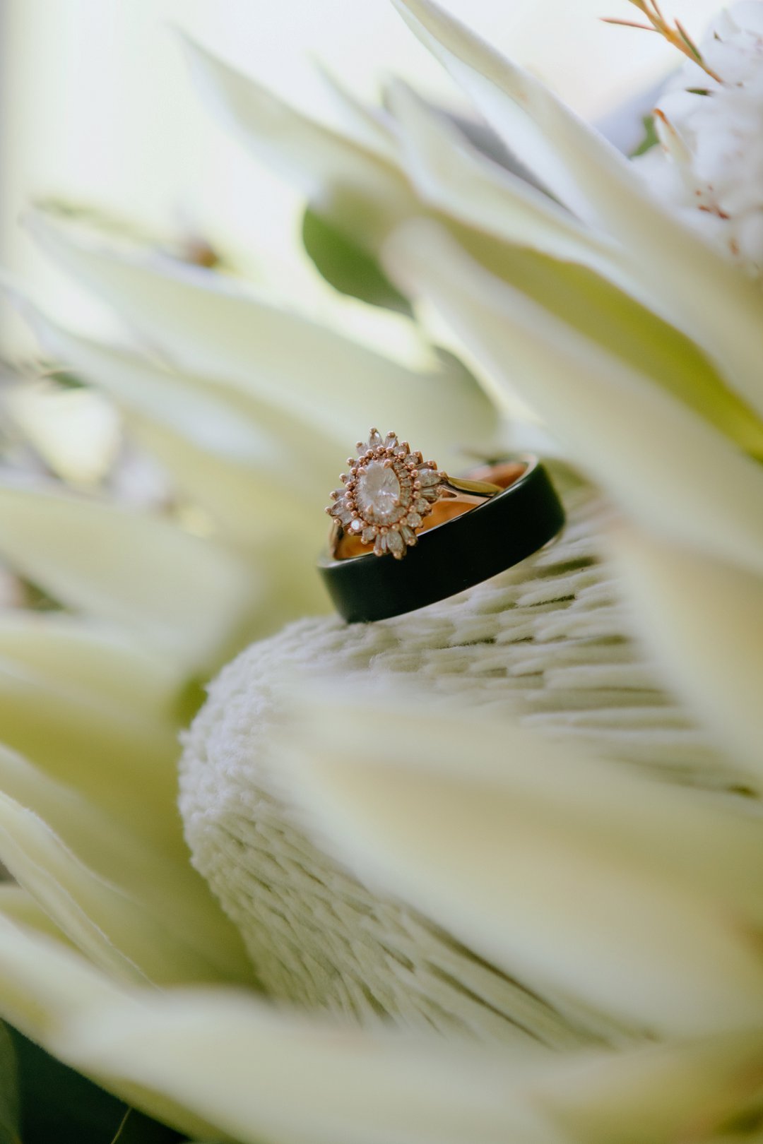 Ek (bruid) het besluit om net my verloofring te hou aangesien dit redelik kompleks is en het gevoel ʼn pant sal afbreek doen aan die ontwerp. Ek het ʼn roosgoud ring met ʼn 0.30 karaat ovaalvormige diamant in die middel, omring met kleiner ronde diamantjies, ongeveer 0.49 karaat, in ʼn stralekrans vorm en aan die buitekant is daar ʼn verskeidenheid van ronde en diamantvormige diamante wat uitstraal na buite. Dit is ʼn moderne ring met ʼn vintage gevoel. Dameon het dit spesiaal laat ontwerp deur ʼn juwelier in Johannesburg. As ʼn mens die ring van die kant af bekyk, lyk dit amper soos ʼn protea en as mens na die geheelbeeld kyk is my ring in ʼn diamant vorm.