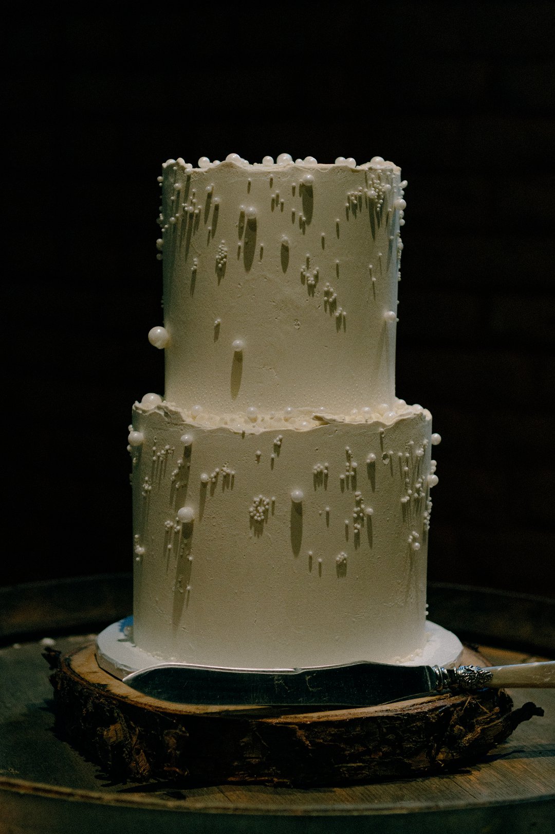 Die paartjie se twee laag troukoek het die pêrel tema voortgedra, met delikate pêrel afwerkings wat subtiele elegansie bygevoeg het. Die mes wat gebruik is om die koek te sny, het ’n spesiale betekenis gehad, waaroor jy hieronder meer kan lees.