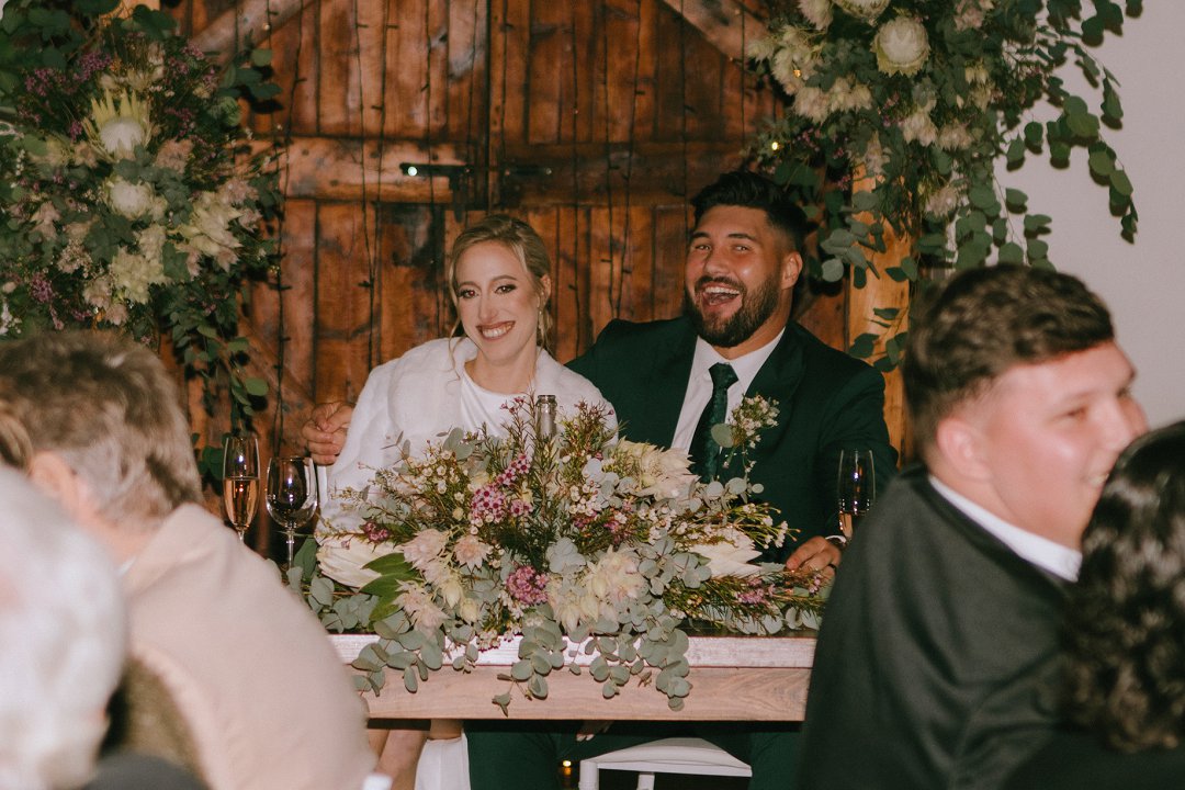 By die onthaal het twee lang tafels die lokaal gevul, met die bruidstafel as middelpunt waar die paartjie apart gesit het. Wit Tiffany-stoele het ’n mooi kontras gevorm teen die houttafels, baksteen mure en donker dakbalke. Die tafels was pragtig gedek met smaraggroen skakerings en wit blomme. Kerse wat tussen die groenigheid geskitter het, het ’n romantiese atmosfeer geskep. Groenigheid bly altyd ’n uitstekende keuse vir troudekor – dit val mooi op en skep ’n sagte, elegante voorkoms.