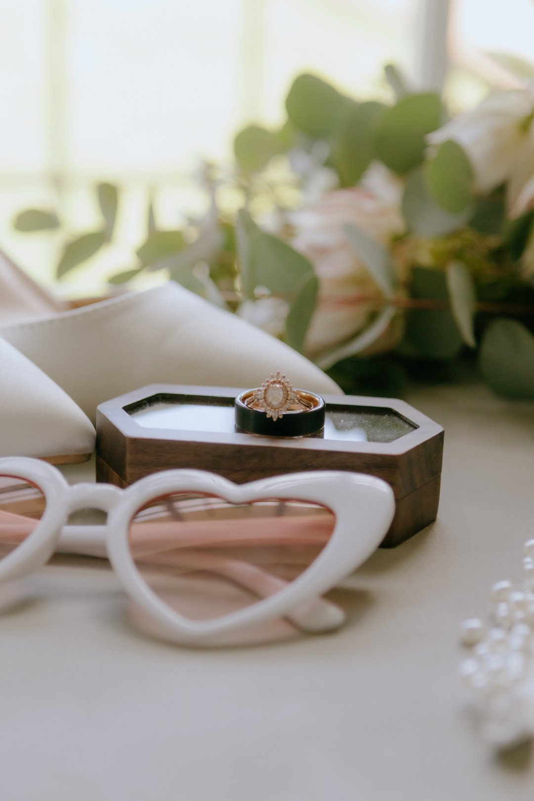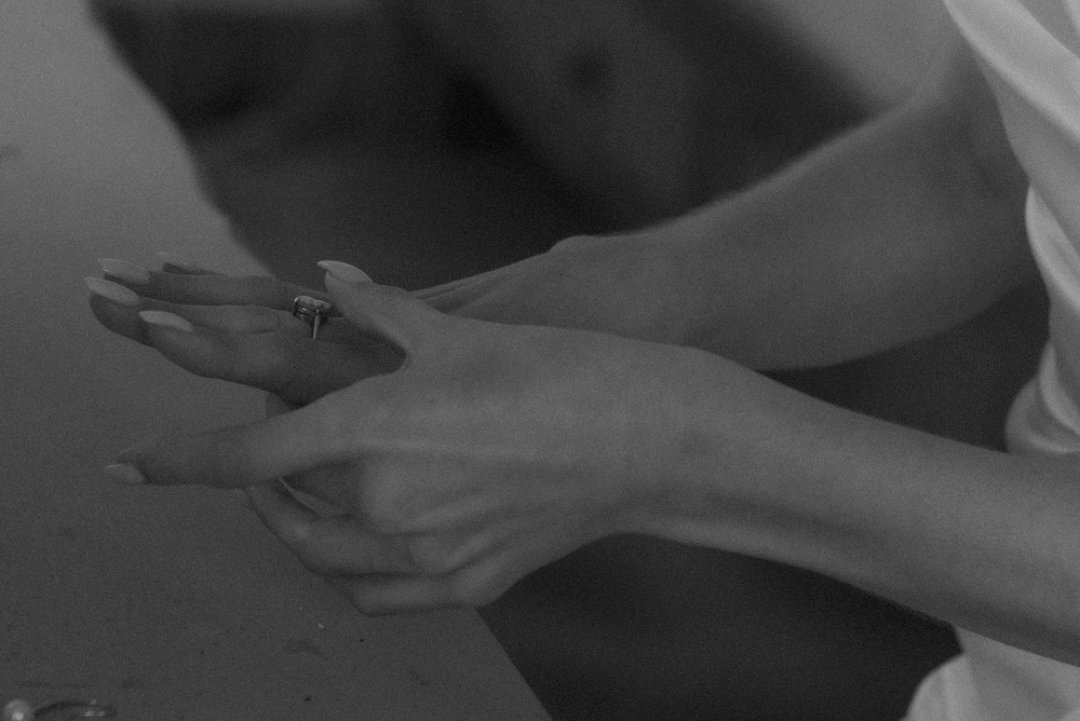 Ek (bruid) het besluit om net my verloofring te hou aangesien dit redelik kompleks is en het gevoel ʼn pant sal afbreek doen aan die ontwerp. Ek het ʼn roosgoud ring met ʼn 0.30 karaat ovaalvormige diamant in die middel, omring met kleiner ronde diamantjies, ongeveer 0.49 karaat, in ʼn stralekrans vorm en aan die buitekant is daar ʼn verskeidenheid van ronde en diamantvormige diamante wat uitstraal na buite. Dit is ʼn moderne ring met ʼn vintage gevoel. Dameon het dit spesiaal laat ontwerp deur ʼn juwelier in Johannesburg. As ʼn mens die ring van die kant af bekyk, lyk dit amper soos ʼn protea en as mens na die geheelbeeld kyk is my ring in ʼn diamant vorm.
