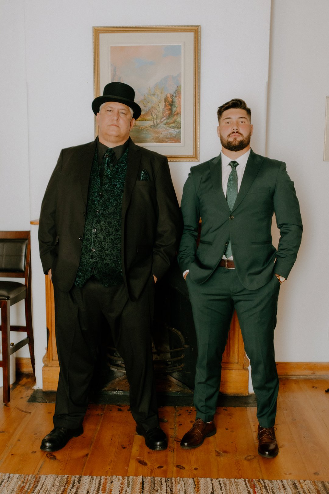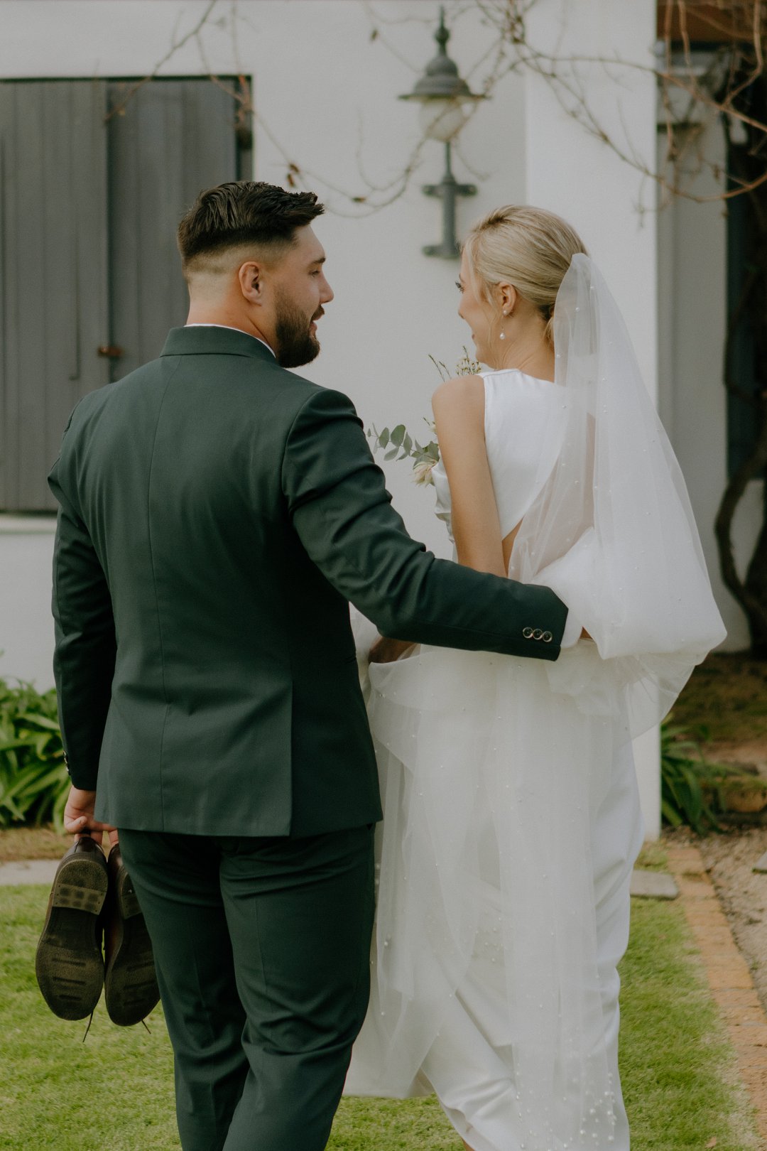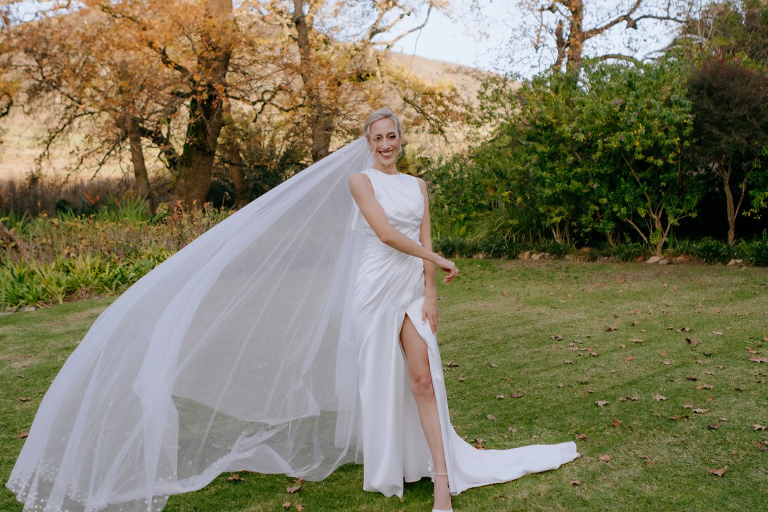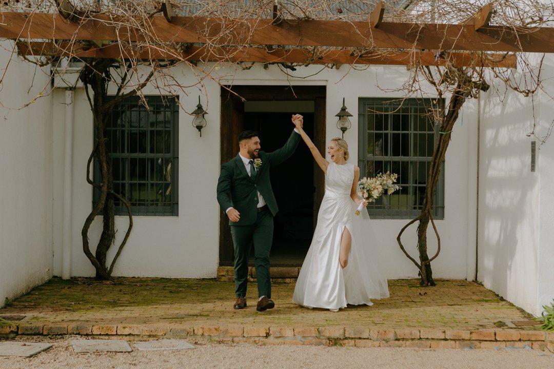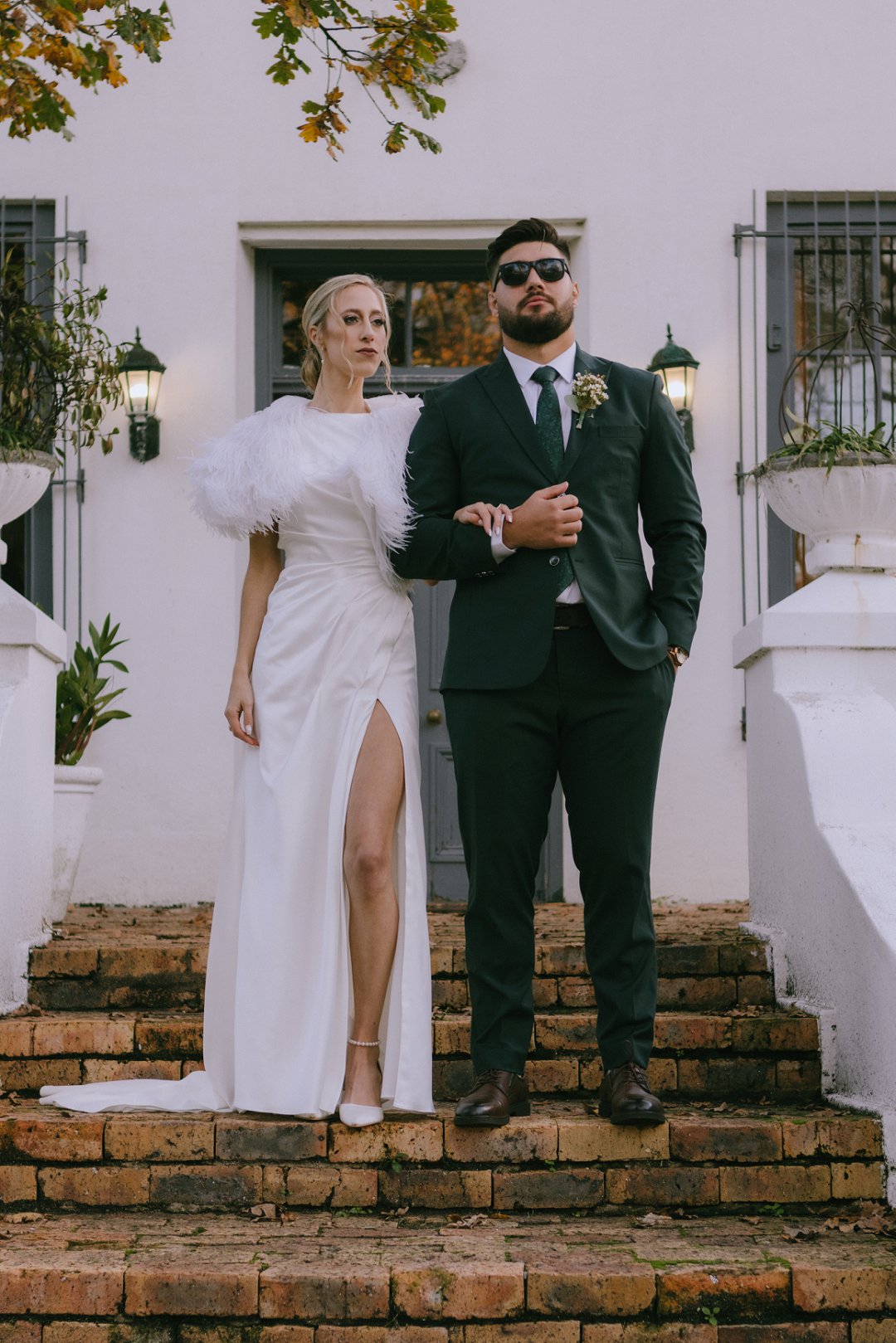 Jana het asemrowend gelyk in haar trourok met ’n simplistiese voorkoms, perfek vir die paartjie se pragtige dag. Haar sluier was versier met fyn pêrel afwerking, wat besonderse detail by haar rok gevoeg het. Dameon het stylvol gelyk in sy groen troupak – ’n unieke kleur wat besonder goed werk vir bruidegoms drag.