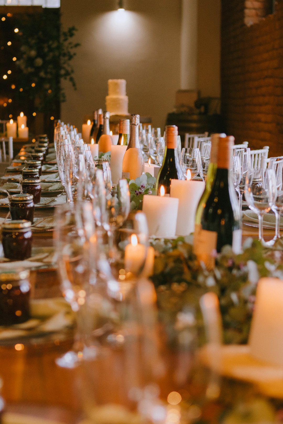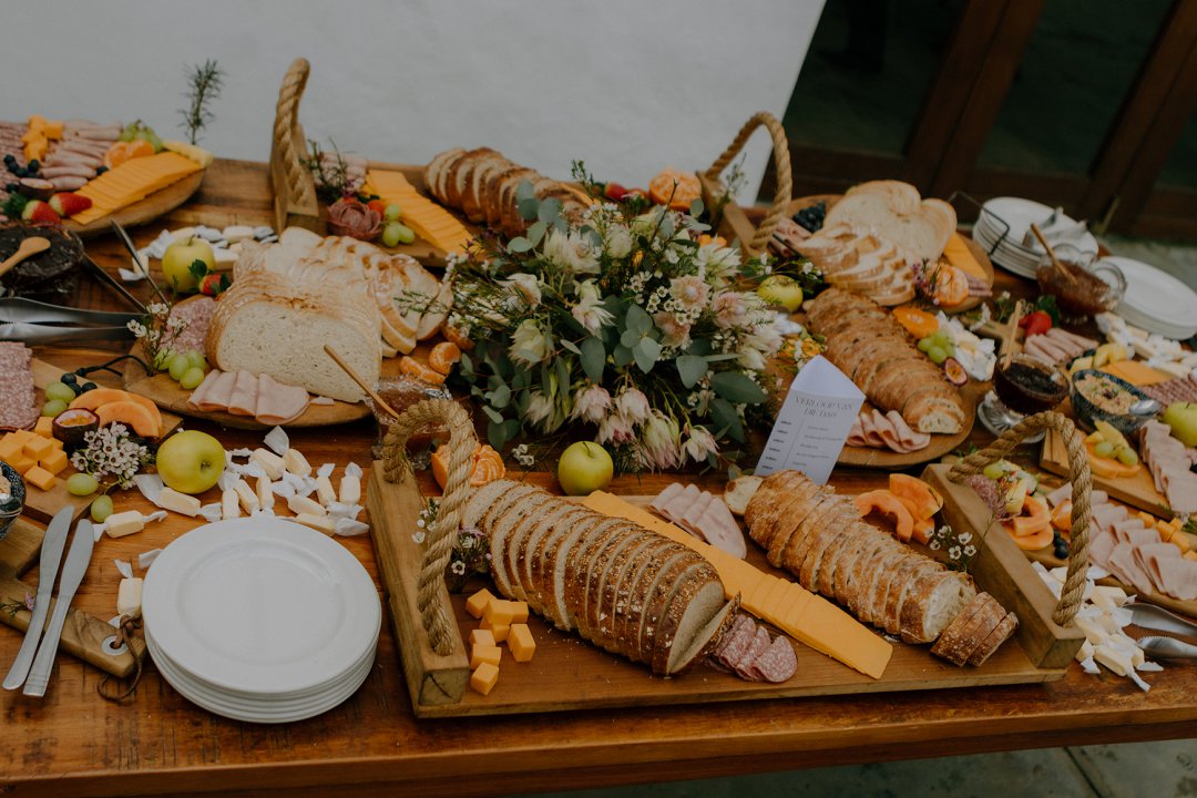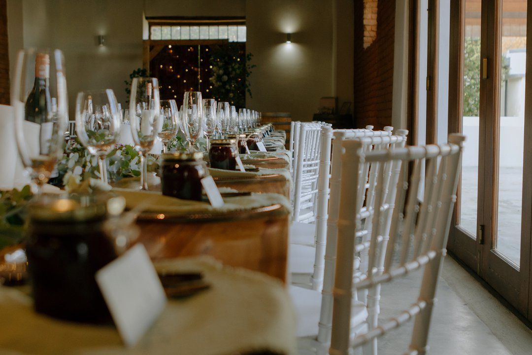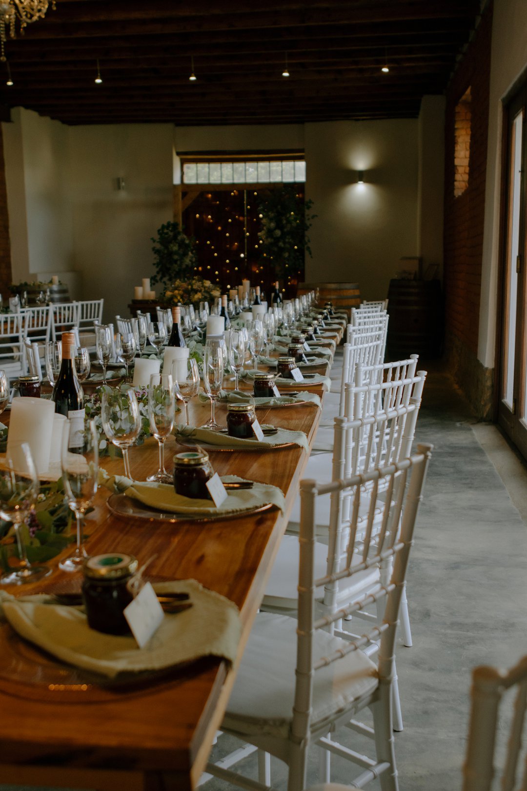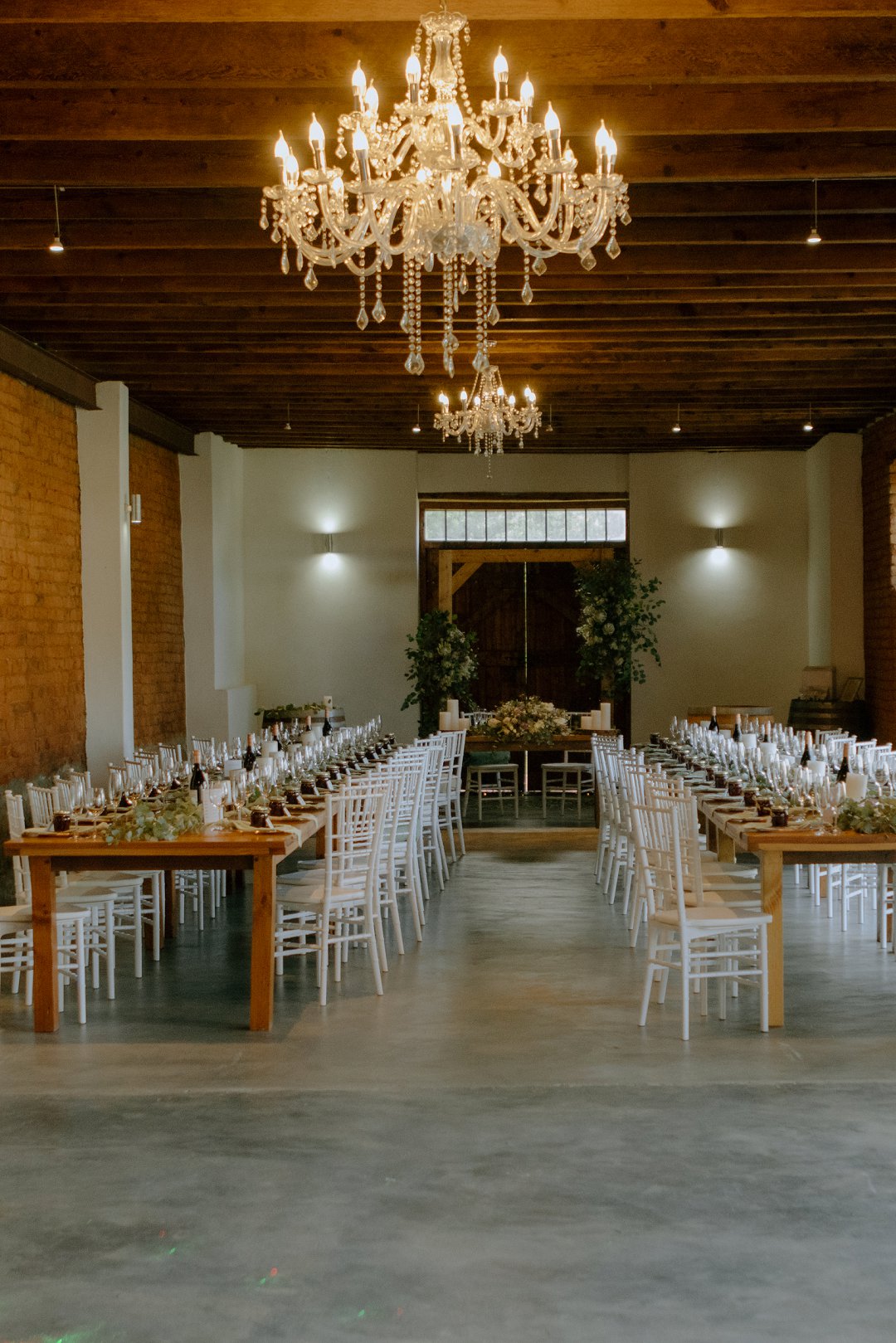By die onthaal het twee lang tafels die lokaal gevul, met die bruidstafel as middelpunt waar die paartjie apart gesit het. Wit Tiffany-stoele het ’n mooi kontras gevorm teen die houttafels, baksteen mure en donker dakbalke. Die tafels was pragtig gedek met smaraggroen skakerings en wit blomme. Kerse wat tussen die groenigheid geskitter het, het ’n romantiese atmosfeer geskep. Groenigheid bly altyd ’n uitstekende keuse vir troudekor – dit val mooi op en skep ’n sagte, elegante voorkoms.