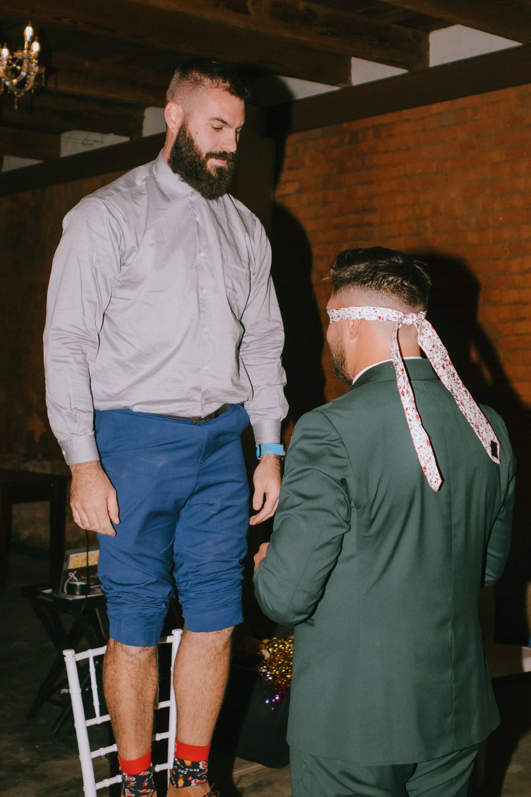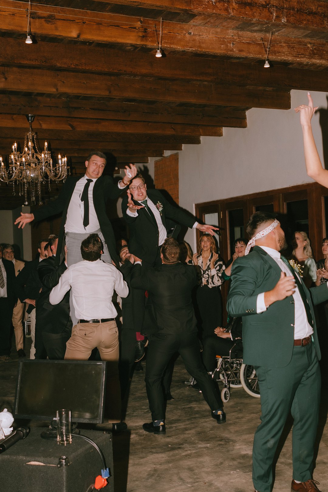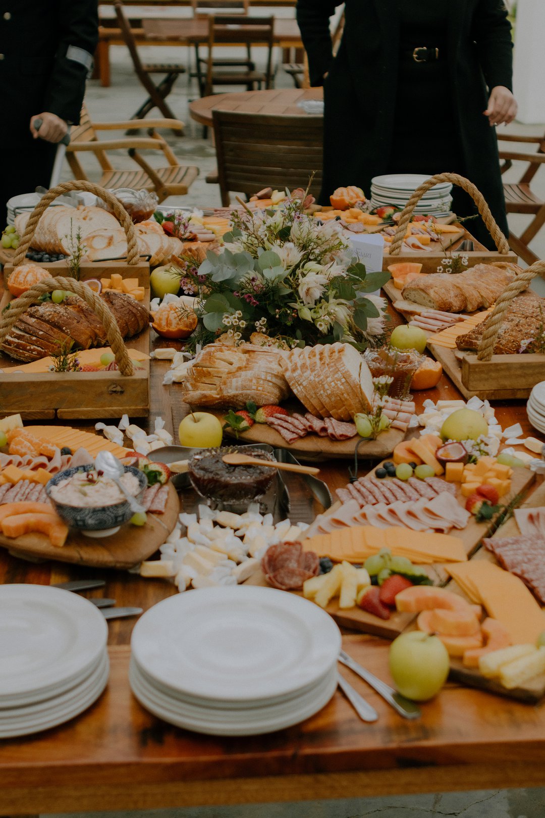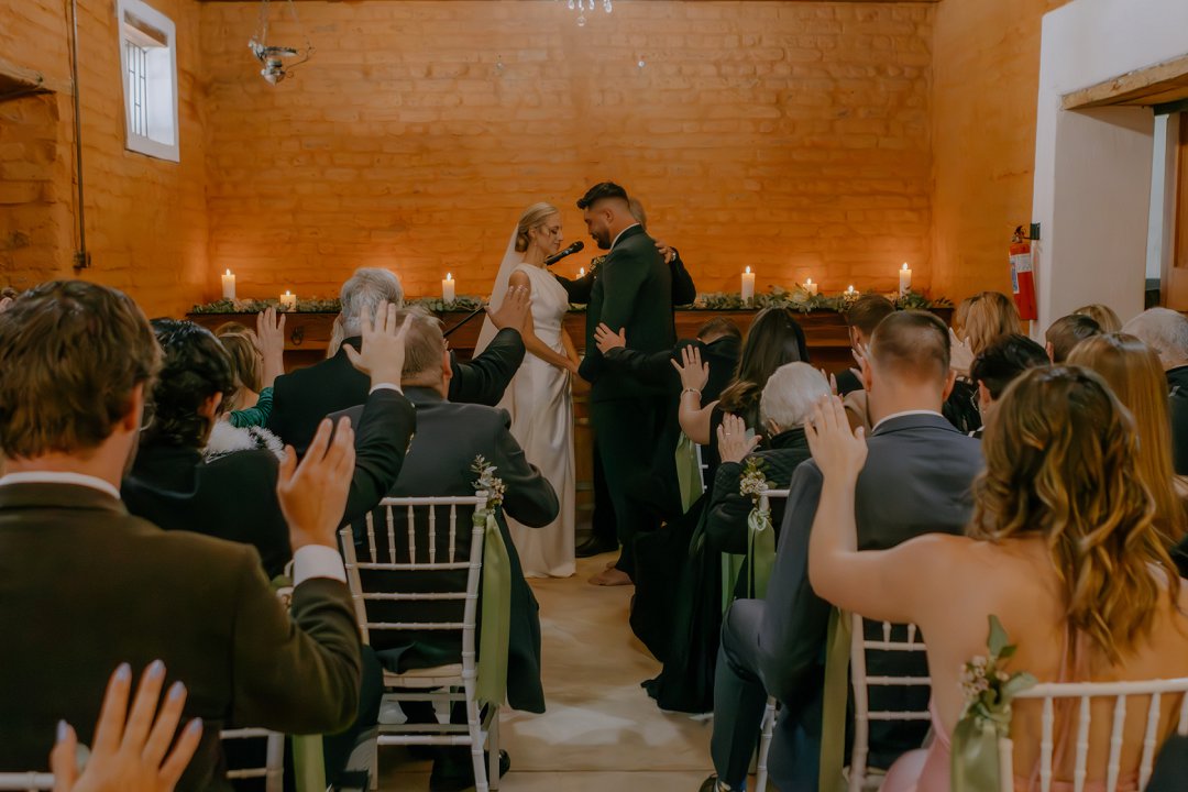 By die onthaal het twee lang tafels die lokaal gevul, met die bruidstafel as middelpunt waar die paartjie apart gesit het. Wit Tiffany-stoele het ’n mooi kontras gevorm teen die houttafels, baksteen mure en donker dakbalke. Die tafels was pragtig gedek met smaraggroen skakerings en wit blomme. Kerse wat tussen die groenigheid geskitter het, het ’n romantiese atmosfeer geskep. Groenigheid bly altyd ’n uitstekende keuse vir troudekor – dit val mooi op en skep ’n sagte, elegante voorkoms.