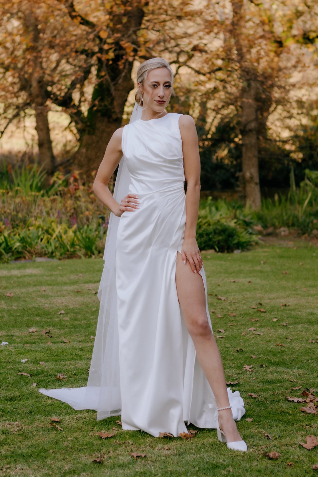 My rok is van “crispy crepe” satyn gemaak en het ʼn nousluitende silhoeët. Die hoë neklyn word omraam deur ʼn asimmetriese drapering wat vanaf die regter skouer diagonaal oor die bolyf verloop tot in die linkersy. Vandaar sprei dit uit oor die heuplyn tot by die hoë slip. Die lae rug eggo die sagte sleep van die rok. Die klasieke lyne is ingevul met die vloeiende tekstuur van gedrapeerde satyn.