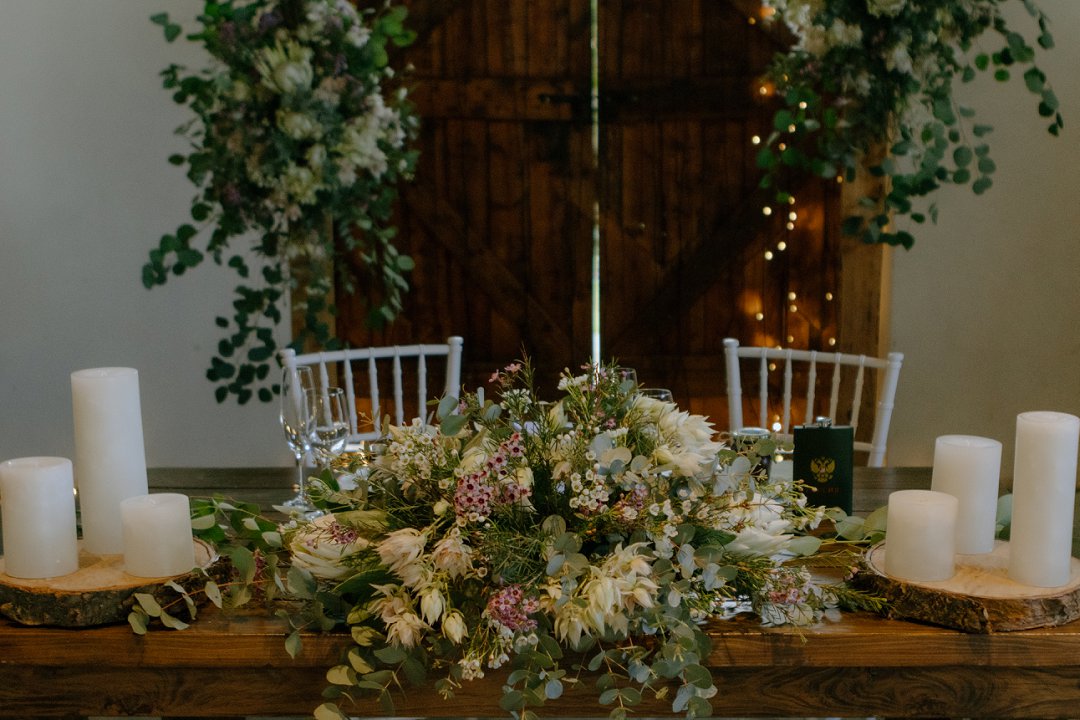 Die blomme was wit en pink wasblommetjies, wit/groen bergbruidjies en reuse wit proteas met bloekomblare om die sage kleur deur te trek. Die tafel se dekor was eenvoudig, tog besonders en treffend. Ons het twee lang gaste tafels gehad met bloekomblare, wit wasblommetjies en bergbruidjies in die middel af. Daar was ook ronde houtborde, met kerse op, tussen die blomme en blare geplaas om die tafels. Geen tafeldoeke was gebruik nie, net die hout van die tafels met die mooiste sagte wit tiffany stoele. Ons het ʼn aparte bruid- en bruidegom tafel gehad waarop dieselfde groenigheid, blomme en kerse was, met die verskil dat daar twee reuse wit proteas by was. Ons het die mooiste boog agter ons tafel gehad wat gevul was met ons troublomme en “warmwhite fairylights”.