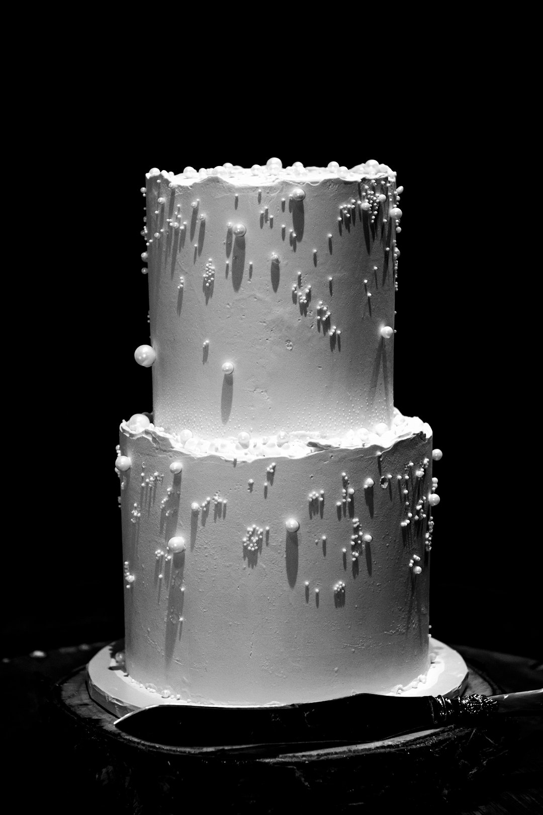 Die paartjie se twee laag troukoek het die pêrel tema voortgedra, met delikate pêrel afwerkings wat subtiele elegansie bygevoeg het. Die mes wat gebruik is om die koek te sny, het ’n spesiale betekenis gehad, waaroor jy hieronder meer kan lees.