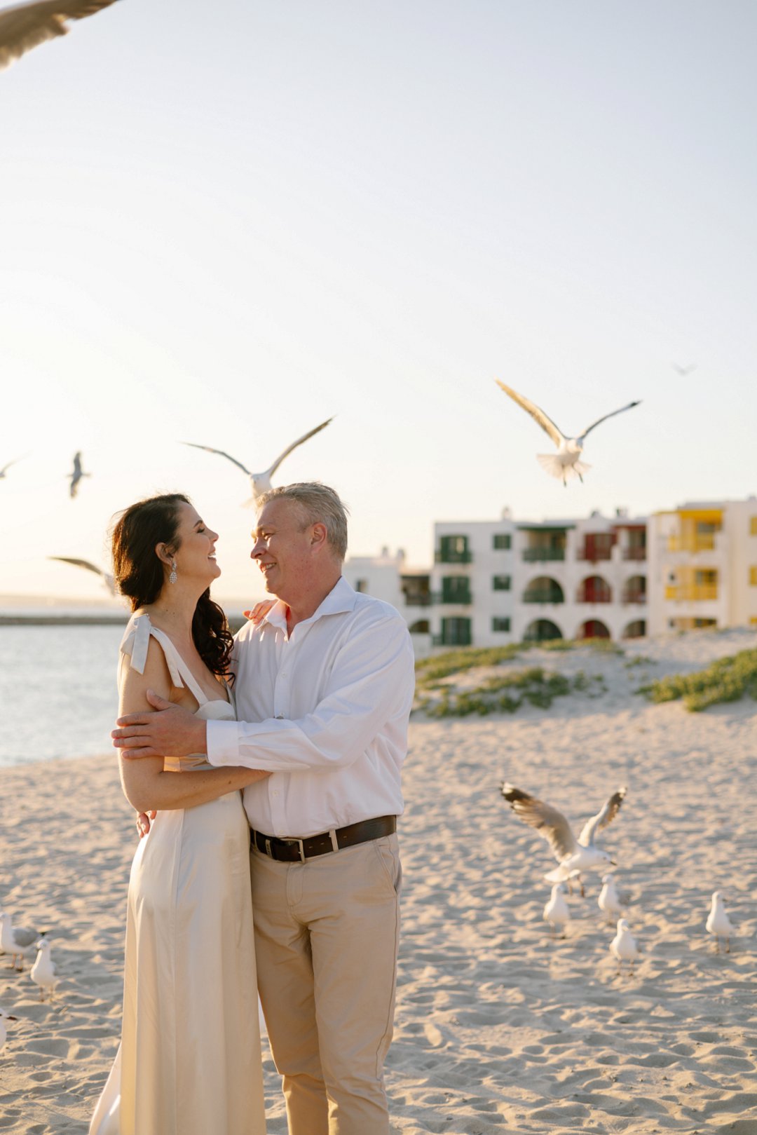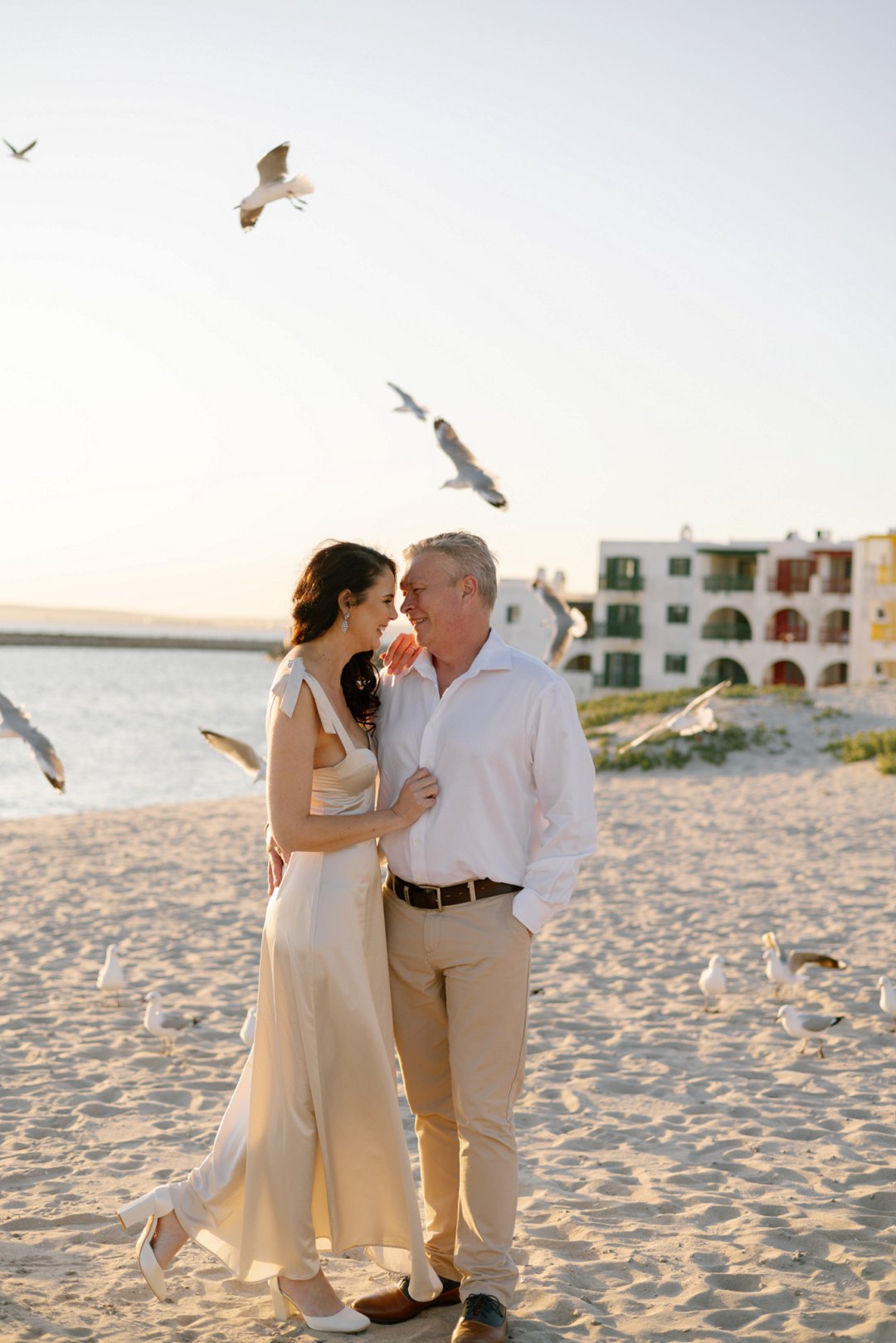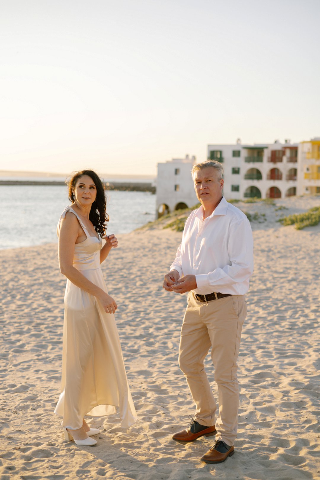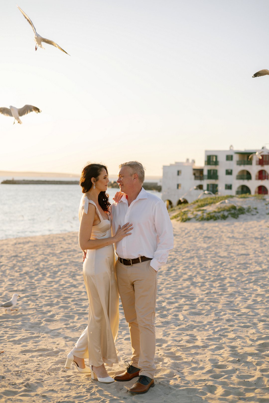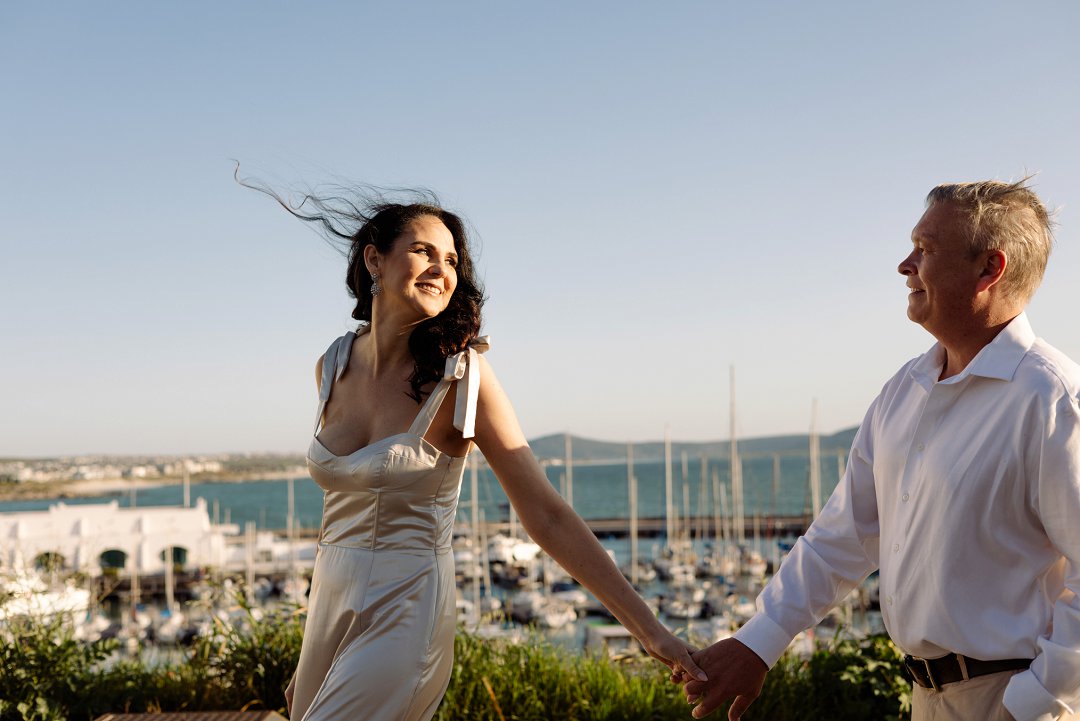 Hul het toe hul verlowing fotosessie gereël by ʼn bekende vakansieoord se strand in Langebaan gewees. Die wit huisies in die agtergrond met die kleurvolle venster rame en ook die bootjies in die agtergrond gee ʼn Mykonos in Griekeland gevoel aan die foto’s.