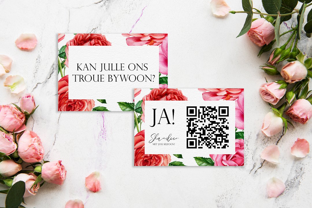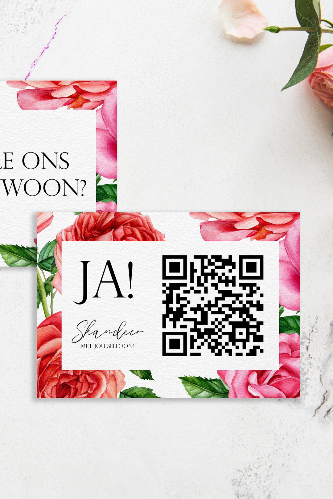 Die stylvolle RSVP-kaartjie is ideaal vir paartjies wat ʼn trou-webwerf het met ʼn aanlyn RSVP-opsie, waar gaste maklik kan bevestig of hulle die troue kan bywoon. Die kaartjie bevat ʼn unieke QR-kode wat gaste met hul selfone kan skandeer, wat hulle na ʼn skakel neem om hul bywoning te bevestig. Dit is ʼn maklike, papierlose opsie wat gaste toelaat om vinnig en sonder moeite te bevestig, sonder die gesukkel van ʼn pen soek. Aangesien die meeste mense selfone of tablette het, is hierdie aanlyn bevestiging ʼn uitstekende idee.