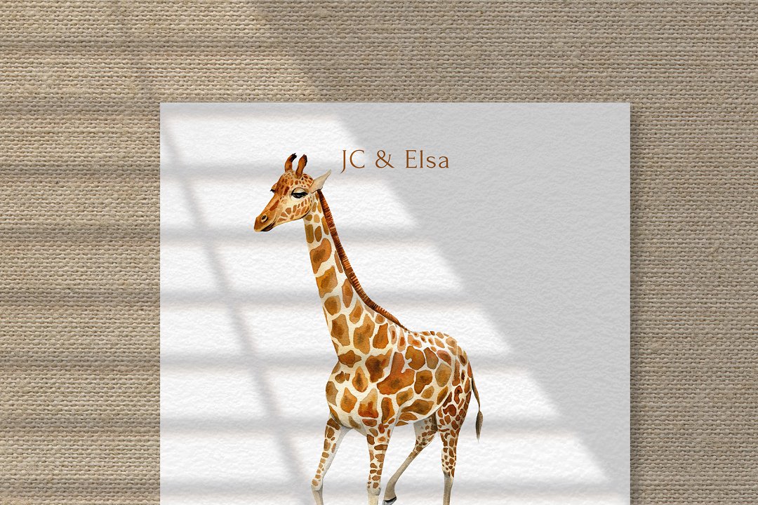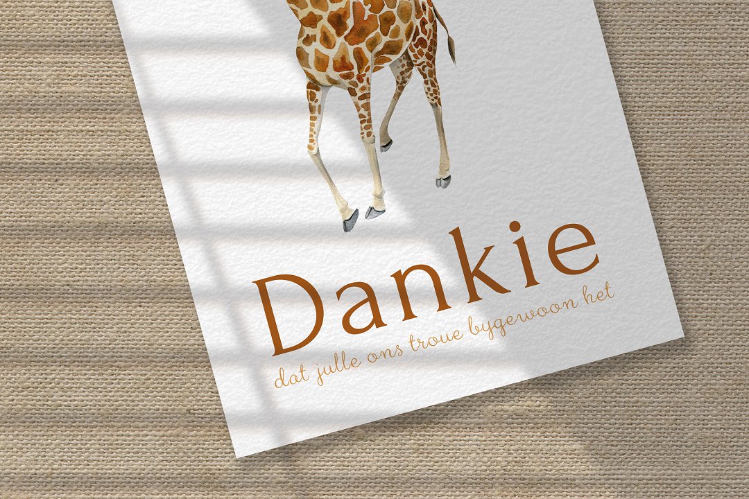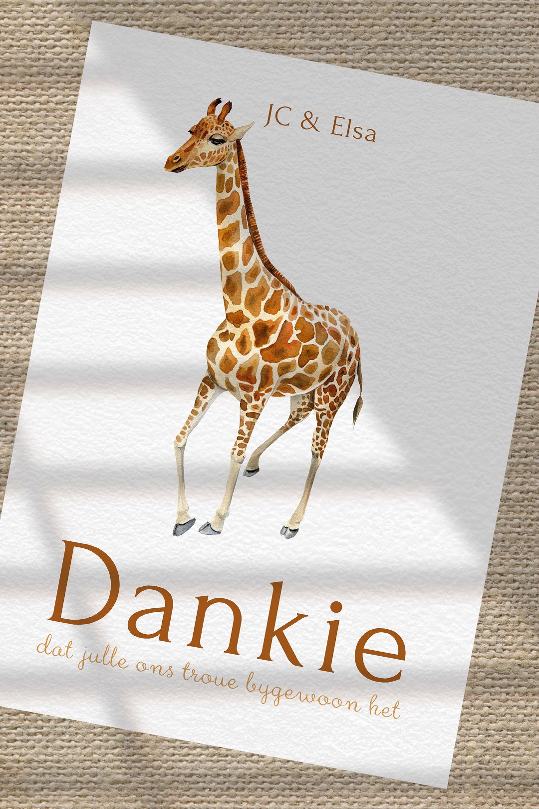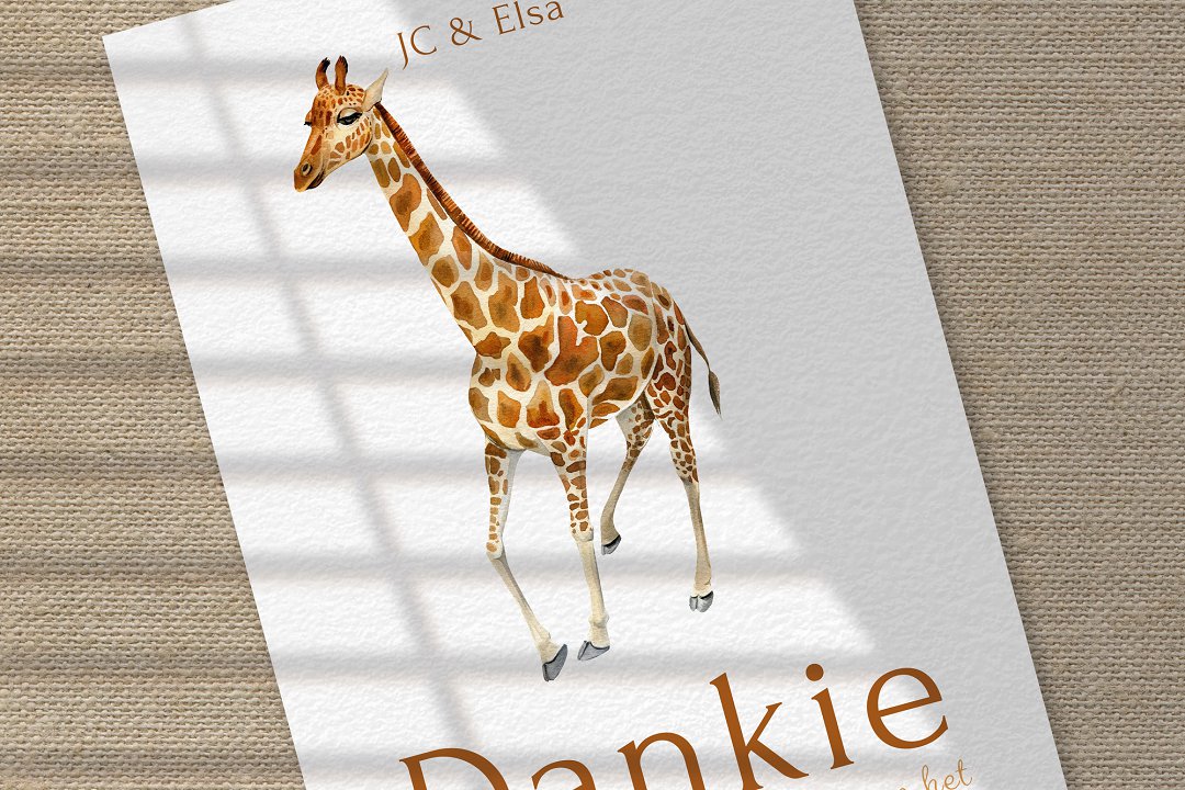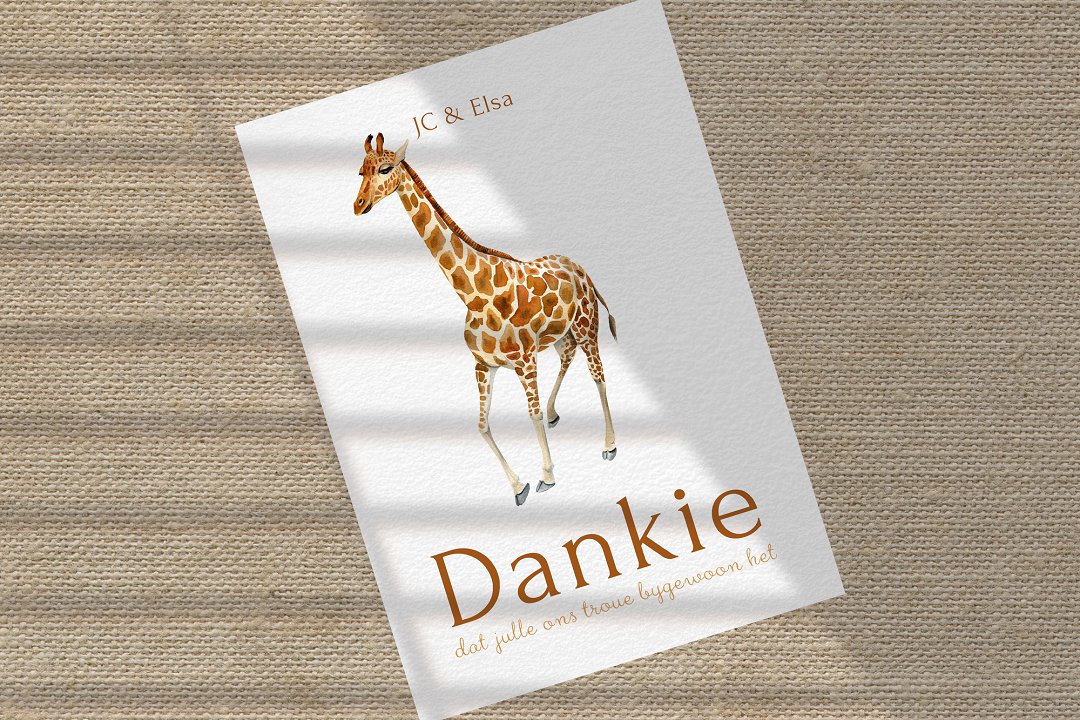 Die ontwerp is eenvoudig, maar steeds pragtig. ’n Waterverf-illustrasie, soos die oulike illustrasie van die kameelperd, kan gebruik word om ekstra detail by die kaartjie te voeg. Agterop die kaartjie kan julle ’n kort boodskap vir elke gas skryf as julle wil. Dit is ’n baie persoonlike en spesiale manier om dankie te sê vir elke gas.