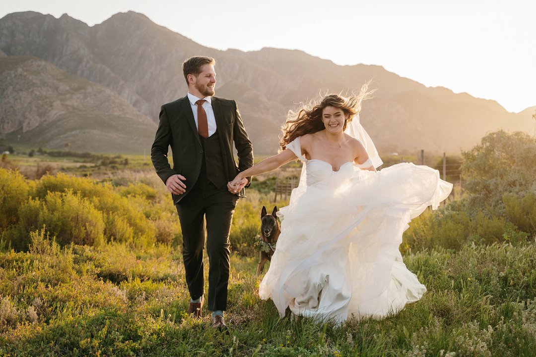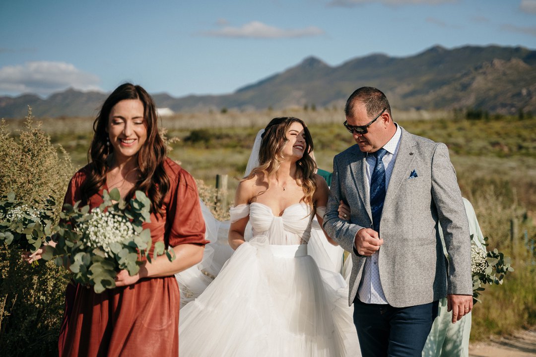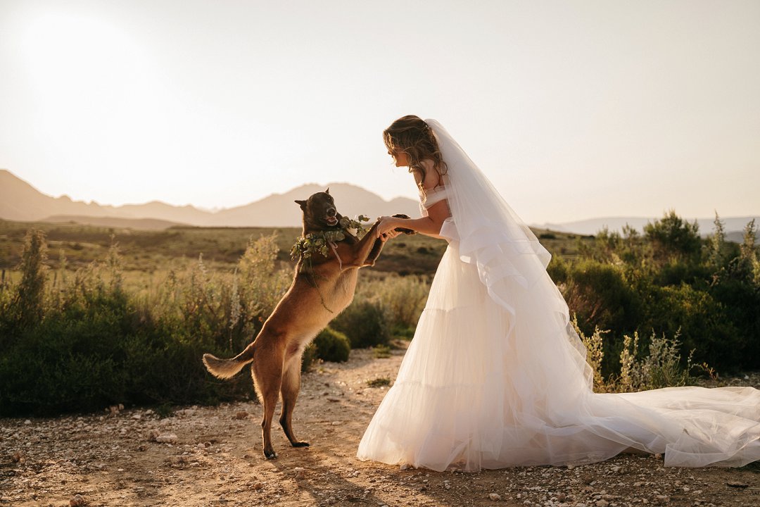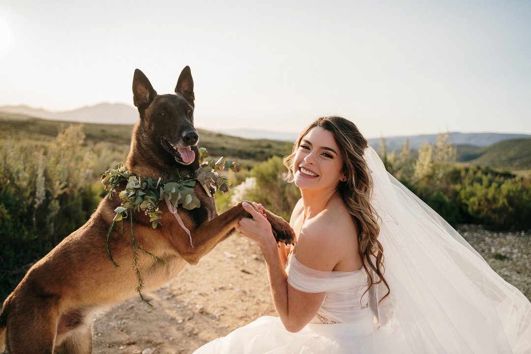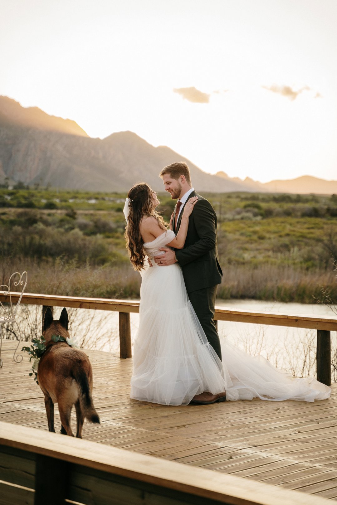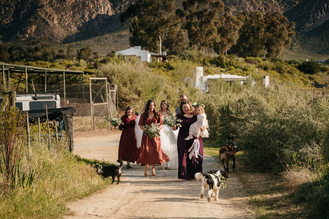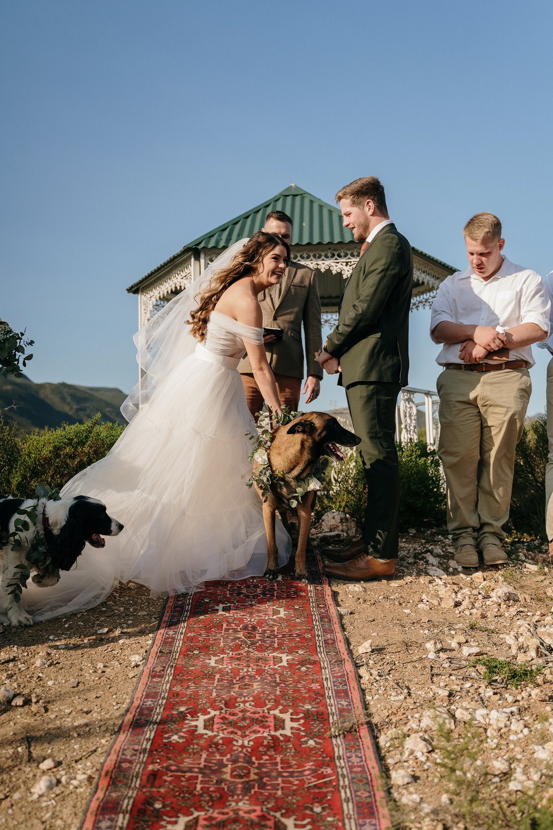 Ek het afgestap van die wittebroodsuite, wat teen die heuwel af was – ʼn loop van omtrent drie minute. Die gaste en my man het die hele tyd gekyk hoe ek die pad afstap, wat vir almal meer tyd gegee het om die oomblik werklik in te neem. Die berge het as die pragtige agtergrond gedien, en my hond en sy doggy cousins het opgewonde voor ons uitgehardloop met kranse om hul nekke, terwyl hulle uitbundig geblaf het.